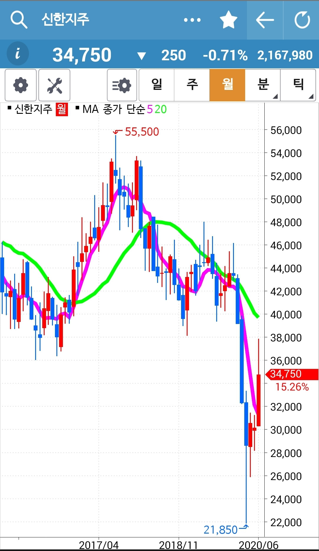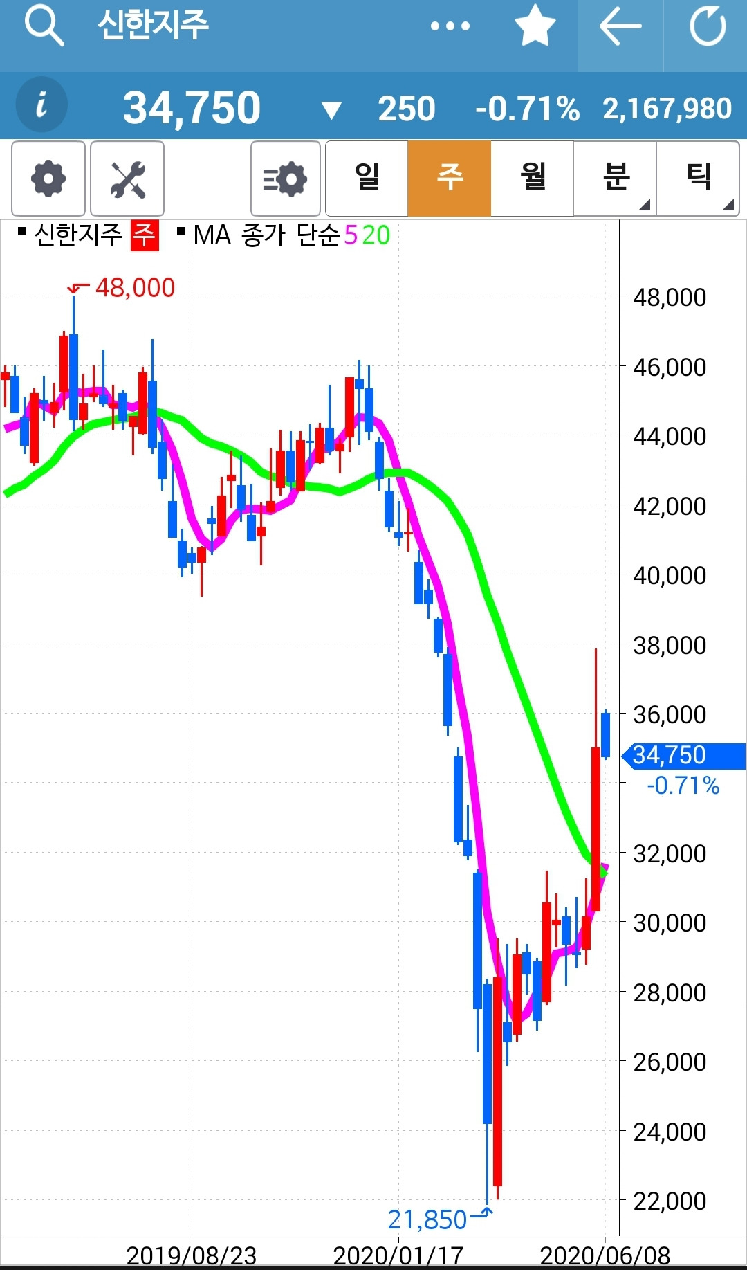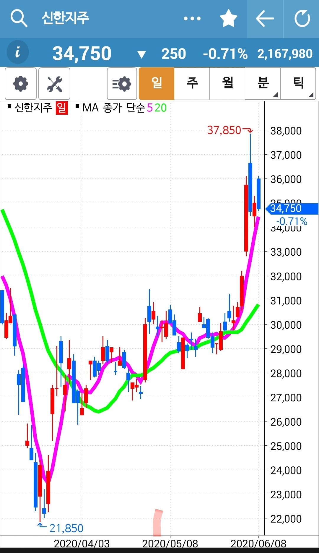 신한지주. 요것도 음봉. 그러나 5일선이 위에 있으니 오케이.