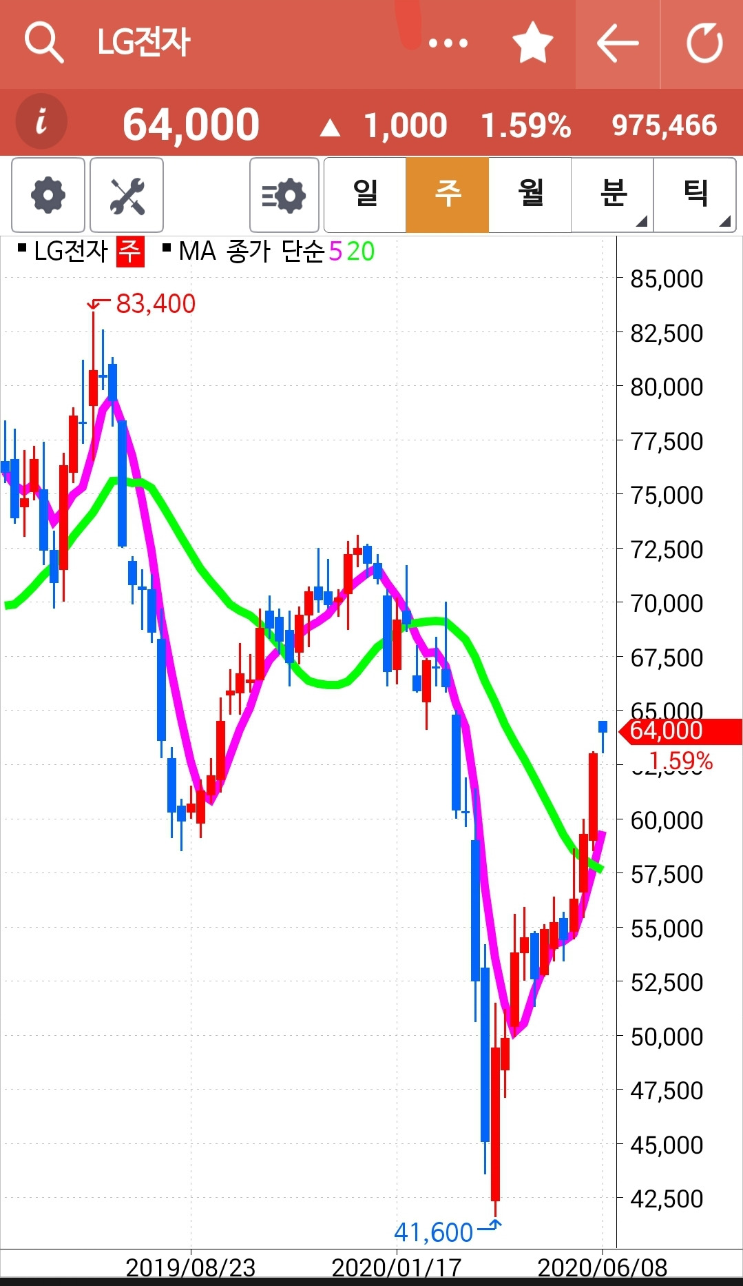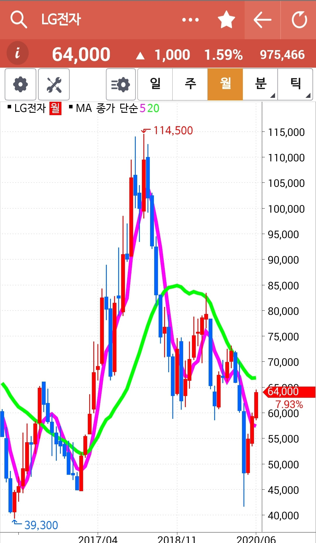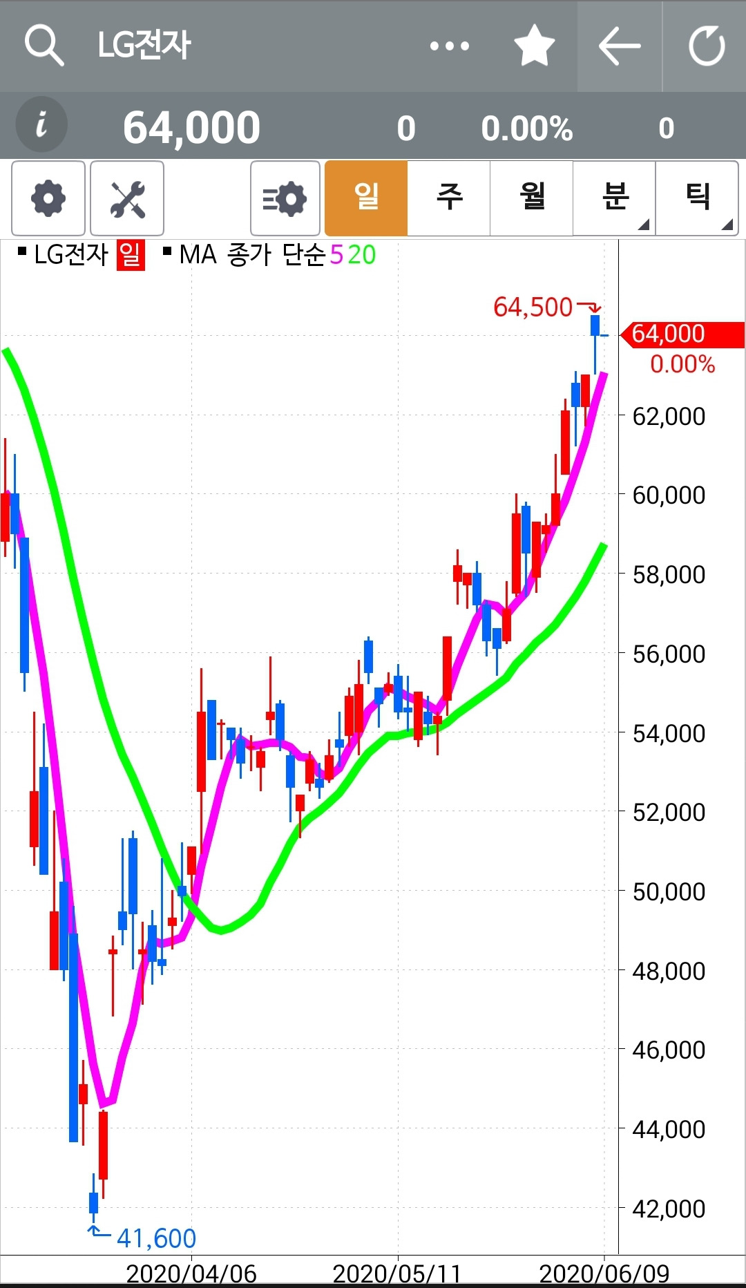 LG전자. 요것도 음봉. 푸하하하 가격이 올라도 음봉. 그래도 5일선이 위에 있으니 오케이. (어젯밤 하다 못해 오늘 일봉을 찍으니 어제 저장한 것들과 다른 모습이다.)