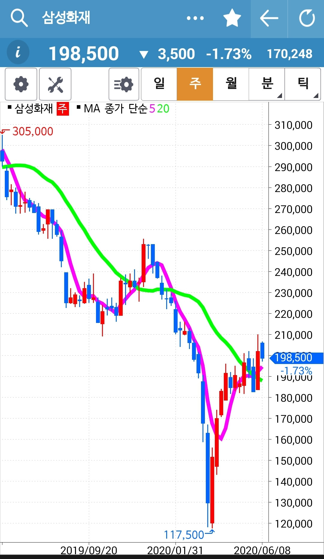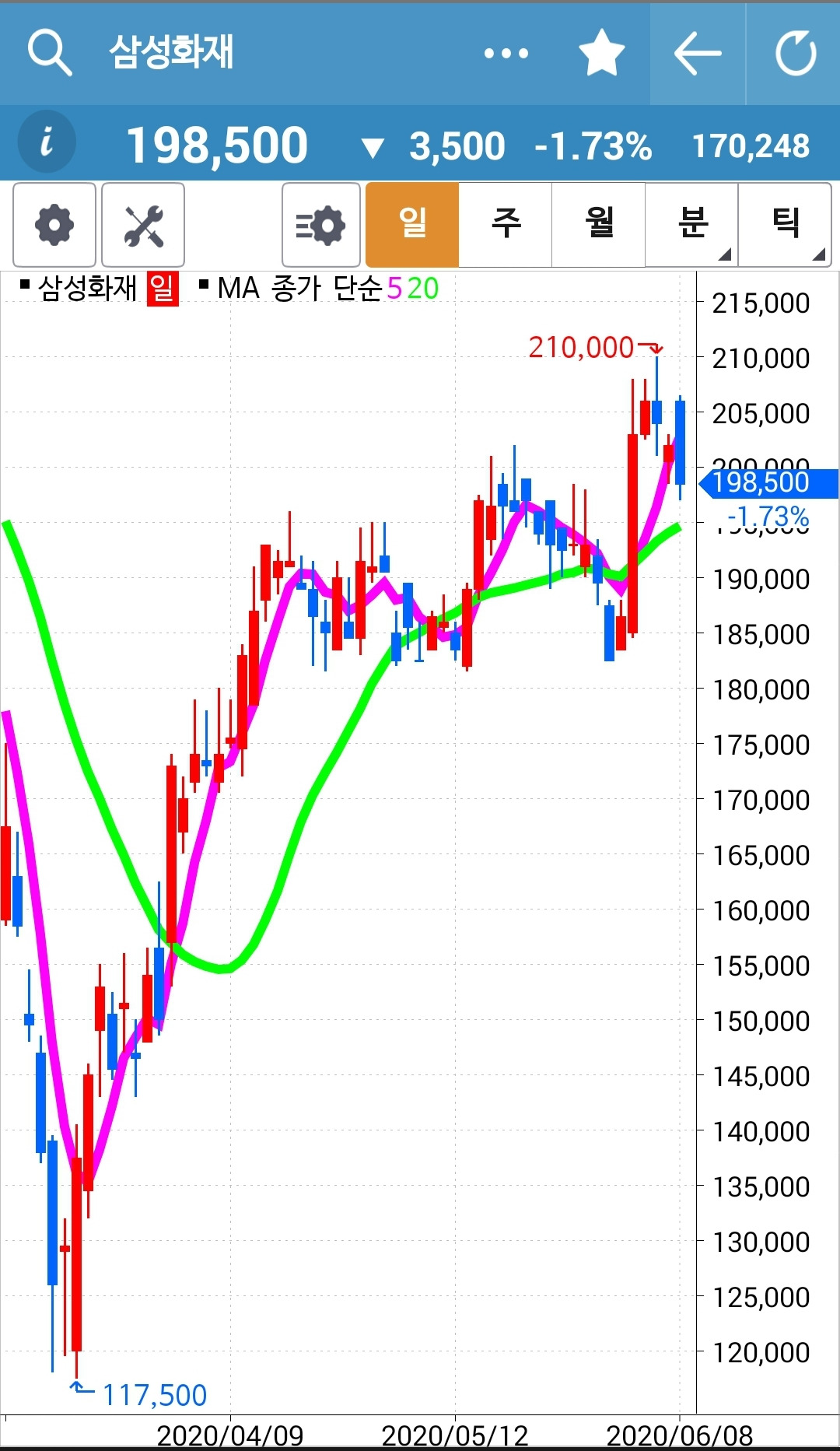 삼성화재. 긴 음봉. 그러나 아직 5일선이 위에 있으므로 오케이.