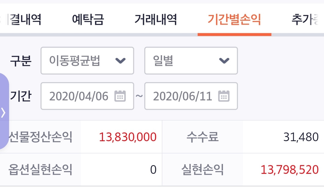 6월 물 선물은 285.70에 끝났지만 만기일 계산은 코스피 200 종가로 하기 때문에 288.62로 계산한다. 차트를 보면 알겠지만 5일선이 20일선을 뚫고 올라온 날 난 기계적으로 매수했다. 그 어떤 나의 생각이 가미되었다면 이렇게 올랐는데 따라서 매수? 그건 아니지 하는 생각에 선뜻 매수하지 못했을 수도 있다. 그러나 난 이 곳에 글을 쓰면서 그 기계적인 매매를 해보겠노라 다짐을 했고 훈련 중이기에 무념무상으로 매수를 할 수 있었다. 그리고 매일 종가에 차트 확인만 했다. 다른 게 아니라 5일선이 20일선을 건드리고 내려가는가만을. 두 달이 넘은 이 기간 동안 단 한 번도 20일선을 뚫고 내려온 적이 없다. 그러므로 난 이익 실현하고픈 맘을 꾹꾹 참고 버텨냈다. 그 훈련 중이니까. 그리고 오늘 대단한 수익을 냈다.