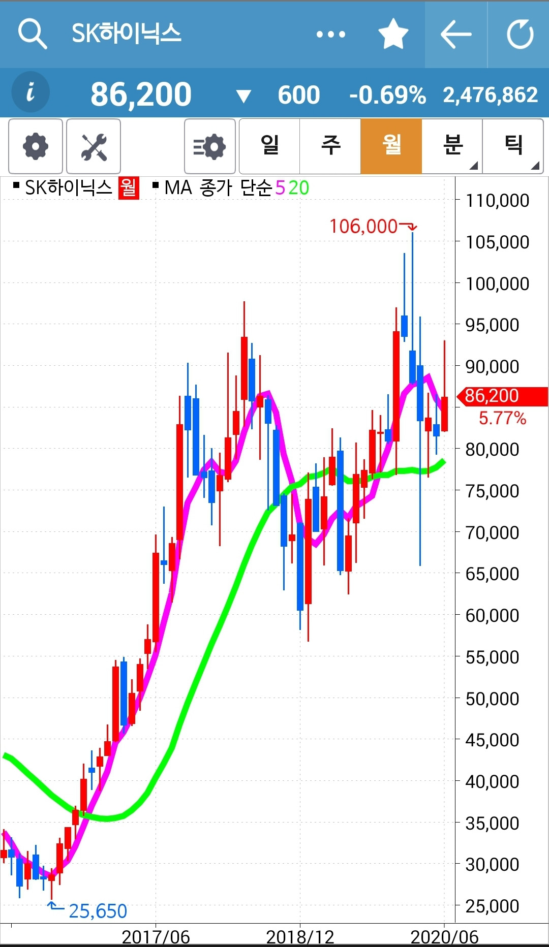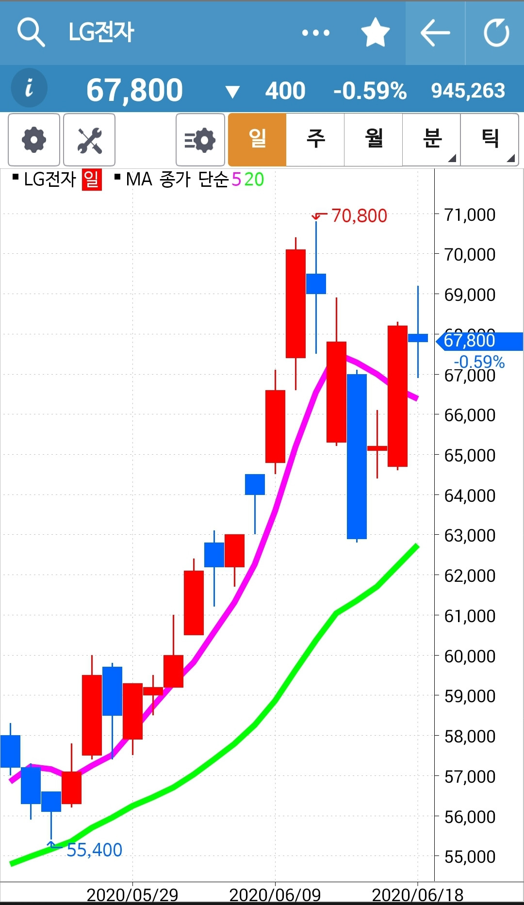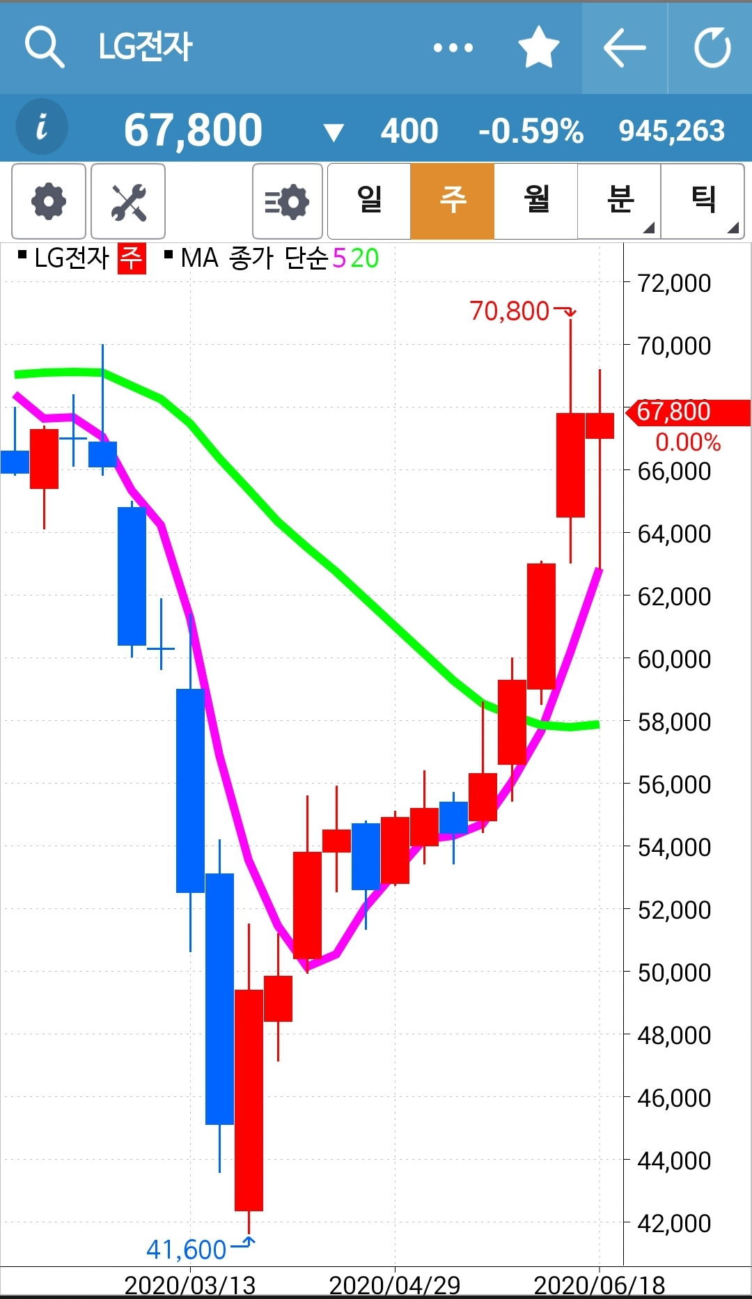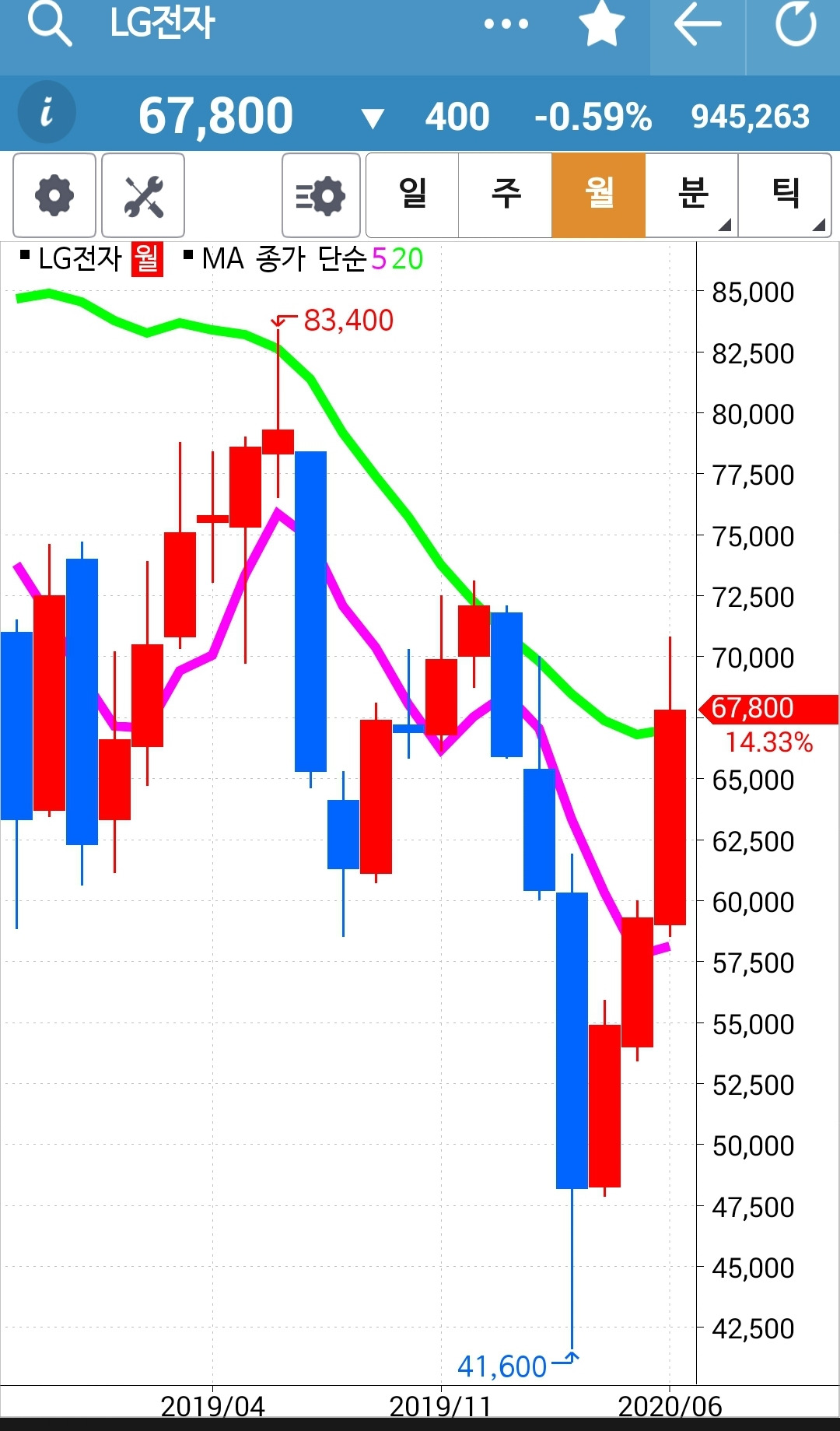 LG전자. 5일선이 위에 있으므로 생존. 주봉은 멋지게 상승하고 있고 그리고 월봉의 5개월선 20개월 선도 서서히 방향을 턴하는게 보인다.
