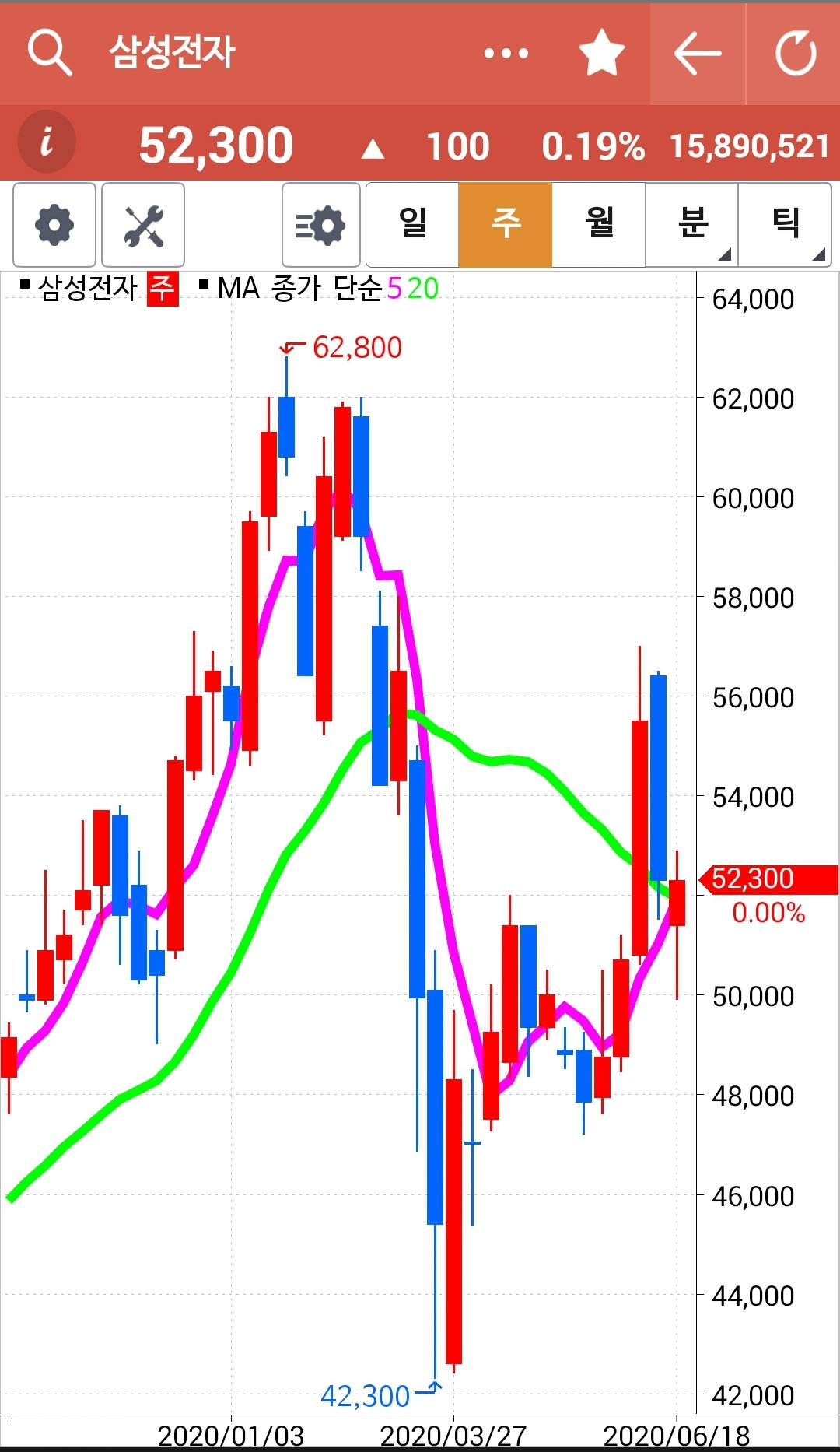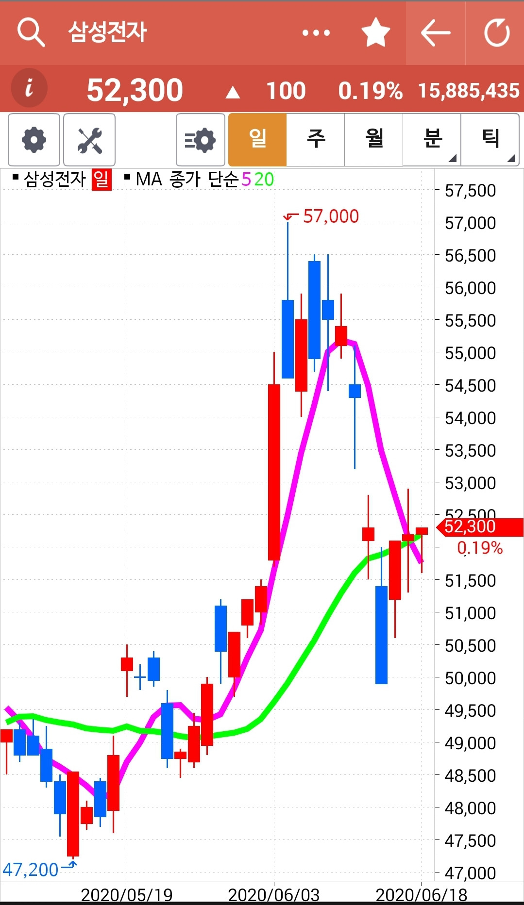 삼성전자. 괜찮은 모습이라고 칭찬했는데 툭 떨어진 가격 때문인지 오늘 5일선이 20일 선을 뚫고 내려왔다. 그러면 난 어쩔 수 없다. 아무 생각 안 하는 나는 기계~ 난 아무것도 몰라요 5일선이 20일선 아래로 내려오면 매도할 뿐야요~ 그런데 두 개 똑같이 주문을 넣었는데 삼성전자는 이상하게 안 팔렸다. 그래서 장후 시간 외 종가에 넣었지만 또 안 팔린다. 우쒸. 다시 시간 외 단일가 매매에 오늘 종가로 넣는다. 계속 안 팔린다. 할 수 없이 5시 반쯤에 대폭 가격을 내려 주문을 넣자 드디어 체결된다. 그래서 종가 52,300원보다 낮은 52,100원이 매매가다. 자, 내일은 내일의 새 태양이 뜬다. 모든 생각은 내일하고 난 잠을 쿨쿨 잔다. 파이팅!!!