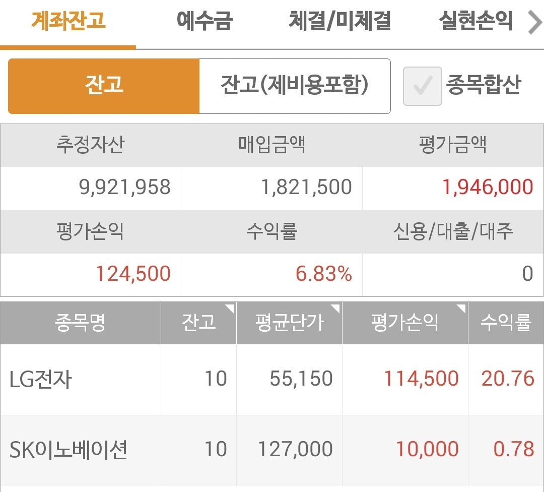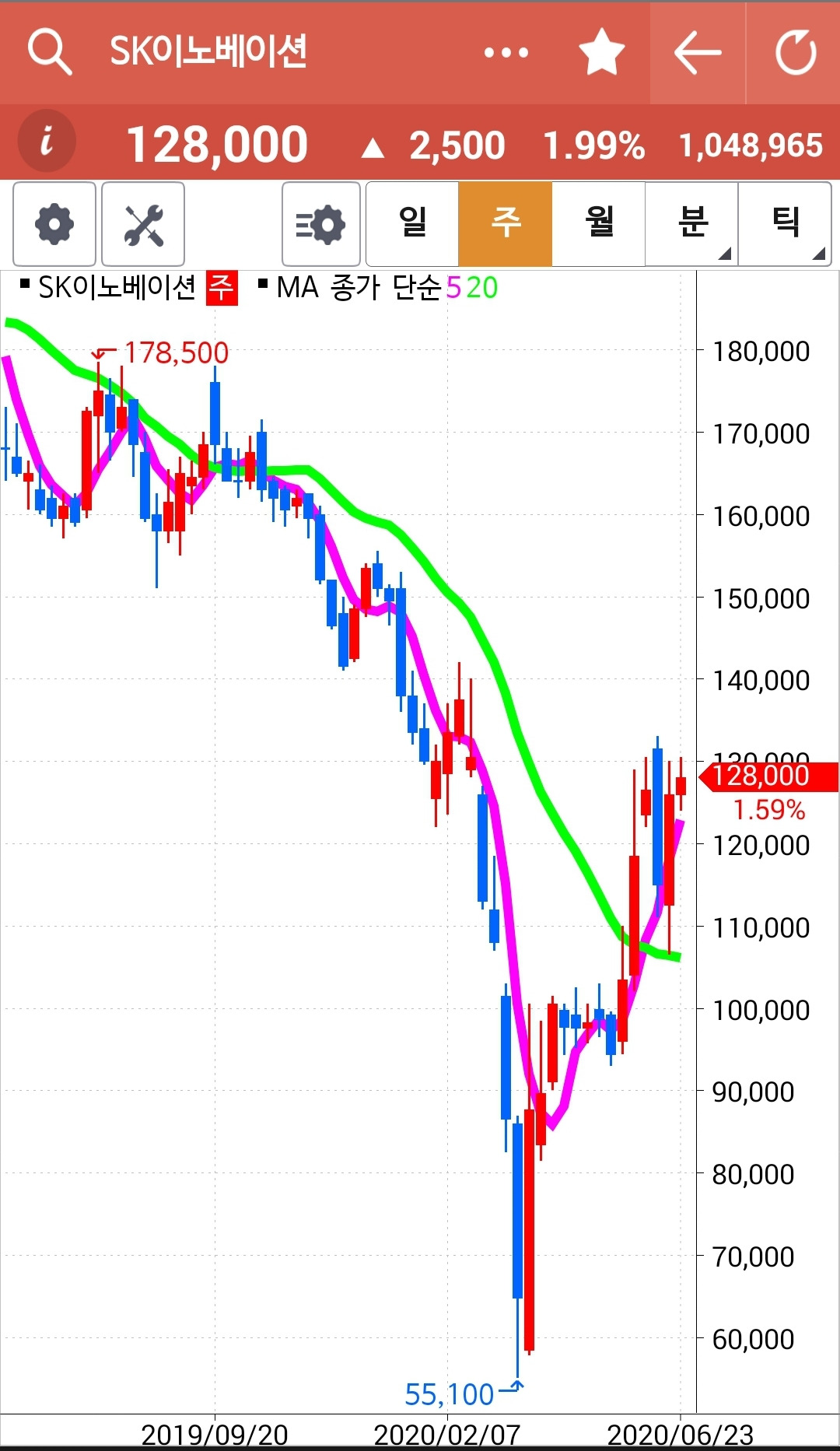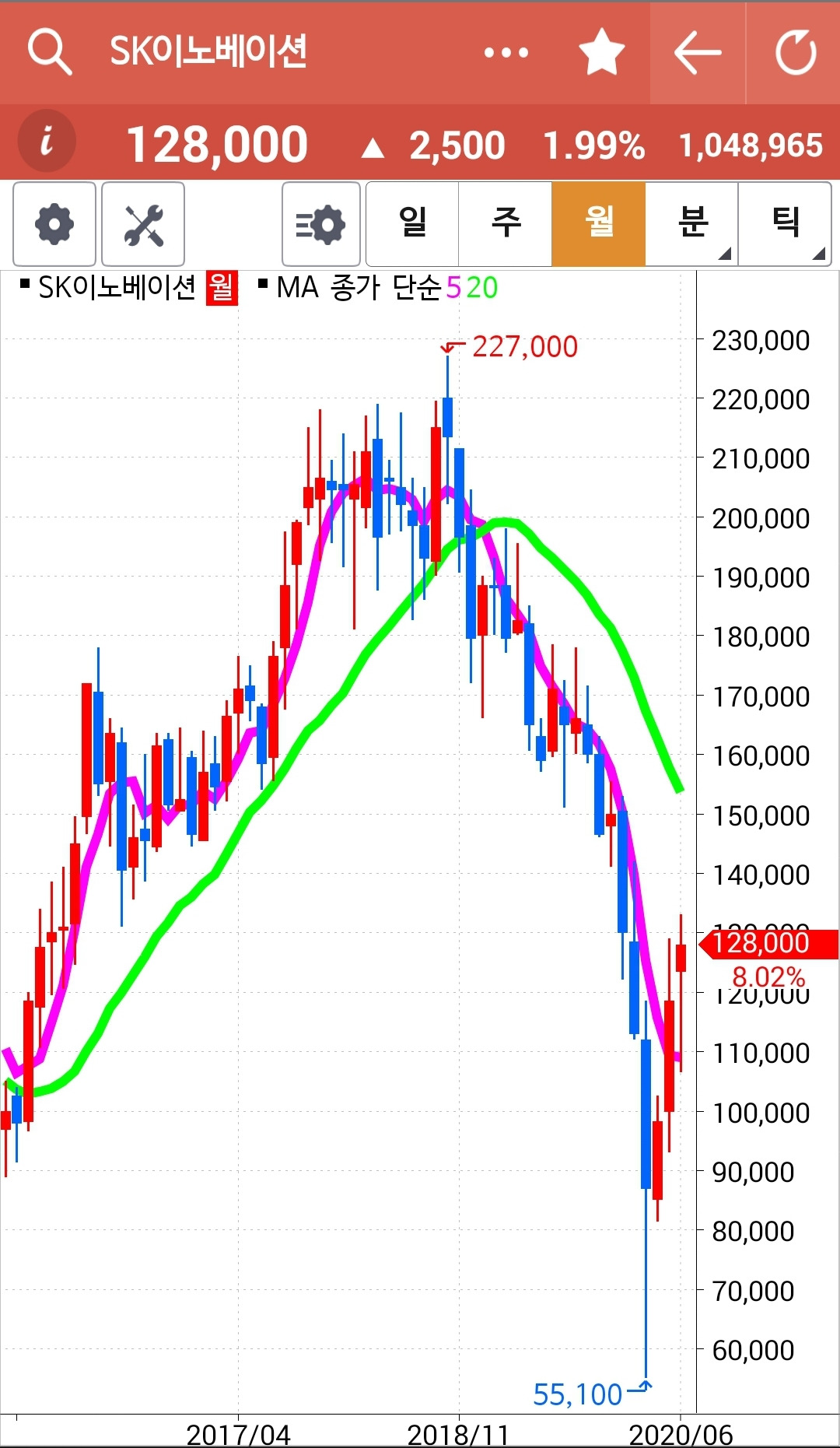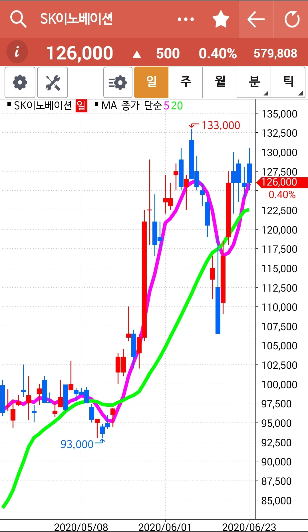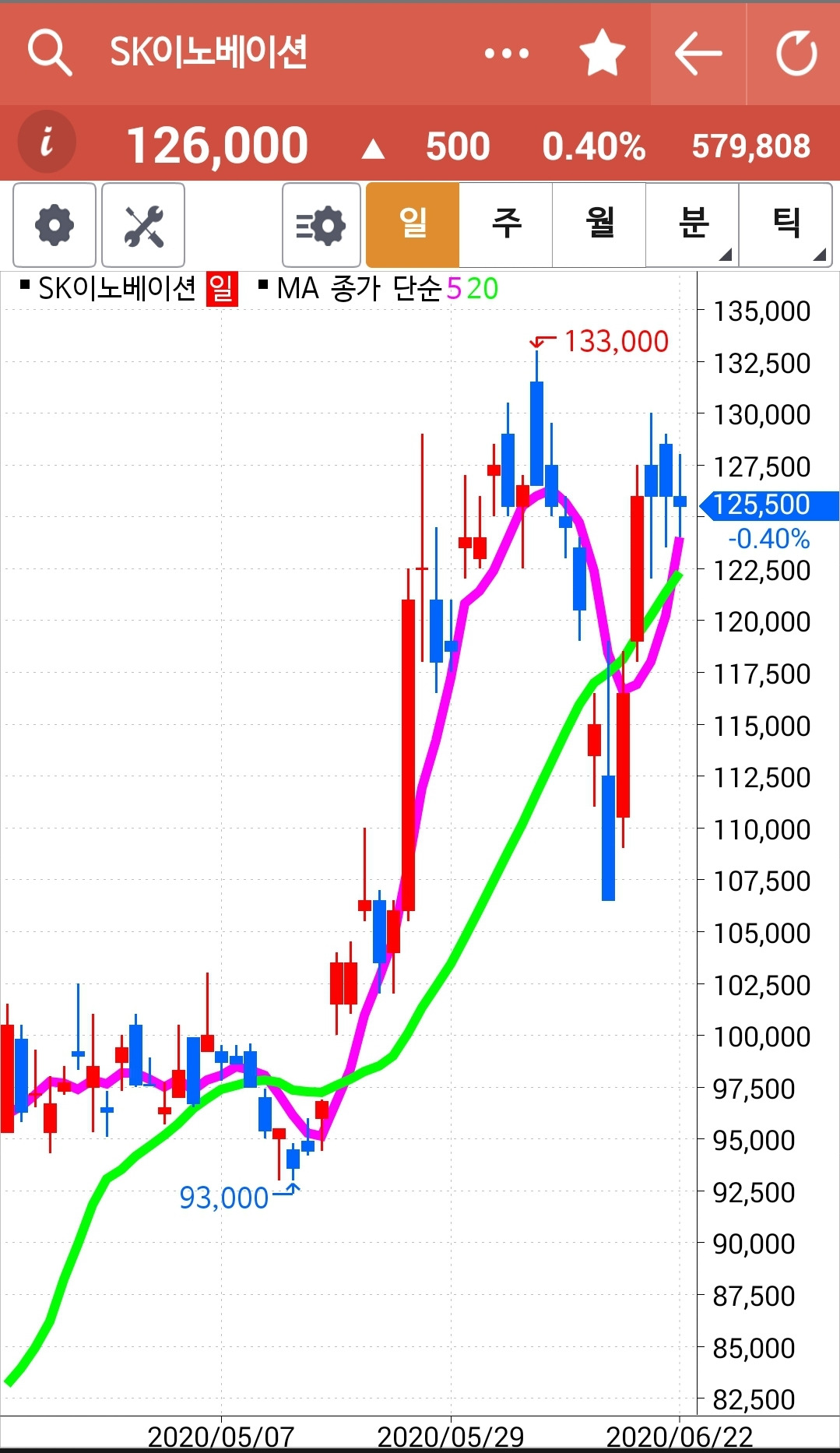 이제 여느 때처럼 나의 종목들 차트를 감상하기로 한다. 당일 매매일지를 보면 5일선이 올라온 것 발견하고 헐레벌떡 매수한 SK이노베이션 매수가랑 잘 나와있다. 그래도 종가가 나의 매수가 보다는 올라서 다행이다. 원칙은 지켜져야만 한다. 나의 투자금액은 천만 원. 여전히 8만 원의 손실 중이다. 그럼 두 종목 그림을 볼까?
