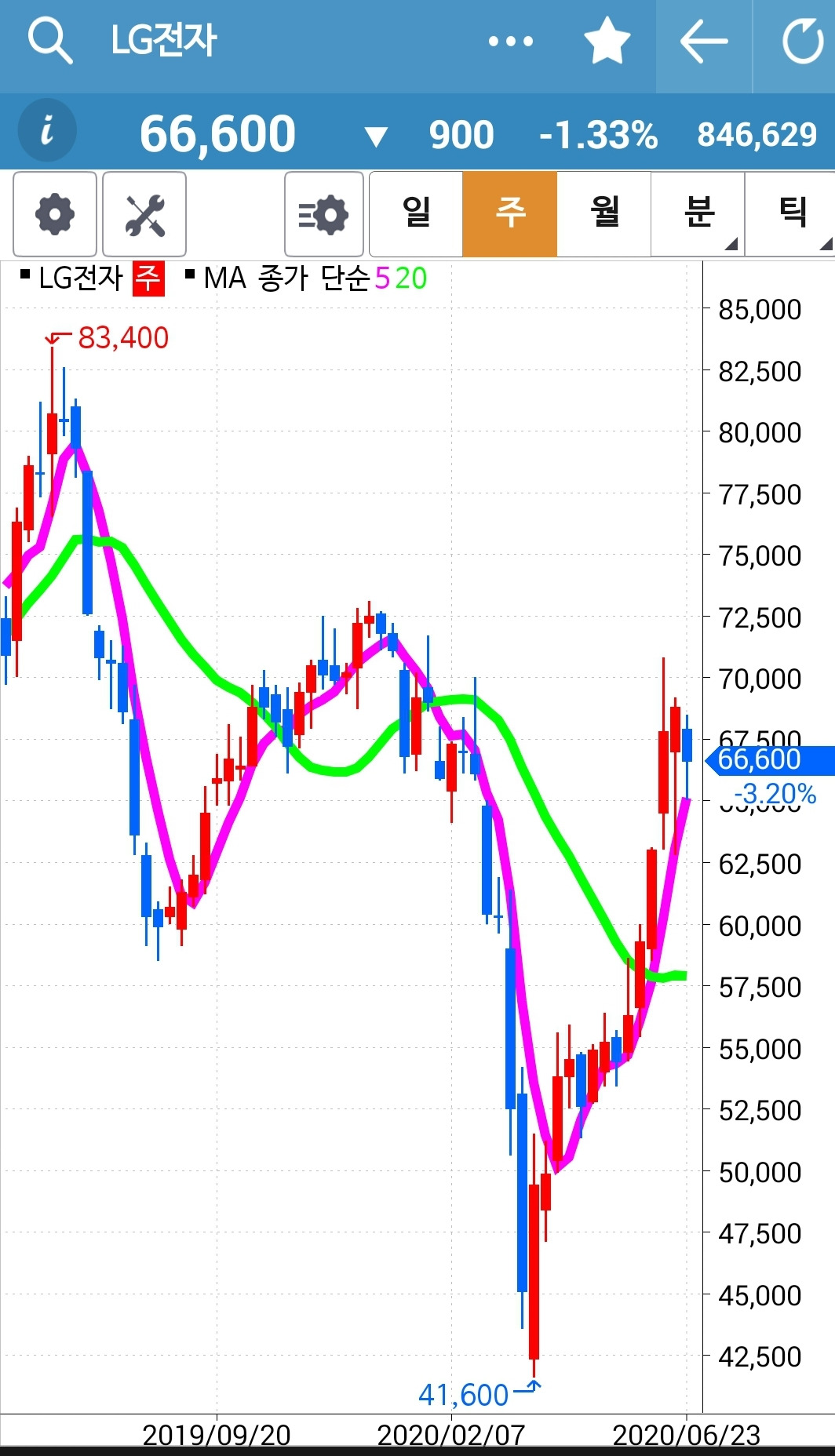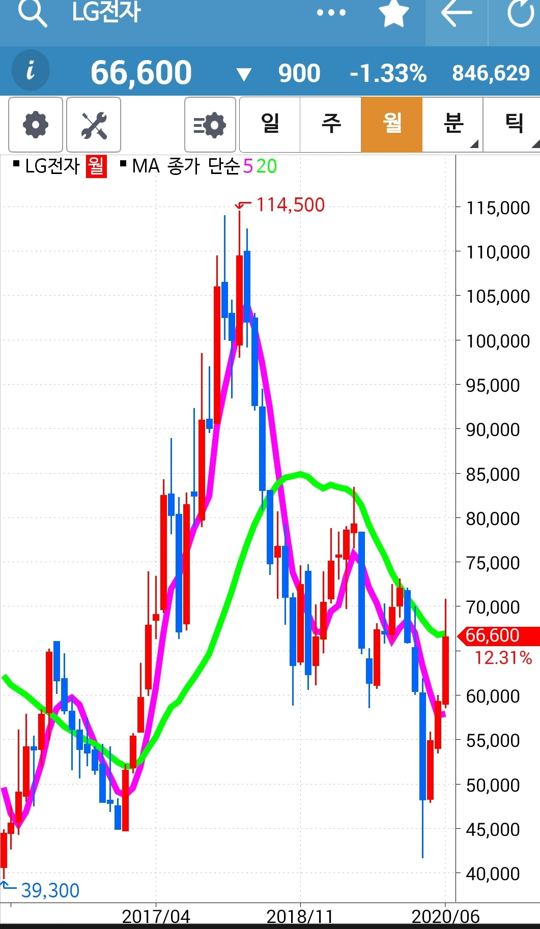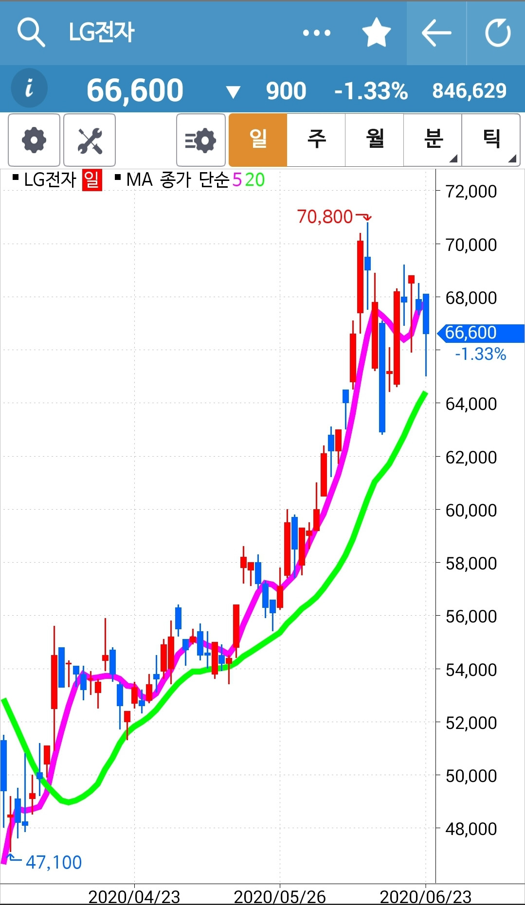 LG전자. 일봉은 올라가는 그림 확실하게 왼쪽에서 오른쪽으로 올라가고 있다. 그리고 5일선이 20일선 위에 있으니 나의 종목으로 유지될 밖에. 주봉 역시 신나게 올라가고 있다. 월봉은 20개월 선에 부닥쳐있다. 파이팅.