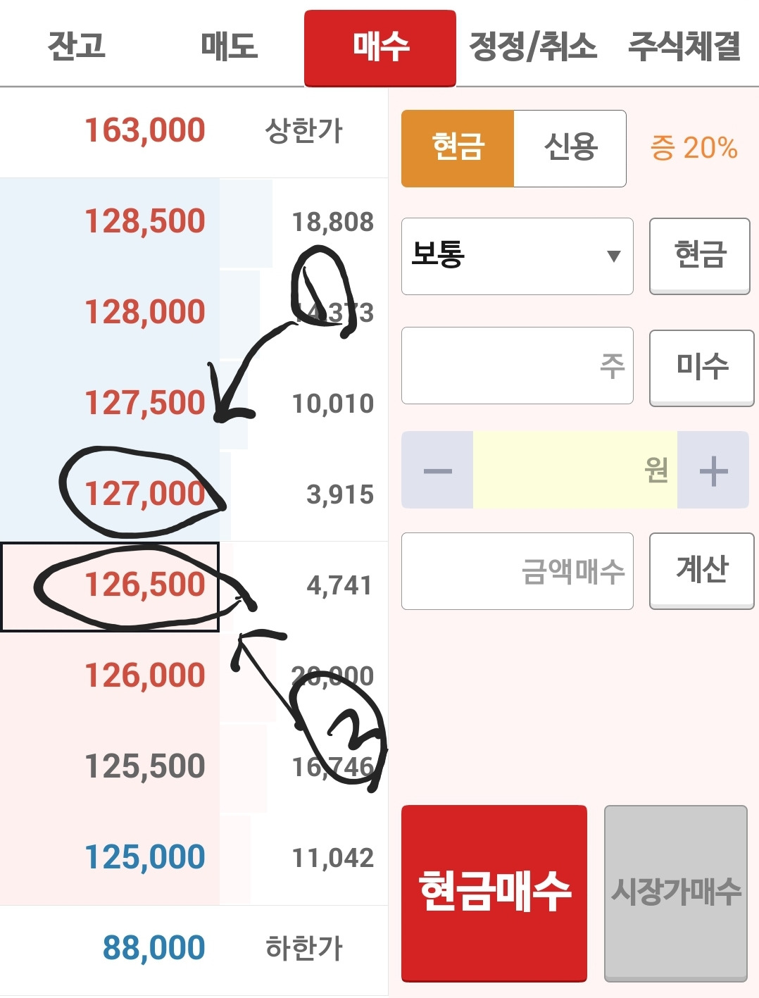 열 시쯤엔가? 첫 번째 사진을 보고 깜짝 놀란 나. 아니 어제 그럼 이게 뚫었었단 말인가? 하루를 뒤로하여 차트를 본다. 두 번째 사진이다. 앗. 어제 분명히 뚫고 올라가 있다. 그런데 난! 왜 이것을 발견하지 못했을까? 매수를 했어야만 하는데. 5일선이 20일선 뚫고 올라왔으니 매수! 헐레벌떡 늦었더라도 원칙은 재빨리 지켜져야 한다. 주식주문 화면으로 들어간다. 세 번째 사진이다. 팔자가 127,000원이고 사자가 126,000원인 상태. 느긋하게 126,500원에 넣고 기다려도 되겠지만 노노노! 난 지금 그런 저런 걸 따질 때가 아니다. 어제 매수해야 하는 걸 실수로 놓친 상황이므로 어쨌든 재빨리 사넣어야만 한다. 127,000원 팔자 가격에 매수 주문을 넣고 즉시 사진다. 그리고 금방 126,000원 아니 125,500원까지 내려간다. 아, 조금 차분하게 느긋하게 밑에 넣고 기다릴 걸. 아니 아니. 그럴 거 아니다. 난 원칙을 지켜야 되는 입장. 얼마가 되었건 어제 샀어야 하는 종목을 재빨리 사넣는 게 중요했으므로 잘했다. 다음엔 3시 20분에 놓치는 종목 없도록 철저히 하자. 파이팅!!!