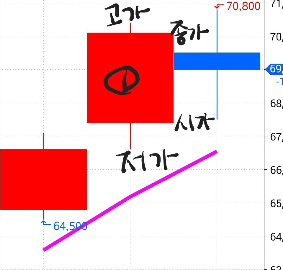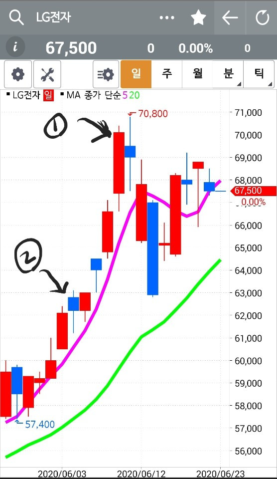 자, 어제 우리는 캔들 차트라 고도하는 봉차트의 시가 종가 고가 저가를 공부했다. 양봉과 음봉도 공부했다. 그걸 나의 유일한 생존 종목 LG전자에서 구경해보려는 것이다. 더욱 실감 나도록. 첫 번째 사진을 보시랏. LG전자의 일봉이다. 거기 있는 많은 봉들 중에서 동그라미 한 1번과 2번을 확대해서 보겠다. 두 번째 사진 1번. 바로바로 어제 공부한 양봉. 와이? 빨간색이니까. 왜 빨간색이 되었을까? 시작한 가격 시가가 아래 있고 위로 아래로 왔다 갔다 하면서 고가와 저가를 만들고 그리고 마지막에는 시작 가격보다 오른 가격에서 끝나며 종가를 만들었기 때문이다. 그렇게 올라갔으므로 양봉. 세 번째 사진 2번. 파란색 음봉이다. 와이? 처음 시작은 좋은 가격에서 했으나 왔다 갔다 고가와 저가를 찍더니 종가는 시작한 가격을 못 따라잡고 내렸기 때문이다. 오늘 공부 끝. 푸하하하