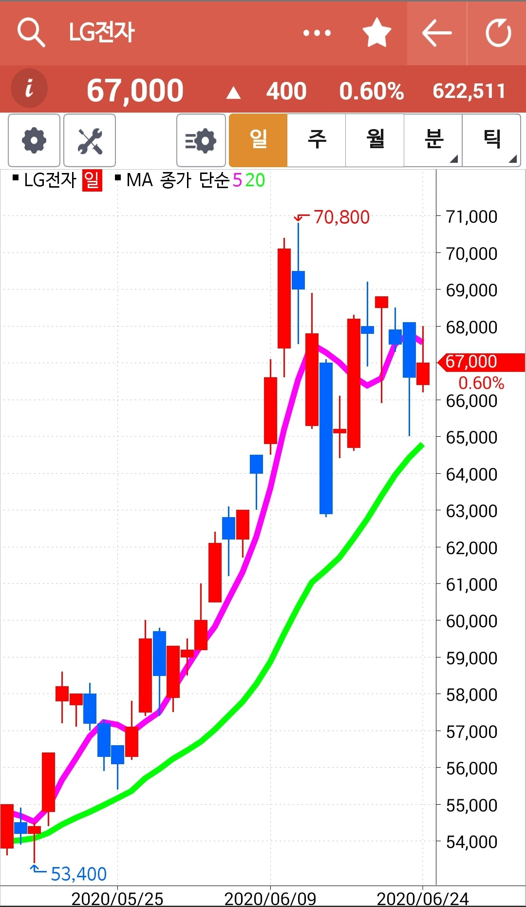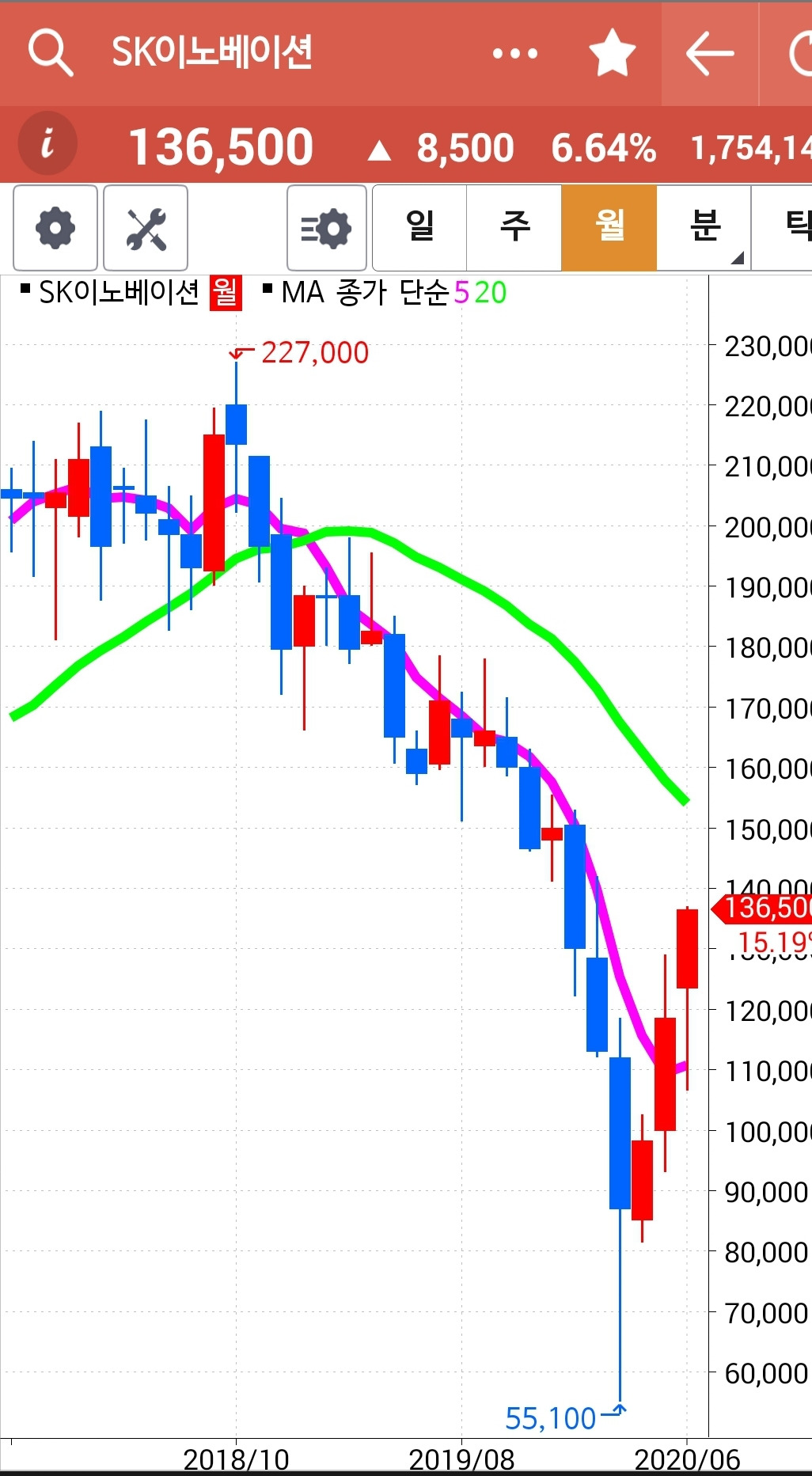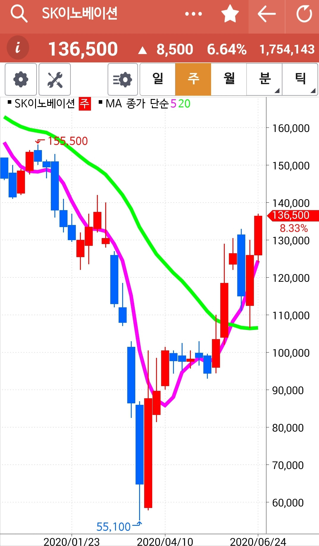 SK이노베이션. 5일선이 20일선을 뚫고 올라온 것을 안 순간 늦었지만 헐레벌떡 사놓은 것은 얼마나 잘했는가. 원칙은 지켜져야 한다. 그저 원칙에 따랐을 뿐인데 오늘 아주 큰 수익을 주었다. 전 고점마저 뚫고 빵! 올라갔다. 살짝 20일선 아래로 내려가 나로 하여금 왔다 갔다 하며 수익을 뺏아간 게 영 야속하다. 그러나 나의 결심. 골백번 왔다 갔다 해봐라. 내가 안 따라가나! 푸하하하 그렇게 따라붙었더니 드디어 수익을 준다. 그래. 바로 그거다. 난 아무것도 몰라요~ 5일선이 20일선 위로 가면 매수할 뿐야요~ 파이팅!!!