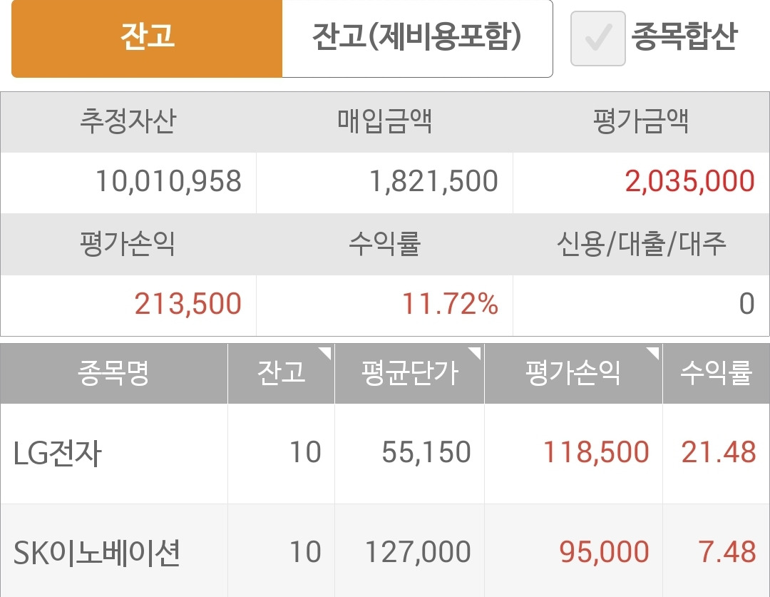 오홋. 수익으로 돌아섰다. 종목이 적을 때는 수량을 좀 늘리는 방법을 연구해야겠다. 수익이 너무 적지 아니한가. 많은 종목이 생존할 땐 거의 천만 원이 다 투자되었는데 지금은 모두 탈락한 상태라 겨우 이백만 원 투자되었을 뿐이다. 아니 LG 전자는 심지어 겨우 오십만 원 정도라니. 금액을 좀 융통성 있게 늘리고 줄이고 해야겠다.