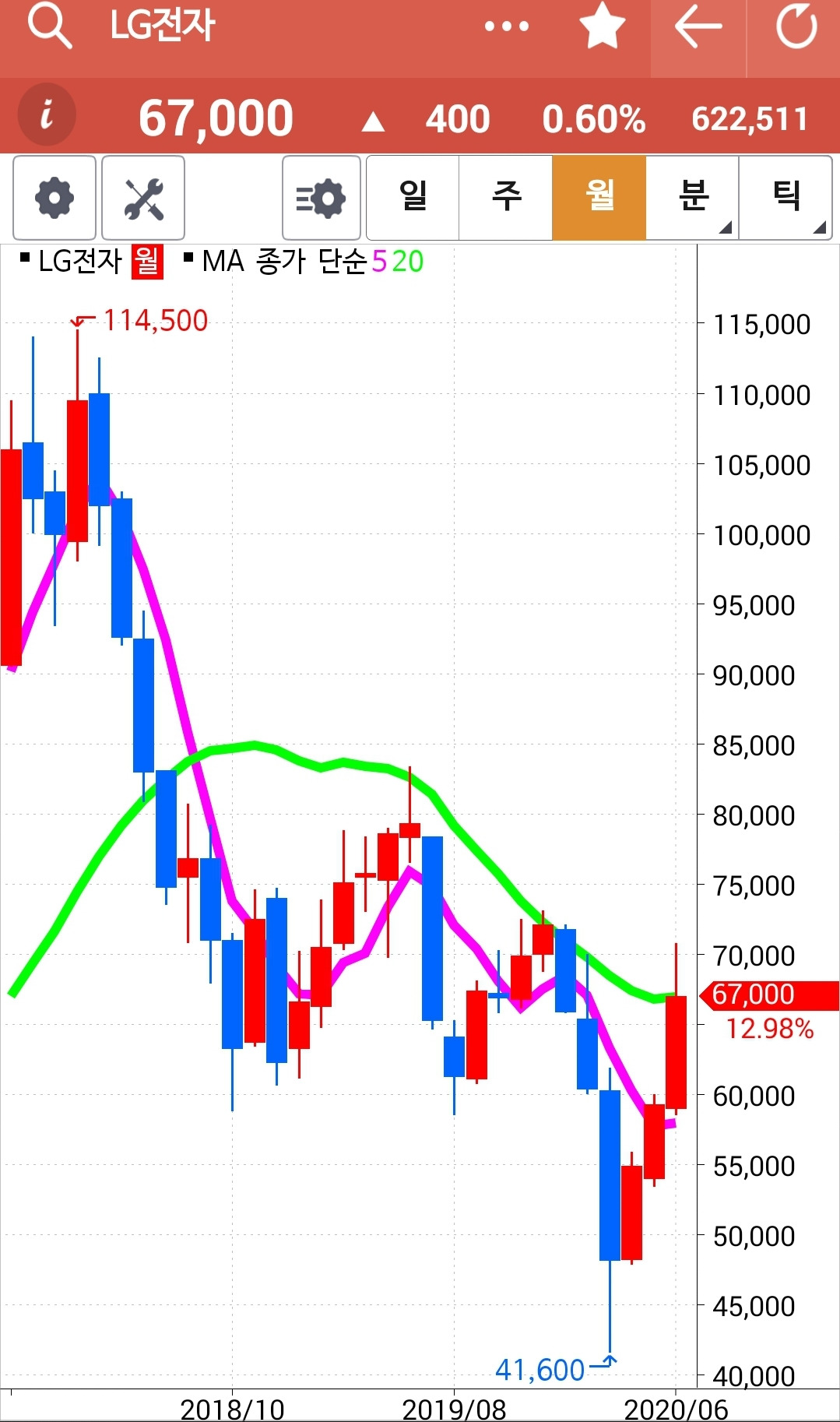 LG전자. 70,800원이 고점일까? 오늘 공부한 교수형이 종종 등장하고 있다. 정말 하락 추세로 변하게 될까? 그러나 이건 일봉이므로 그리 크게 효력이 없을 수 있다. 주봉에서 교수형은 주로 효력을 발휘한다는데 헉 주봉에서도 교수형이 등장했다. 그리고 월봉은 20개월선에 부딪고 있다. 조만간 조정이 나타날 수 있겠으나 난 아무것도 몰라요~ 5일선이 20일선 아래로 내려가면 매도할 뿐야요~ 그래. 5일선이 과연 20일선 뚫고 내려오는가만 두 눈 부릅뜨고 지켜볼 일이다. 파이팅!