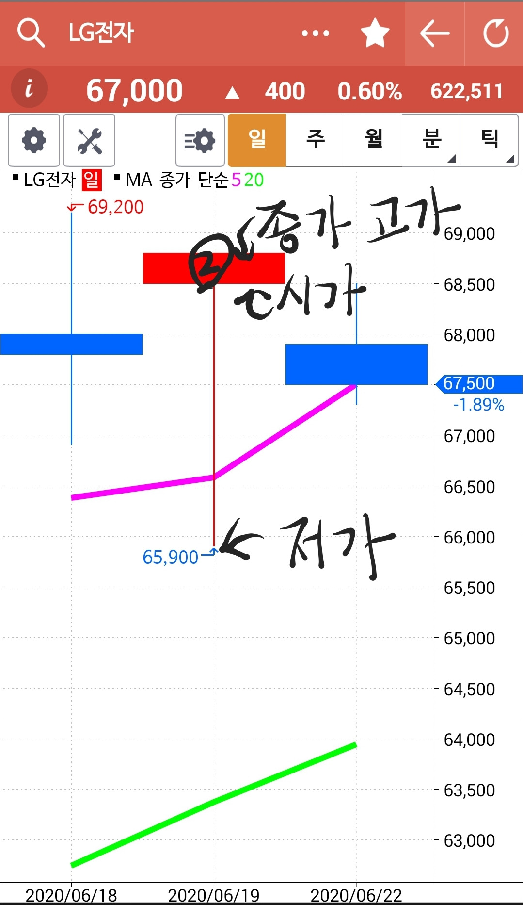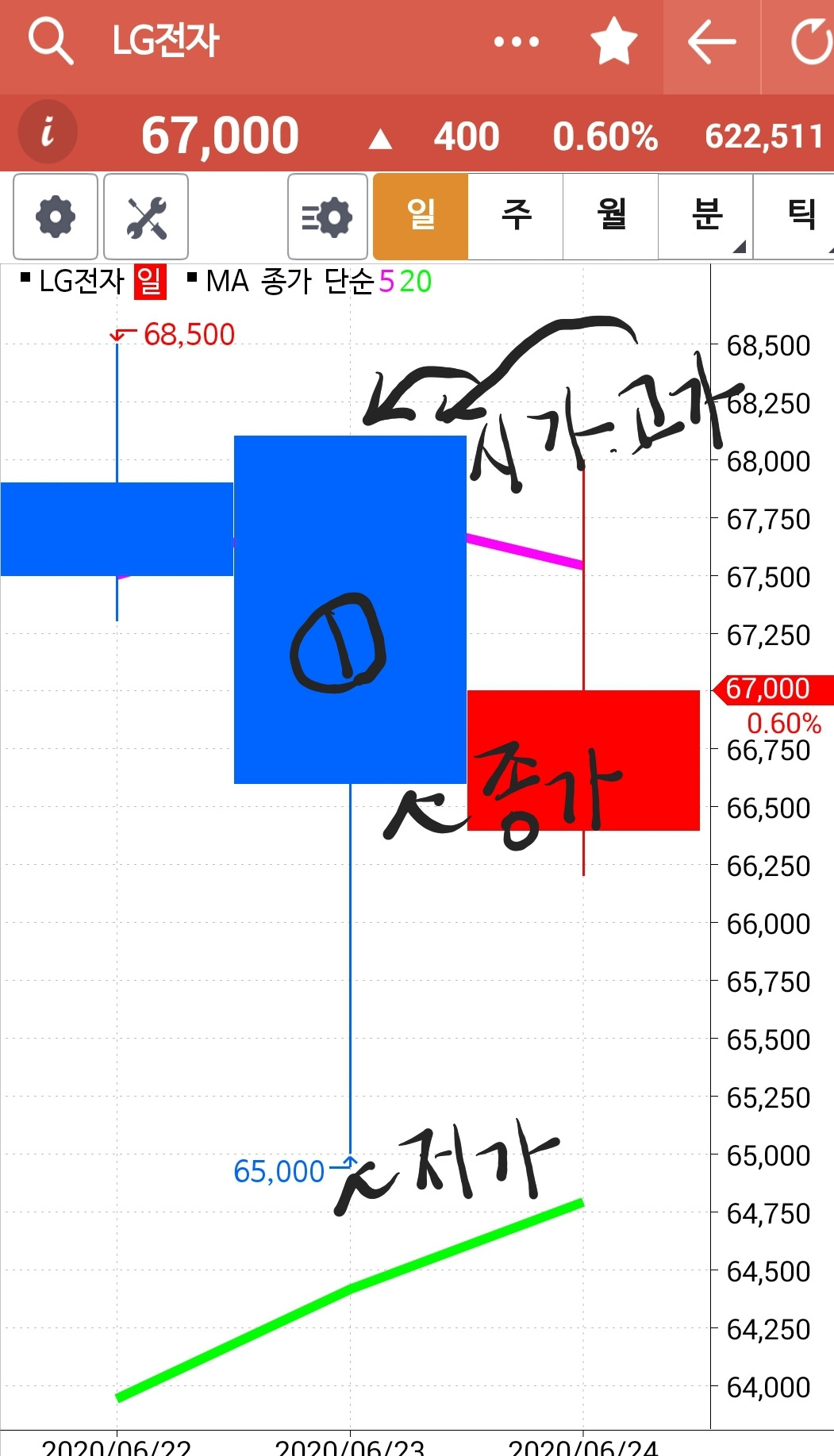 LG전자에서 볼까? 첫 번째 사진의 1번과 2번을 보라. 상승 중 등장했으니 교수형이라고 해야겠다. 두 번째 사진을 보랏. 1번을 좀 확대했다. 시가가 이날의 최고가. 그러니까 시작하고 계속 내려갔다는 이야기다. 한참을 내려가다 다시 올라갔지만 시작한 가격까지 못가 음봉이 되었다. 세 번째 사진 2번은 시가에서 아래로 쭉 내려갔다 종가 보다도 높이 올라 양봉이 되었다. 상승 추세에서 이런 교수형이 자주 등장하면 조만간 하락할 수 있음을 생각해야 한다. 그러나 아무리 교수형이 많아도 난 꿈쩍 않는다. 와이? 5일선이 20일선 뚫고 내려가야 매도하는 기계니까. 음하하하. 기본을 알아두고 차트에서 그런 모양이 나올 때 과연 어떻게 되는가를 구경할 뿐이다. 오늘 공부 끝! 푸하하하