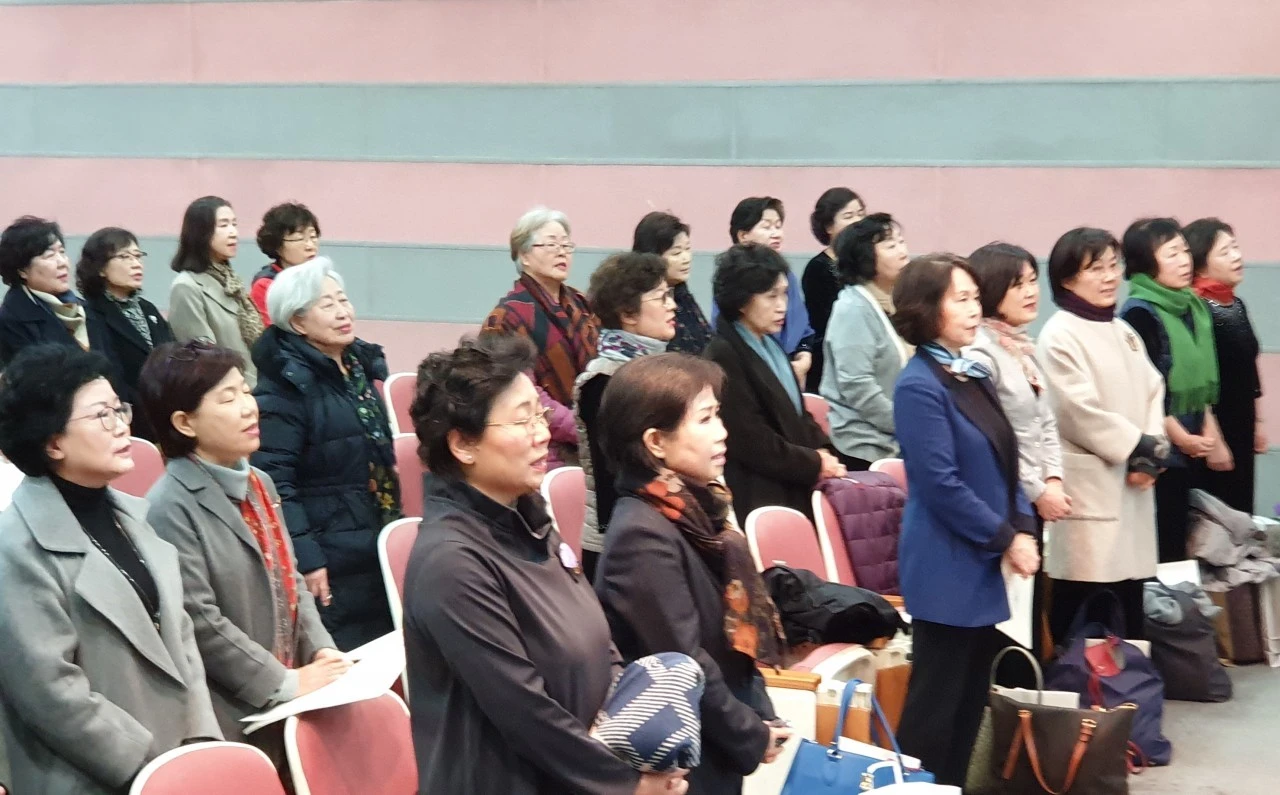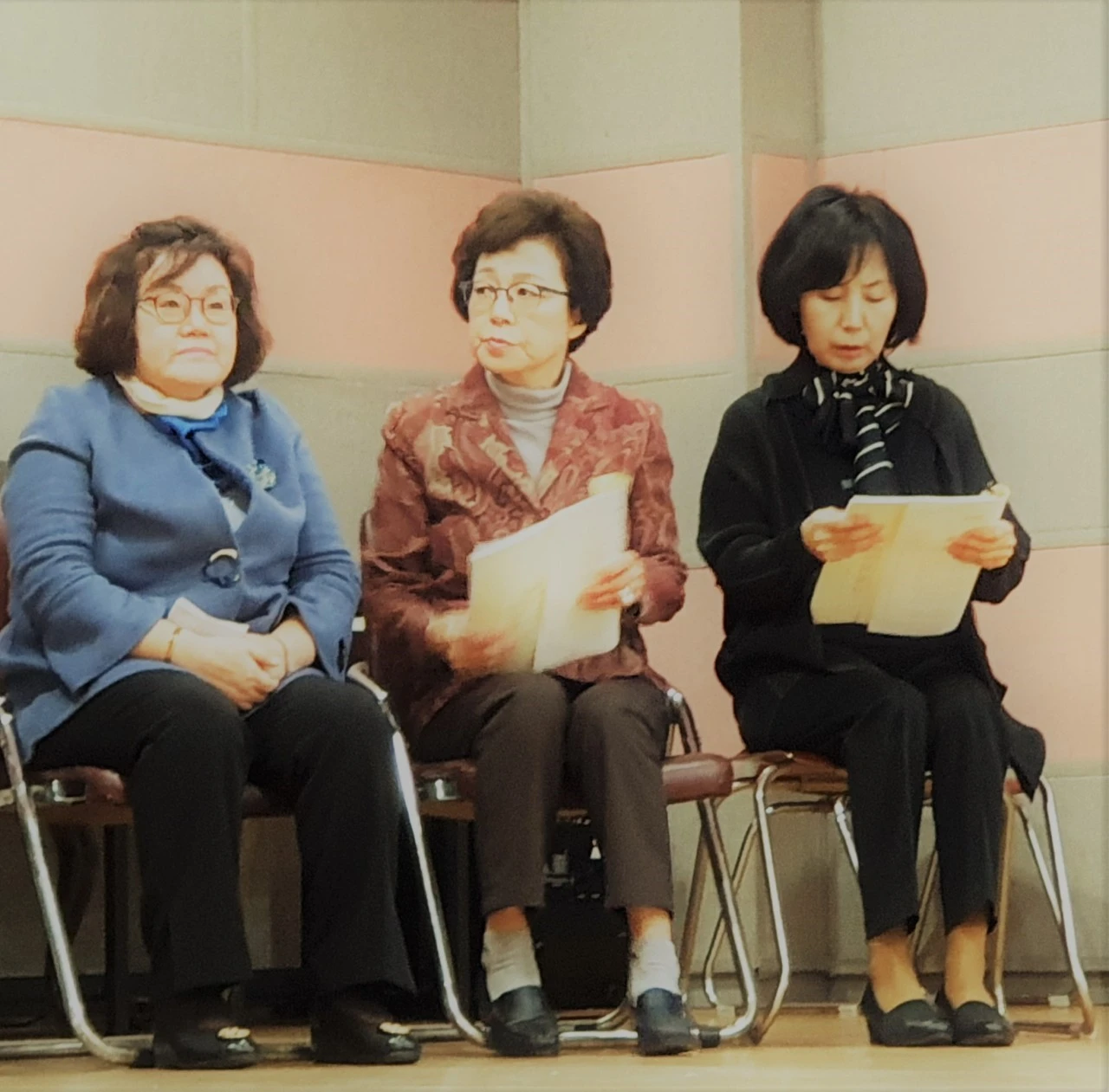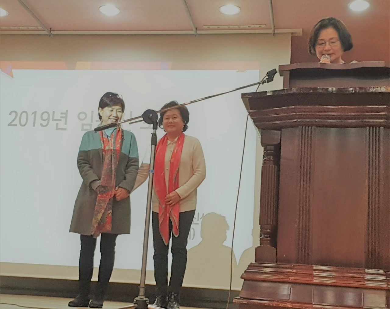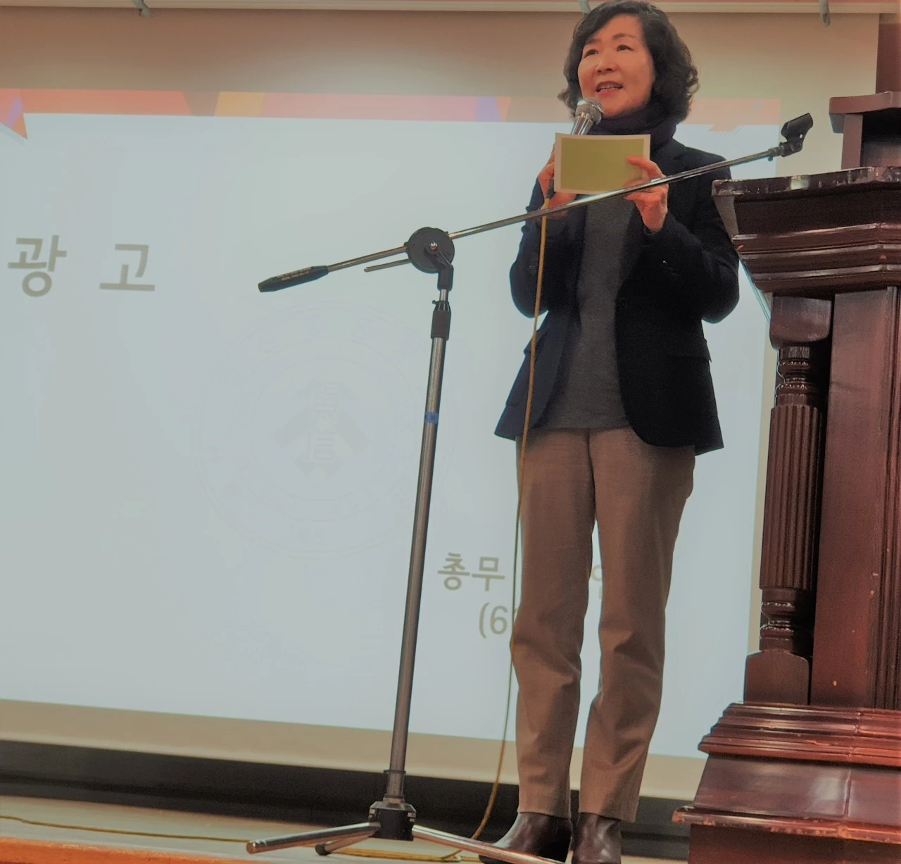 강단에 올라와 계신 정기총회에서 발표할 분들 맨 왼쪽부터 감사보고 60기 안혜순 선배님 결산보고 60기 김숙자 선배님 그리고 기도 61기 이희숙 선배님