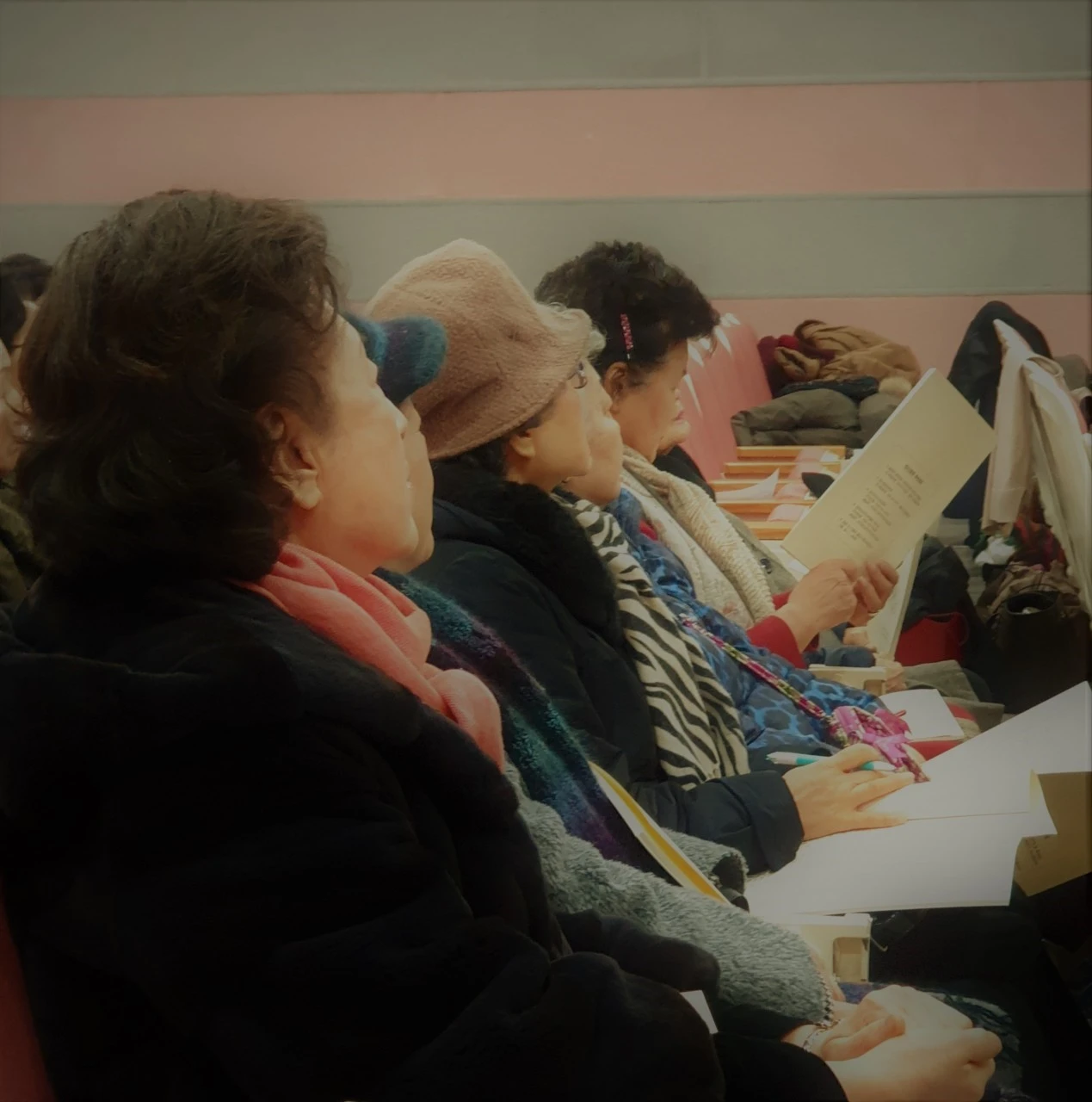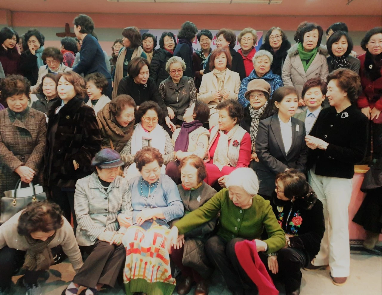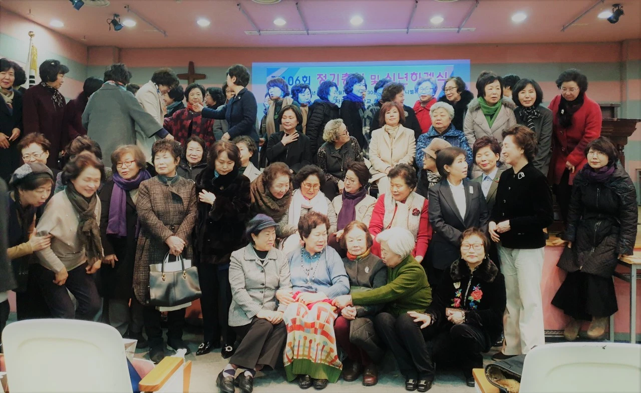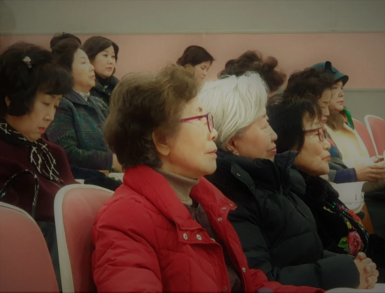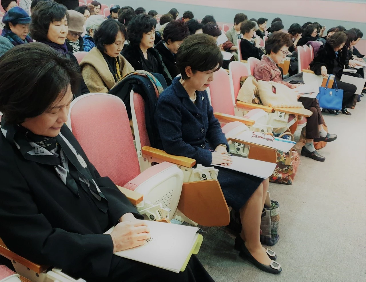 강단에 올라와 계신 정기총회에서 발표할 분들 맨 왼쪽부터 감사보고 60기 안혜순 선배님 결산보고 60기 김숙자 선배님 그리고 기도 61기 이희숙 선배님