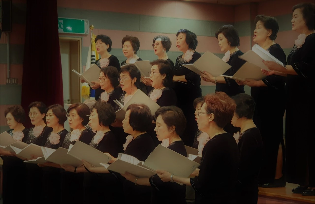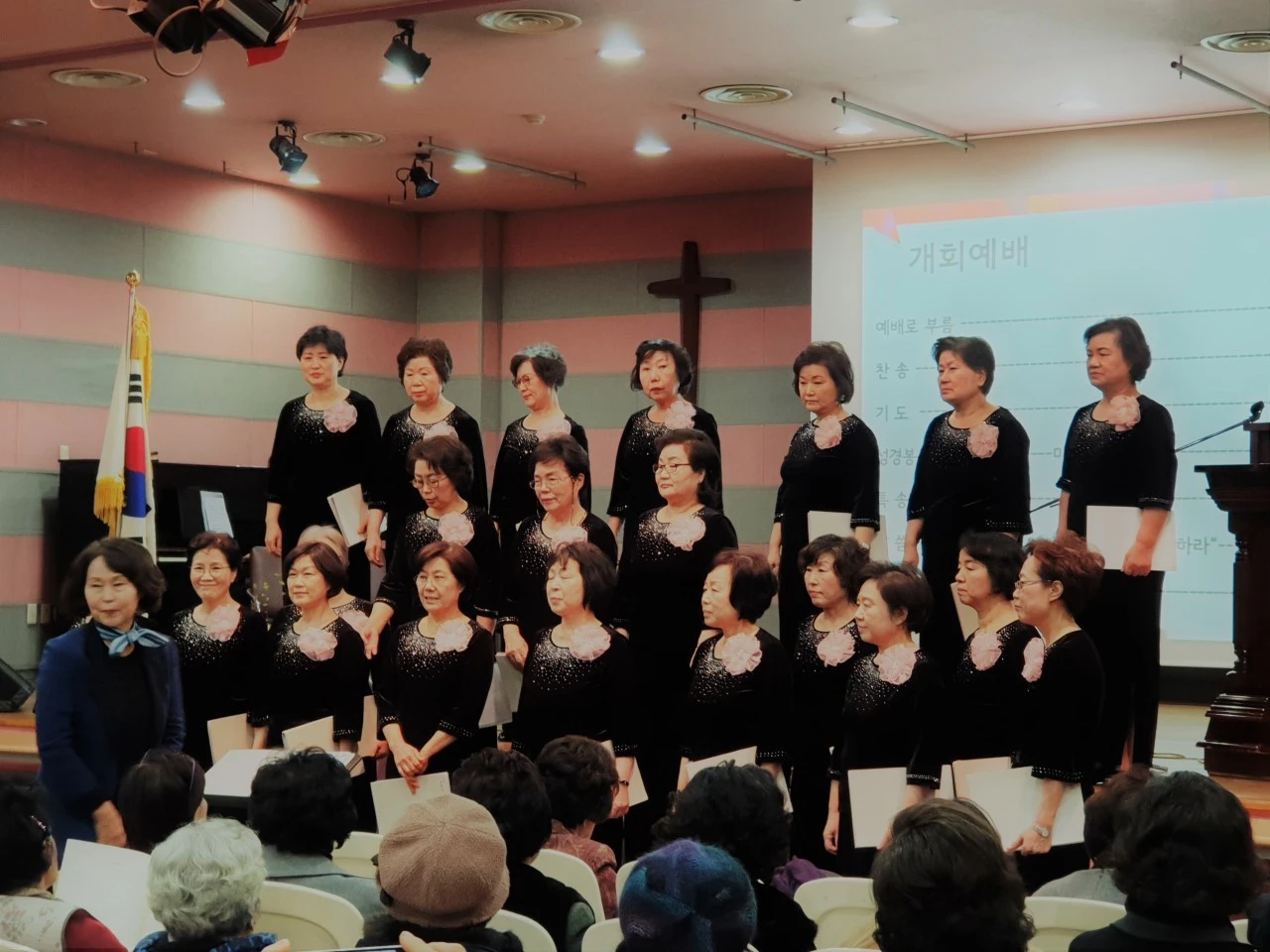 앗, 유럽으로 미국으로 그 유명한 우리 정신 총 동문 합창단이 특송을 위해 강단으로 올라선다. 가운데 우리 63기 최경희가 있다.