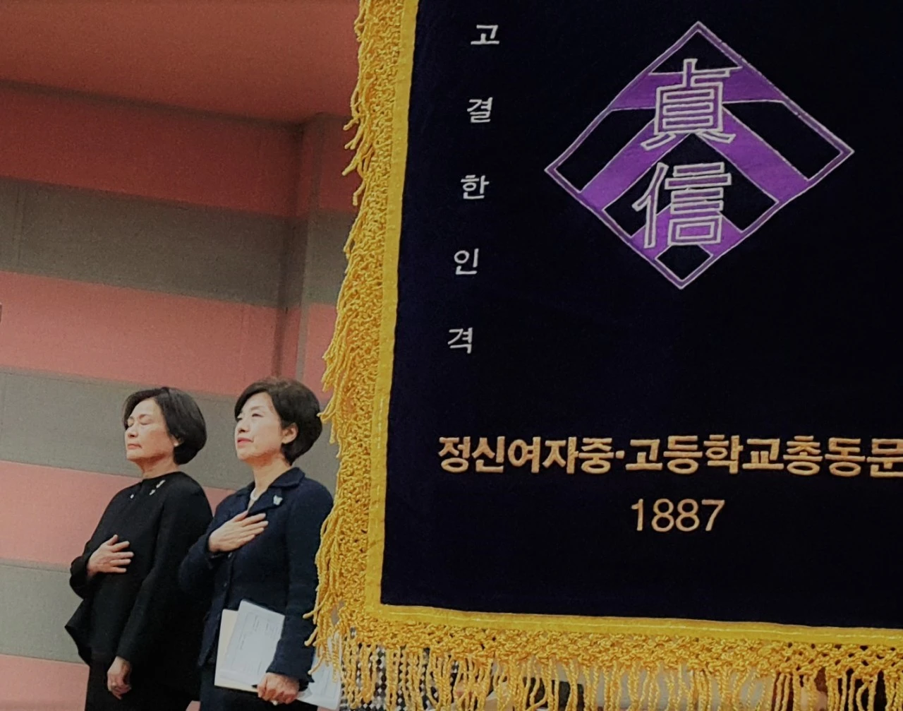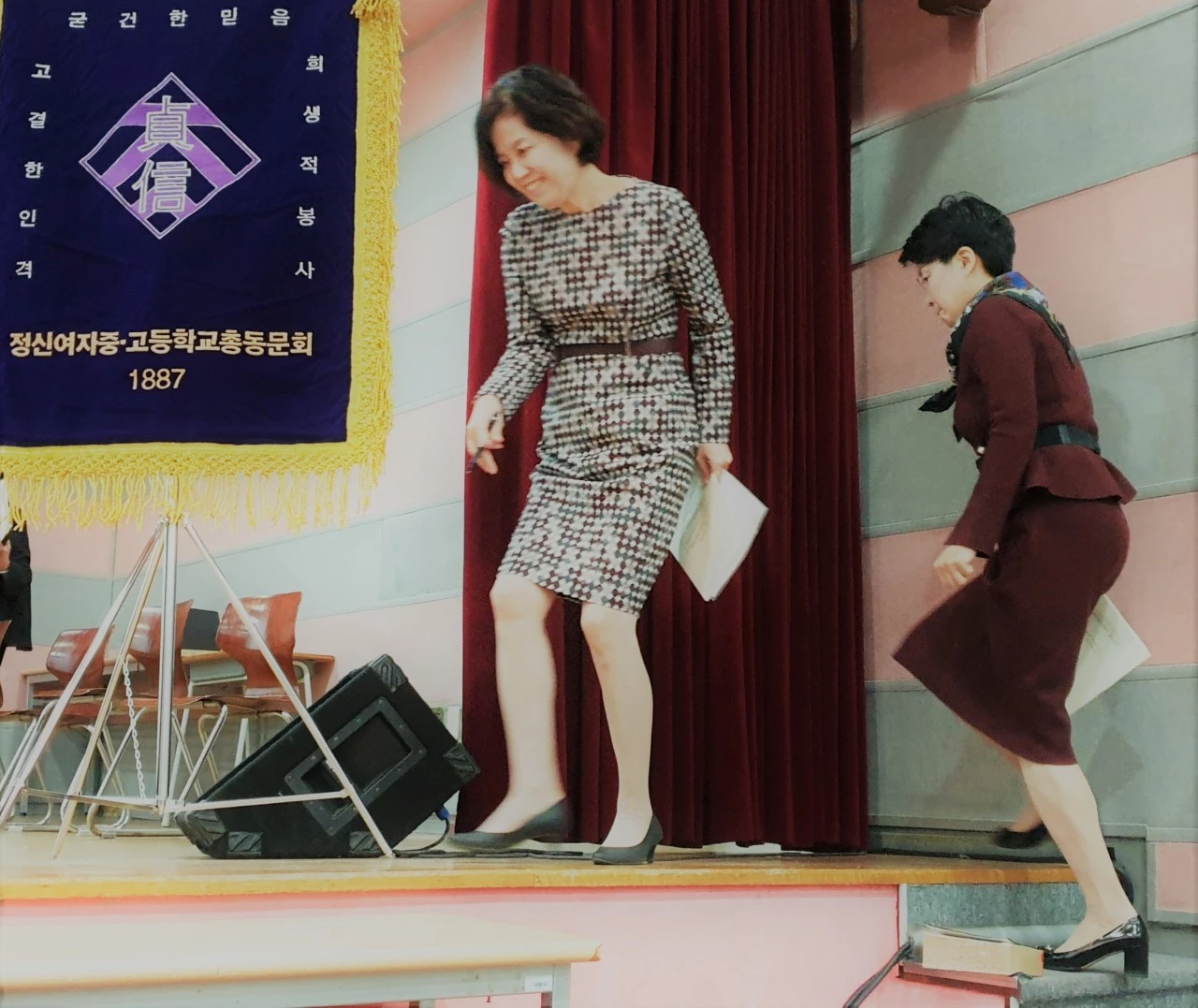 갑자기 등장하는 늘씬한 두 미녀가 있었으니 왼쪽은 67기 박혜성 현직 정신여중 교장이고 오른쪽은 정신여중 63기 최성이 현재 정신여고 교장이다. 이들의 자랑스럽고도 발전된 정신여중고의 소식을 기쁨으로 듣는다. 흐뭇한 일이다.
