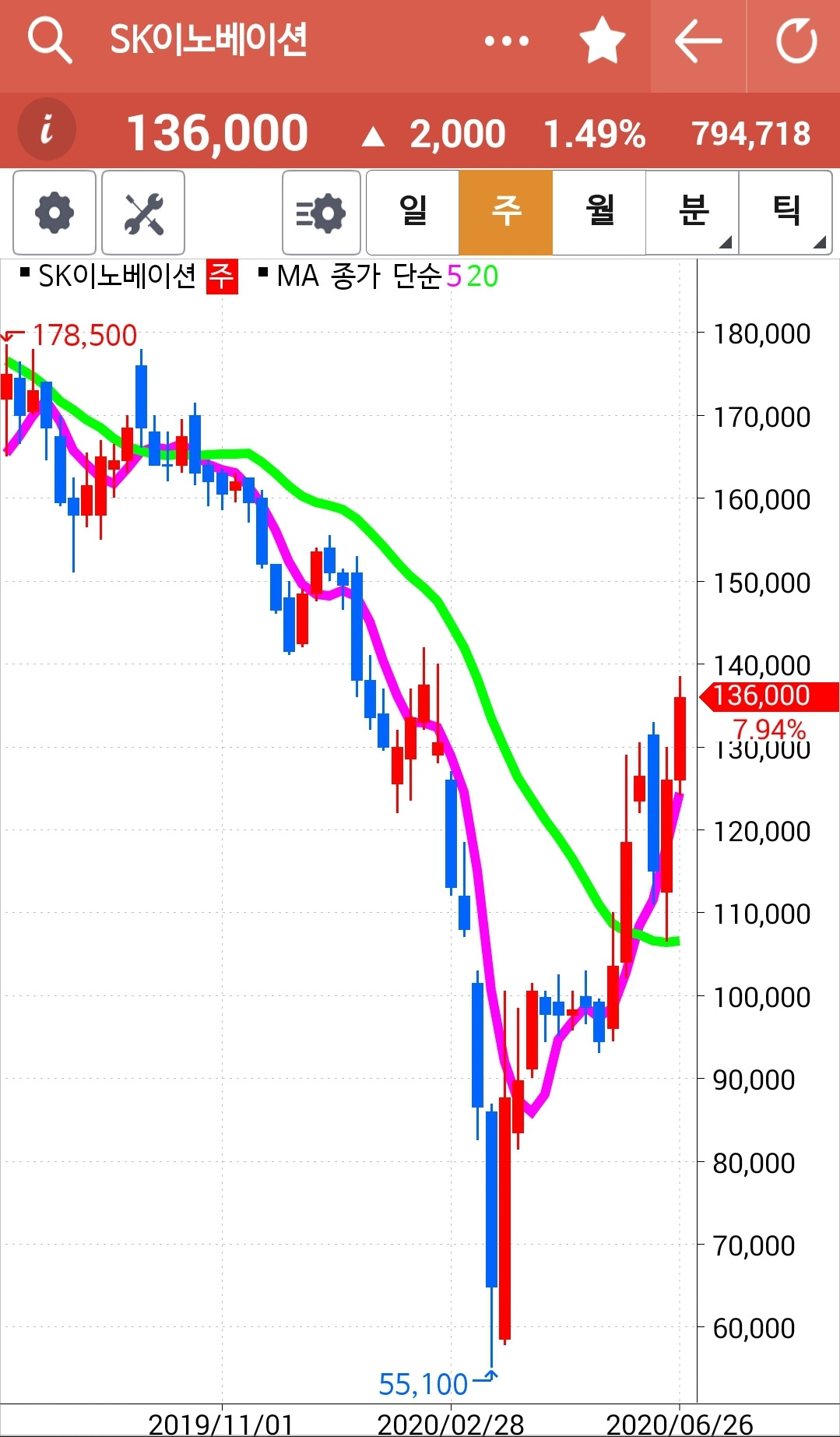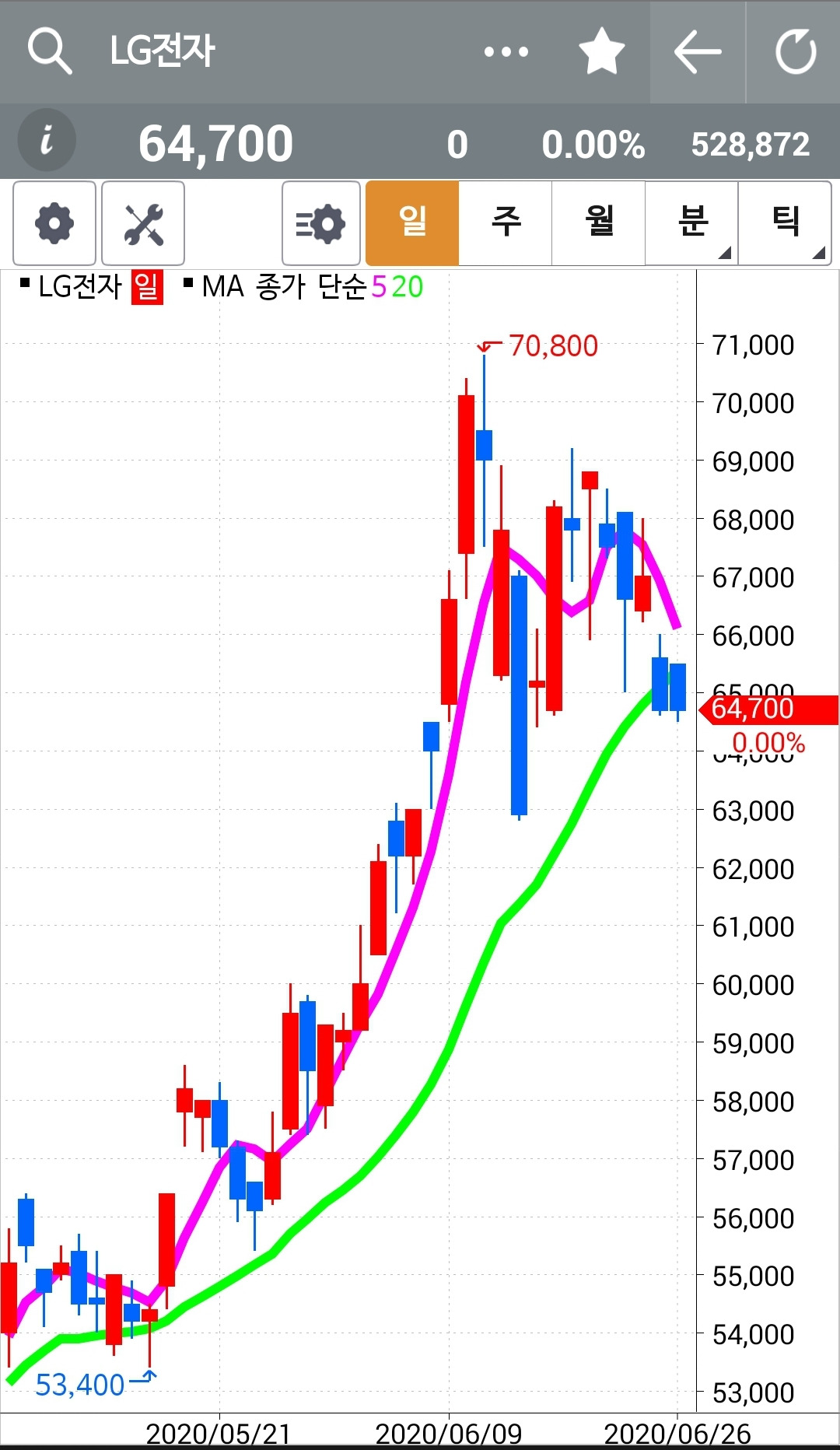 LG전자. 약간 위태위태해진다. 빨리 올라가지 않으면 5일선은 20일선 아래로 곤두박질 칠 듯하다. 예측은 필요 없다. 내려가는 날, 나오면 된다. 오호 주봉에서도 드디어 음봉이 나왔다. 지금까지 무려 5주간 양봉 행진이었다. 오르기도 많이 올랐구나. 쉬어갈 때가 되지 않았을까. 경계심을 가지고 열심히 지켜보자. 세상에 월봉도 4개월째 양봉 중이다. 다음 주 드디어 20일선을 뚫고 내려갈지 정말 궁금하다. 눈에 불을 켜고 지켜볼지어닷.
