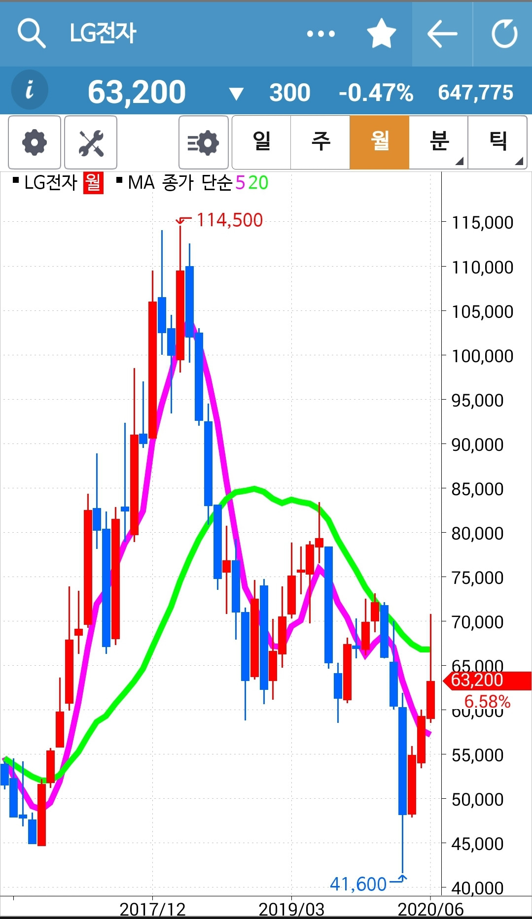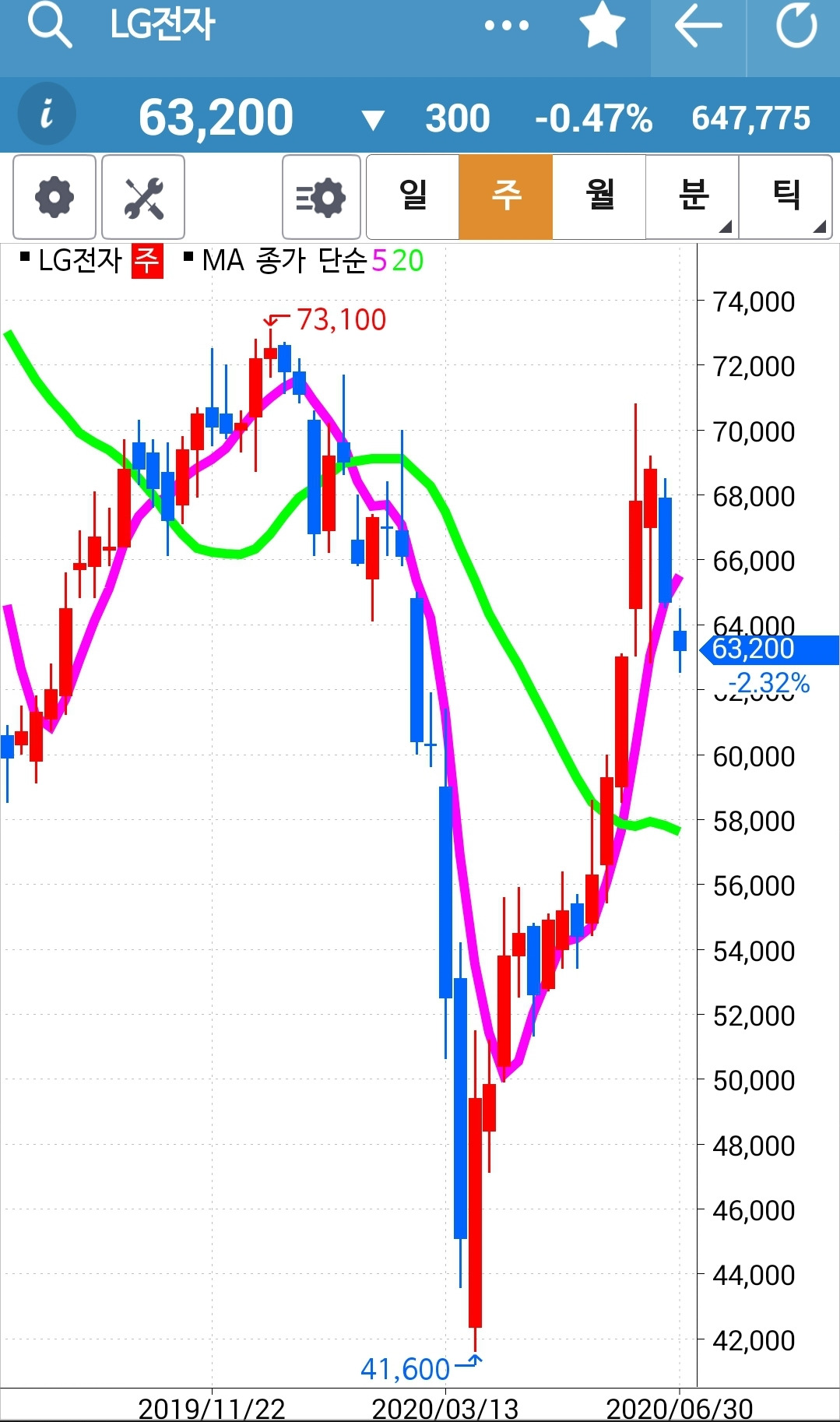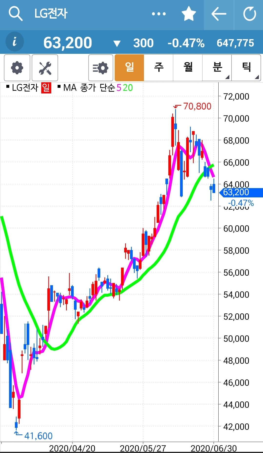 LG전자. 나에게서 탈락된 지 얼마 안 된 종목이라 주식선물로 매도! 를 실행해본 종목. 과연 어찌 될까? 여하튼 내가 아는 것이라곤 딱 하나! 5일선이 20일선 위로 가면 매수! 아래로 가면 매도! 파이팅!!!