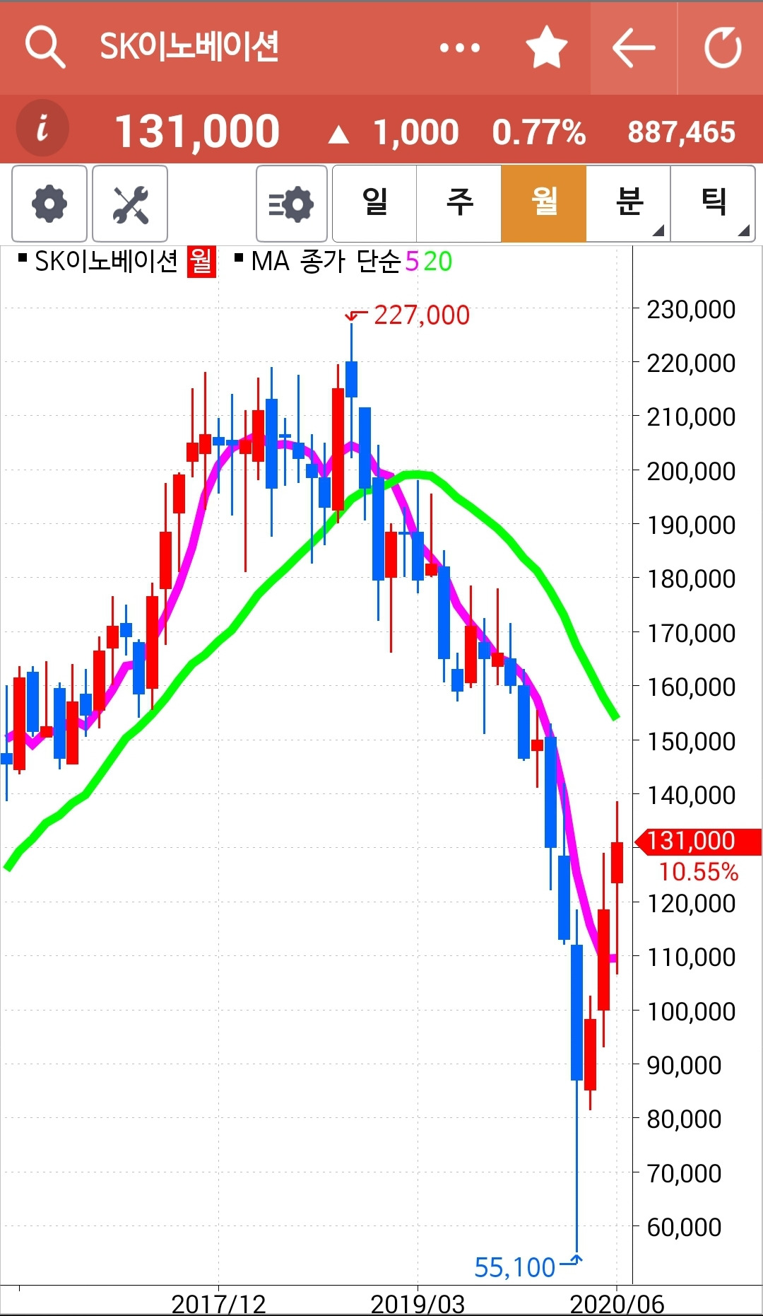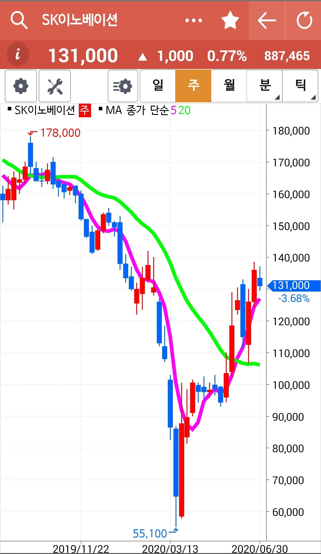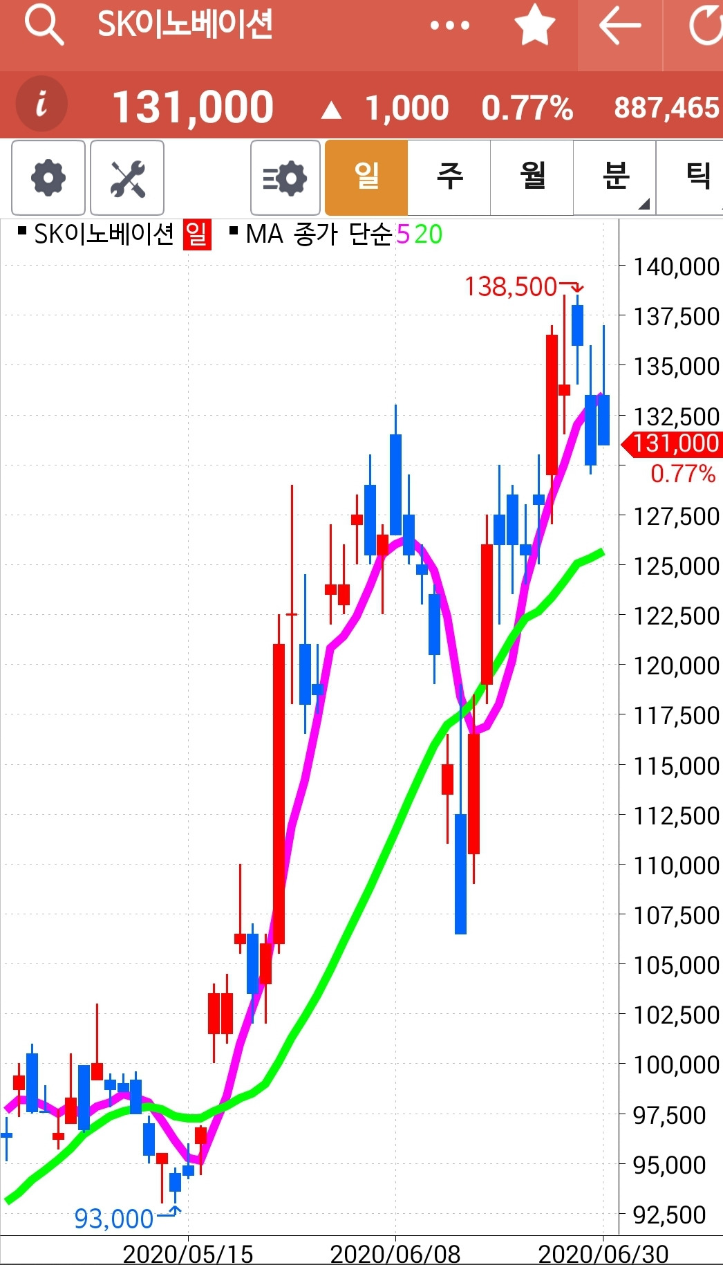 SK이노베이션. 나의 계좌에 살아남은 딱 한 개의 종목이다. 아직은 5일선이 빵빵하게 위에 있으니 걱정할 것 없다. 언제라도 5일선이 20일선 아래로 내려가면 매도한다. 그것만 기억하리라. 파이팅!!!