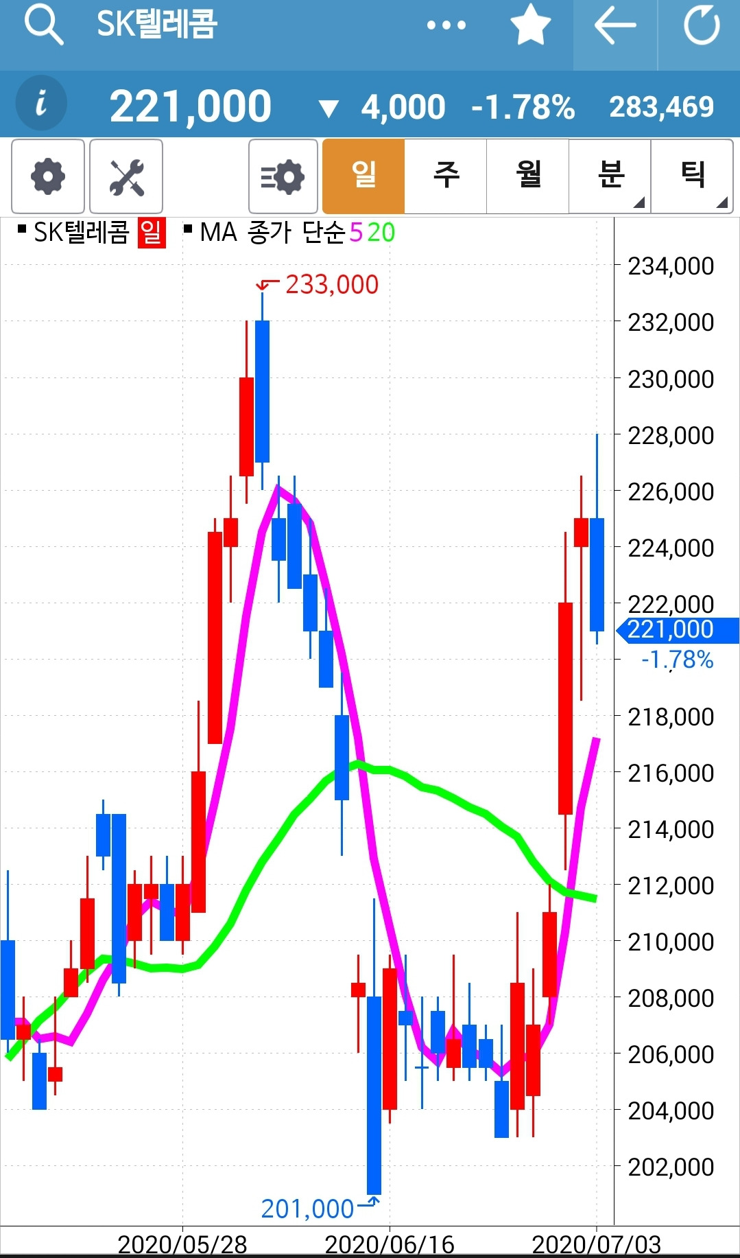 가슴이 철렁! 무려 이천칠백만 원어치나 산 SK텔레콤이 팡팡 내려가고 있다. 철렁! 또 철렁! 그러나 노노노! 난 잘못한 게 없다. 차트를 보라. 5일선이 20일선 위에 있으므로 매수했을 뿐이다. 원칙을 지킨 것이다. 그러므로 가슴이 철렁! 할 이유도 후덜덜덜 온 몸을 떨 필요도 없다. 무엇이 위험하고 무엇이 수익을 주는지 양쪽을 직접 나 스스로 해봐야겠다. 남편 몰래 하는 돈이 딱 천만 원이니 그것 가지고 무언가 효과를 보려면 선물 주식을 해야 하지 않을까 해서 감히 손을 대본 것이다. 떨리는 마음을 현물 주식하듯 그렇게 담담하게 5일선 위면 매수! 5일선 아래면 매도! 딱 그것만 행해보는 거다. 실패하면? 성공하겠지. 음하하하 와이? 실패는 성공의 어머니니까. 운명아 비켜라 내가 나간다. 실패를 두려워않는 여자! 푸하하하