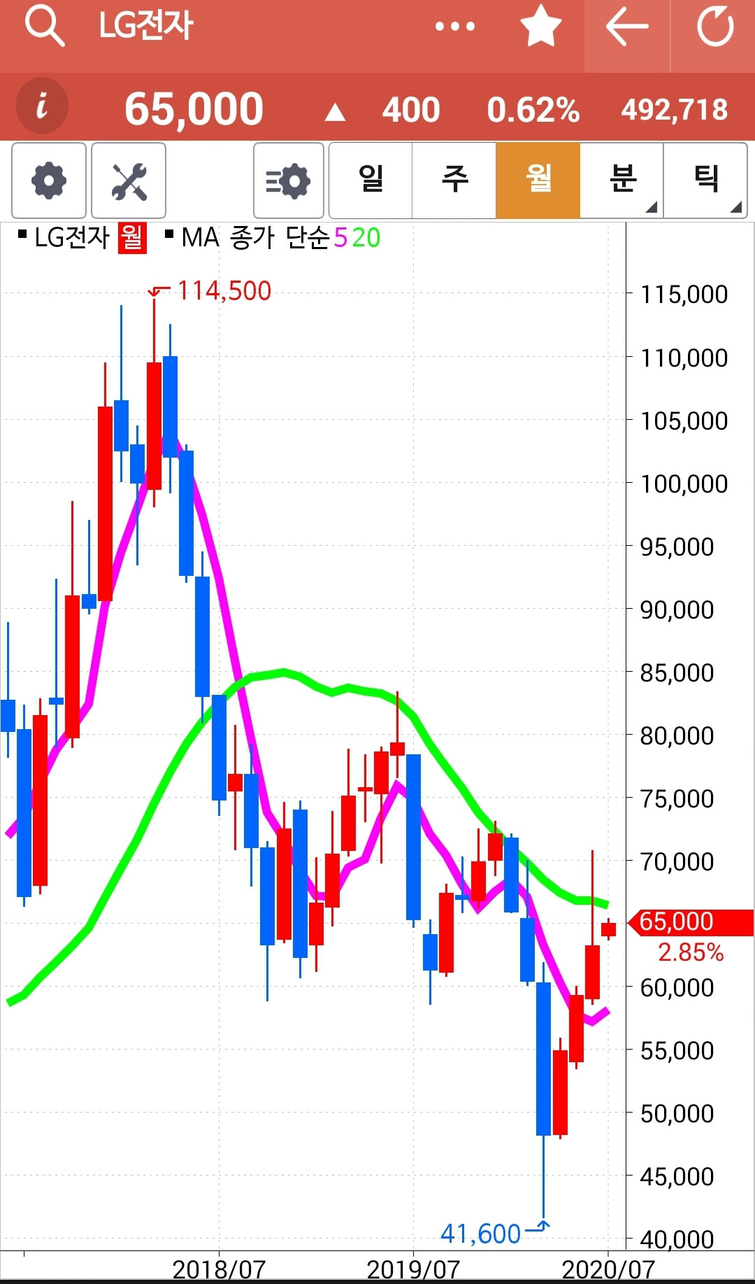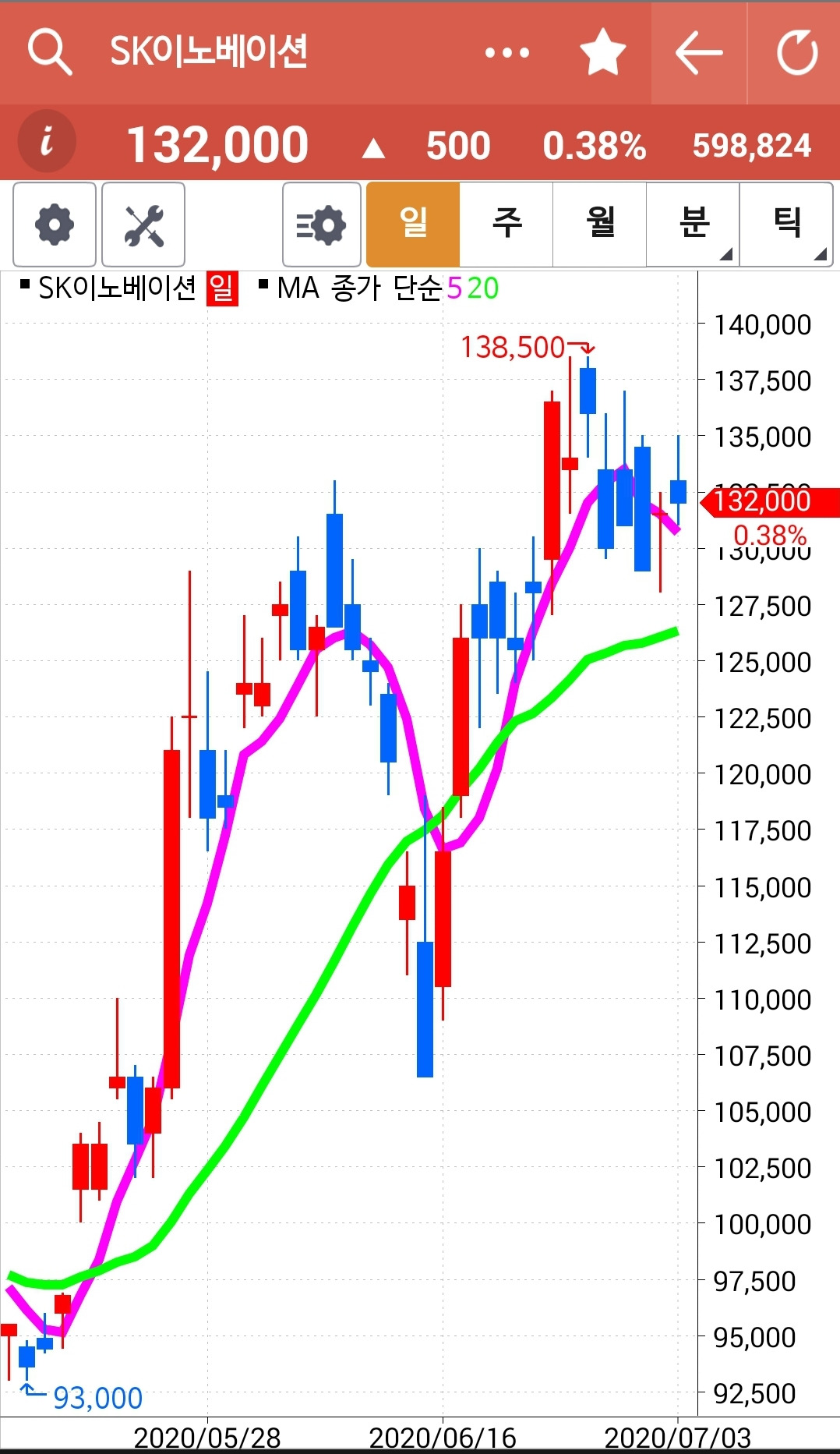 5일선이 내려와 매도한 이 종목은 호시탐탐 다시 올라갈 기회를 노리고 있다. 이것도 두 눈 부릅뜨고 지켜보다가 5일선이 20일선을 뚫고 올라가는 날, 매수하리라. 그때까진 매도 유지! 오케이.
