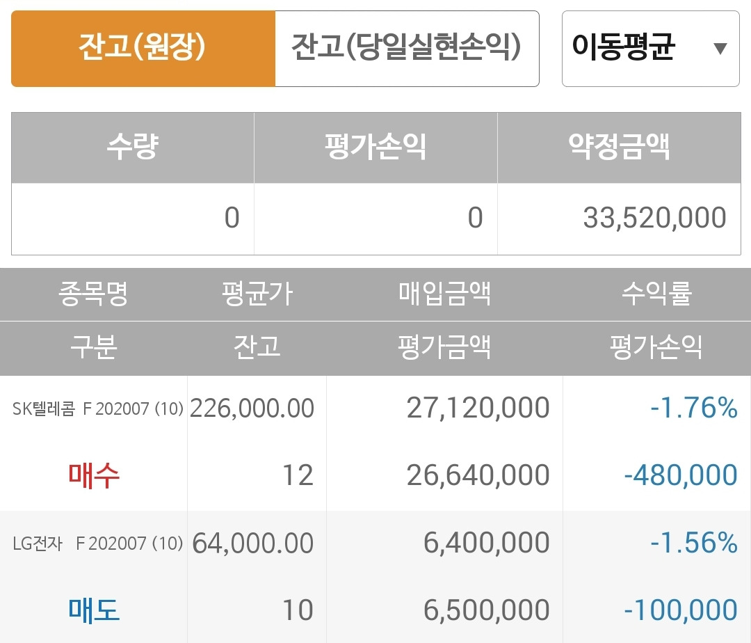 사진 1: 선물 주식 계좌. 역시 레버리지가 높으니 손실도 크다. 더욱 철저히 원칙을 지켜야겠다. 파이팅.