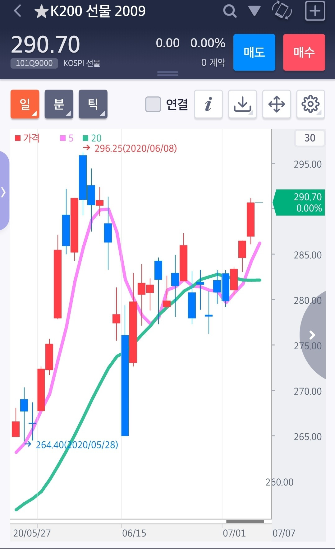 고생이 이만저만이 아니다. 6월 27일에 분명히 5일선이 20일선 아래로 갔기에 난 매도를 했다. 그런데 수익은커녕 손실을 크게 주고 오늘 다시 빵! 올라 5일선이 20일선을 뚫어버렸다. 아흑. 난 매도를 정리하고 새롭게 매수 포지션을 취해야만 했다. 재빨리 재빨리. 얼마나 손실일까? 6월 27일에 281.65에 매도하고 오늘 7월 6일 290.70에 환매했으니 290.7-281.65=9.05 포인트. 여기에 25만 원을 곱하니 2,262,500원의 손실이다. 아흑. 그래도 나무라지 않는다. 와이? 원칙을 지켰기 때문이다. 원칙이 틀렸다면 모를까 난 잘못한 거 그야말로 1도 없다. 음하하하 어디. 내가 어떻게 매도를 했는가 그때를 살짝 볼까?