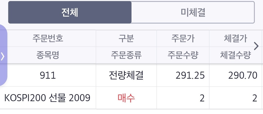 5일선이 20일선 위로 올라간 것을 확인한 순간! 이 아니라 동시호가 시간까지 기다려서 넉넉한 가격에 매수 2개 주문을 넣는다. 와이? 매수 1개는 가지고 있는 매도분 환매수용이고 또 매수 1개는 새롭게 매수 포지션을 취하기 위함이다. 넉넉한 가격이라니 얼마? 사진 2에서 보듯 291.25에 주문을 넣었고 290.70에 거래되었다. 이것이 또 아래로 파팍 고꾸라져 수익 대신 손실을 준다면? 그러면 실패겠지. 실패는 성공의 어머니이고. 푸하하하 걱정할 거 하나 없다는 이야기다. 난 원칙만 지켜내리라. 그게 손해 나는 건 나도 어쩔 수가 없다. 와이? 난 기계니까. 음하하하하하 어디 나에게 손실을 팍 안겨준 그 못된 놈의 차트를 볼까?
