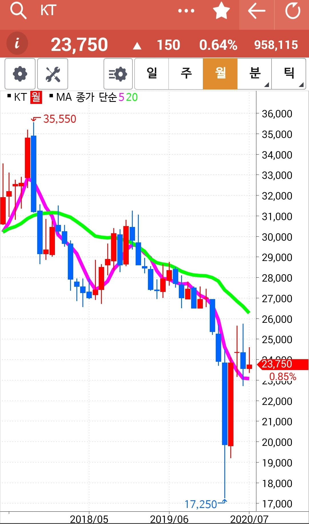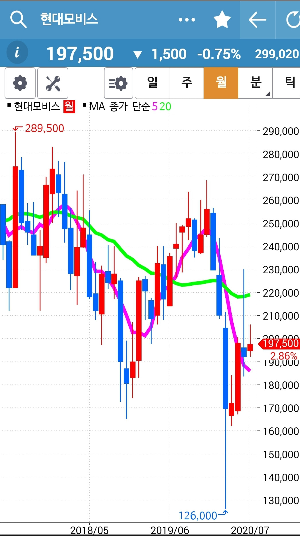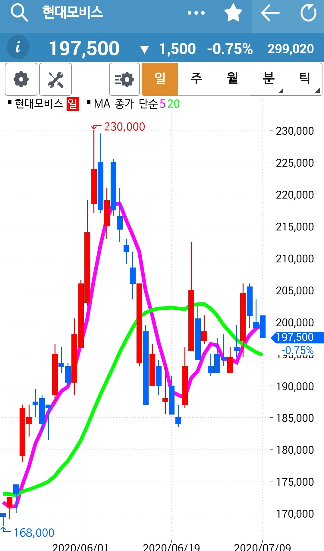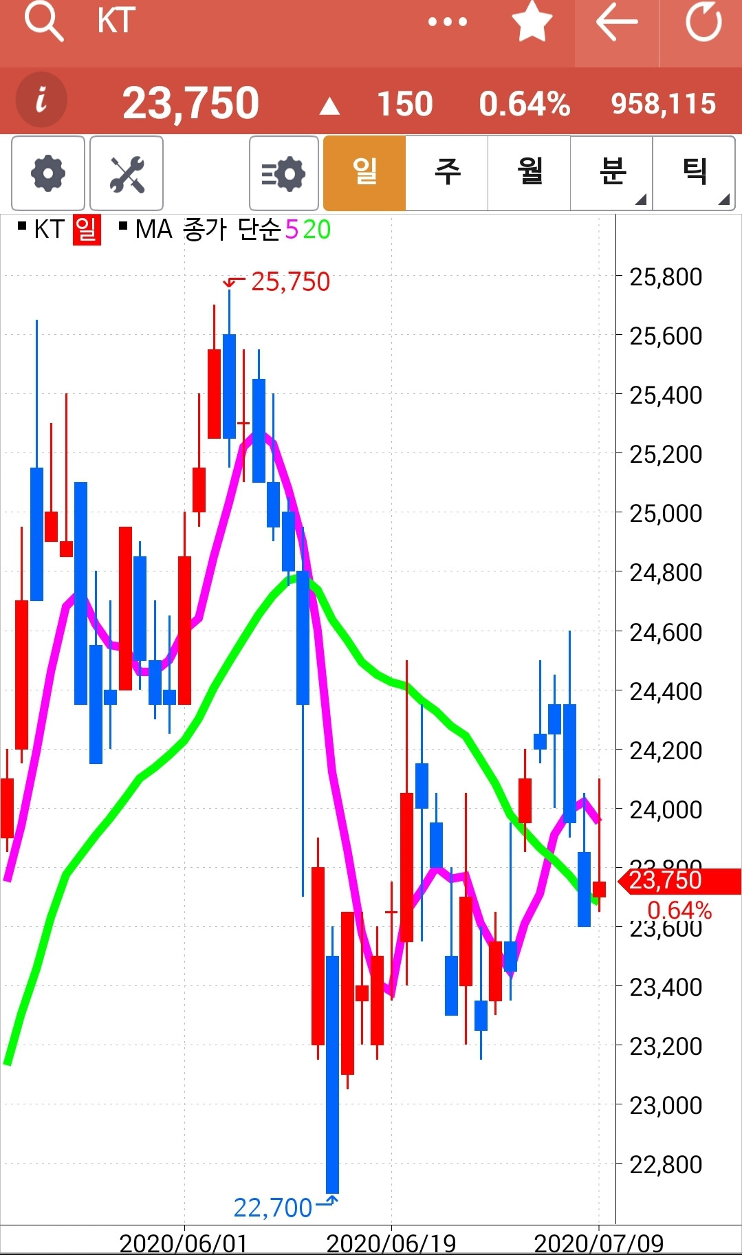 앗 깜짝이야. 5일선이 아래인데 왜 있지? 하고 보니 하하 맨 앞의 사진이 일봉이 아닌 월봉. 아무리 일봉을 이 곳에 끌어놓으려해도 움직이질 않는다. 왜그런지 모르겠다. 첫찌가 좋은가보다. 어쨌든 맨 끝 일봉의 5일선이 위에 있으므로 매수 유지.