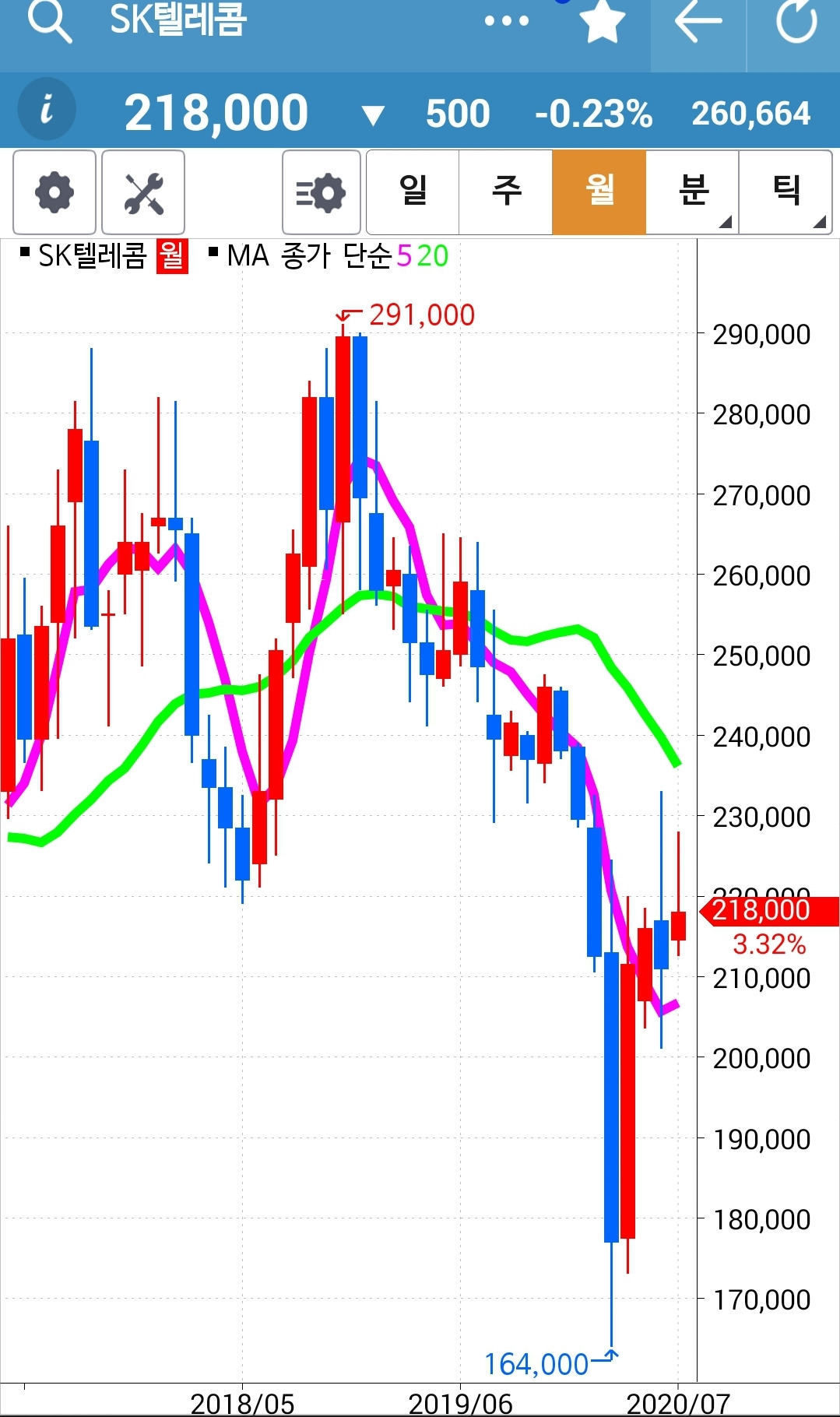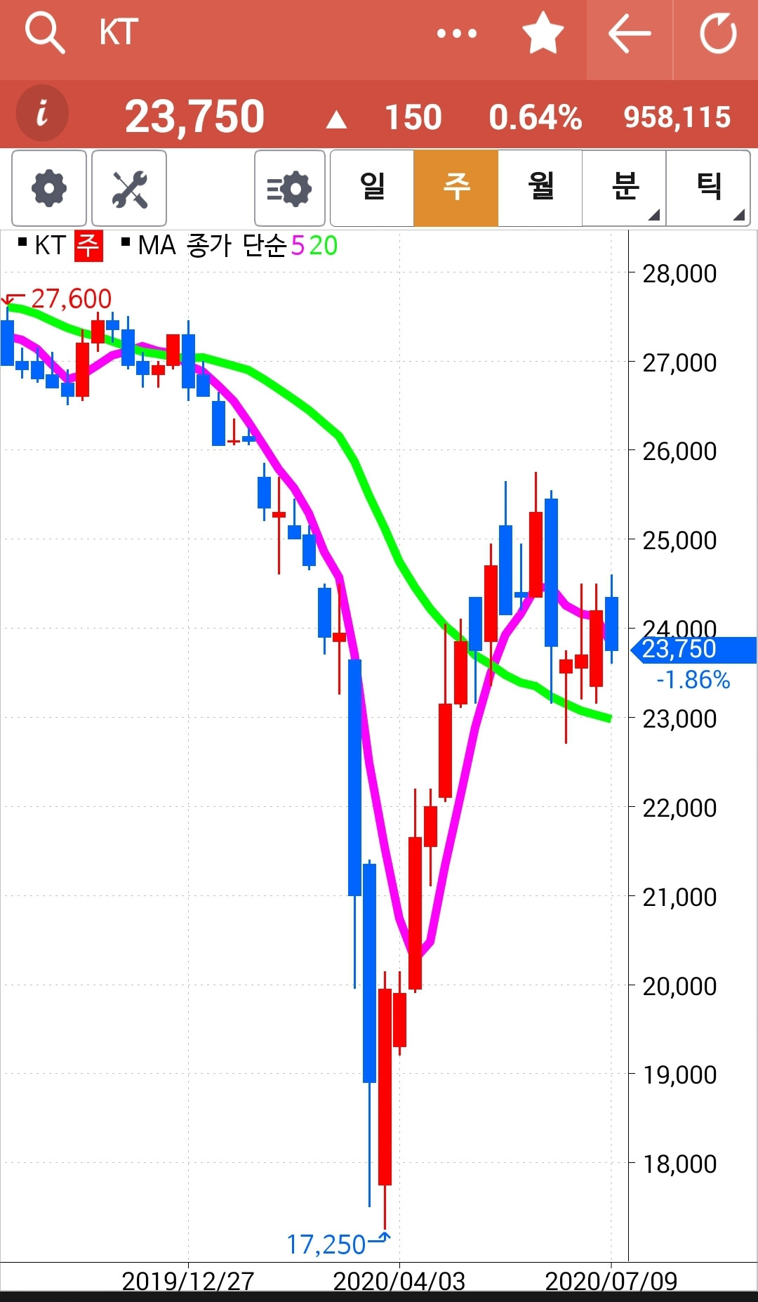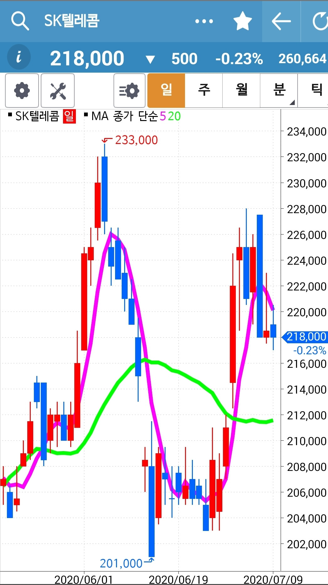 앗 깜짝이야. 5일선이 아래인데 왜 있지? 하고 보니 하하 맨 앞의 사진이 일봉이 아닌 월봉. 아무리 일봉을 이 곳에 끌어놓으려해도 움직이질 않는다. 왜그런지 모르겠다. 첫찌가 좋은가보다. 어쨌든 맨 끝 일봉의 5일선이 위에 있으므로 매수 유지.