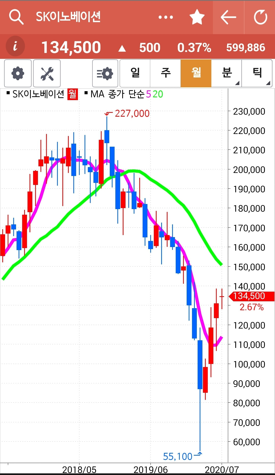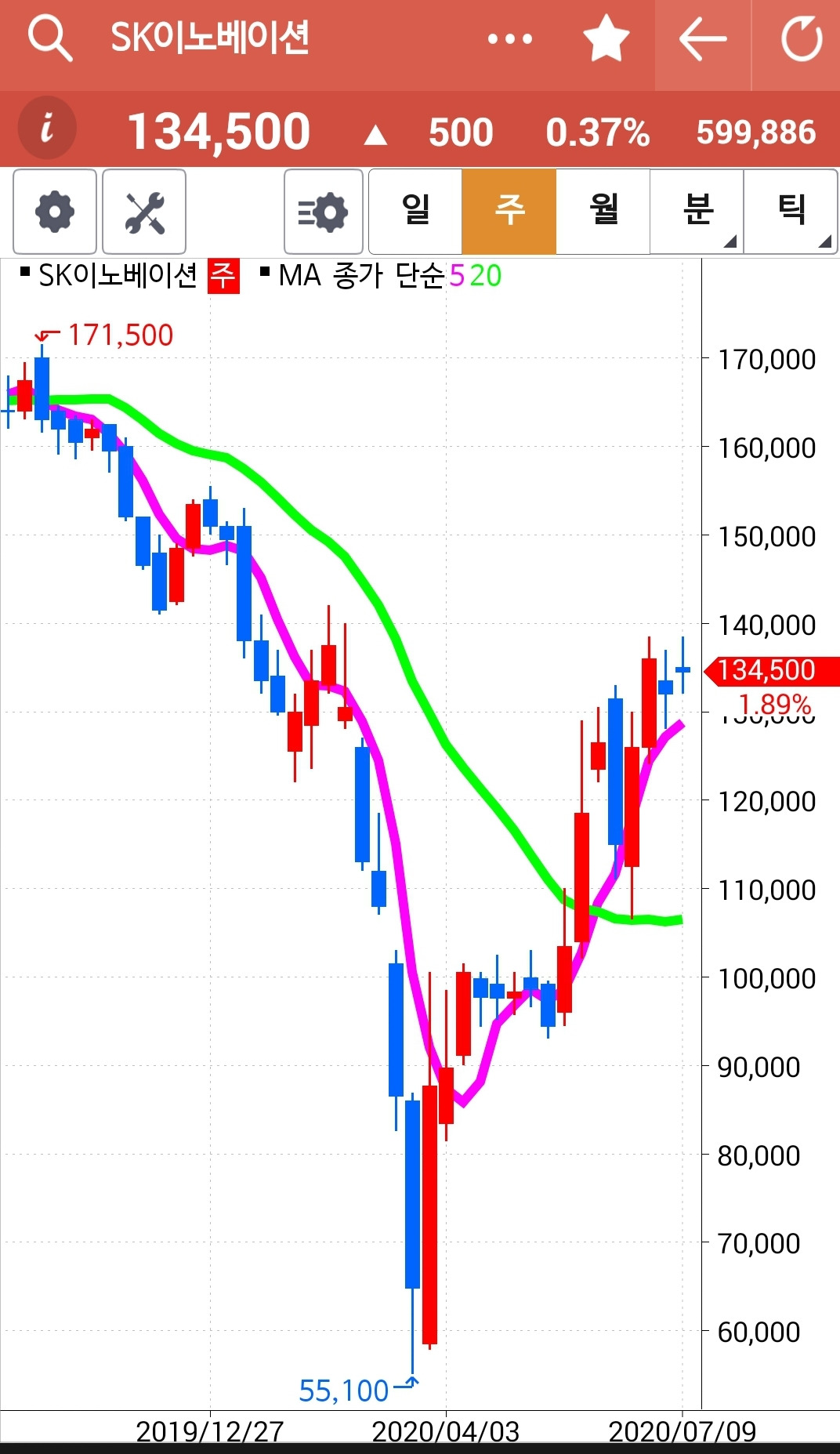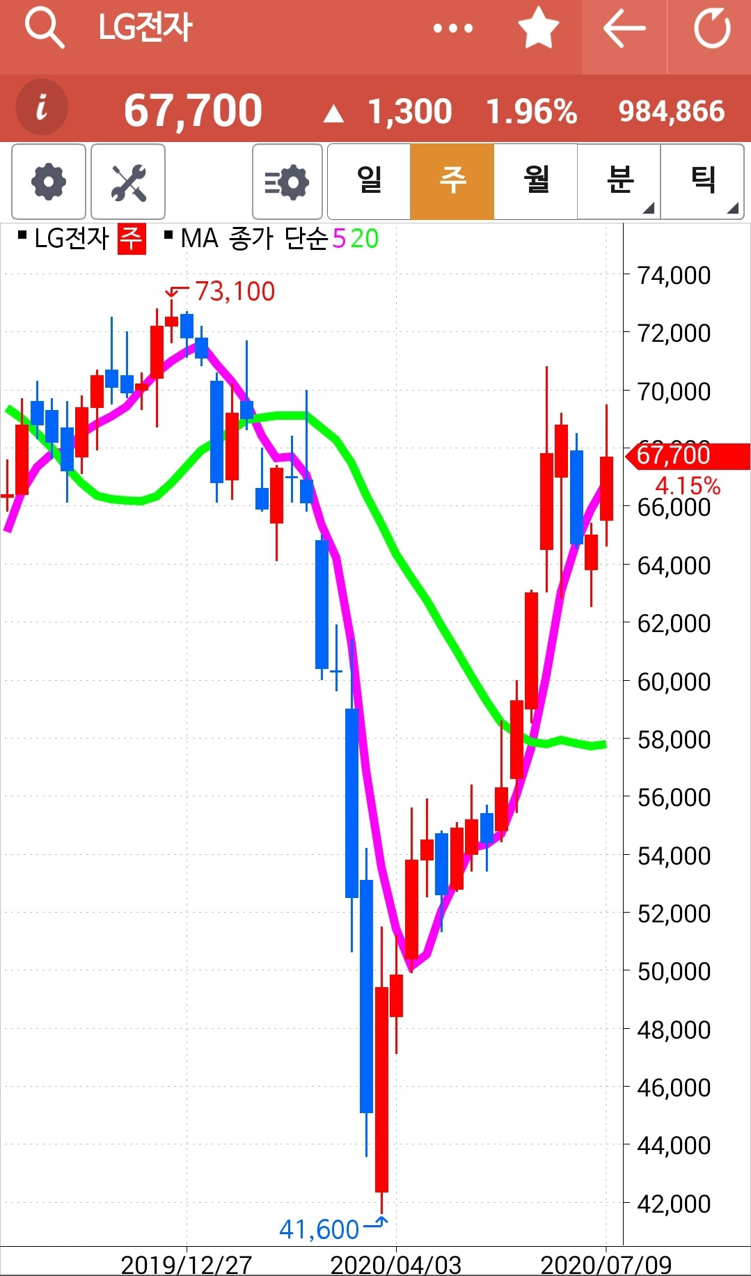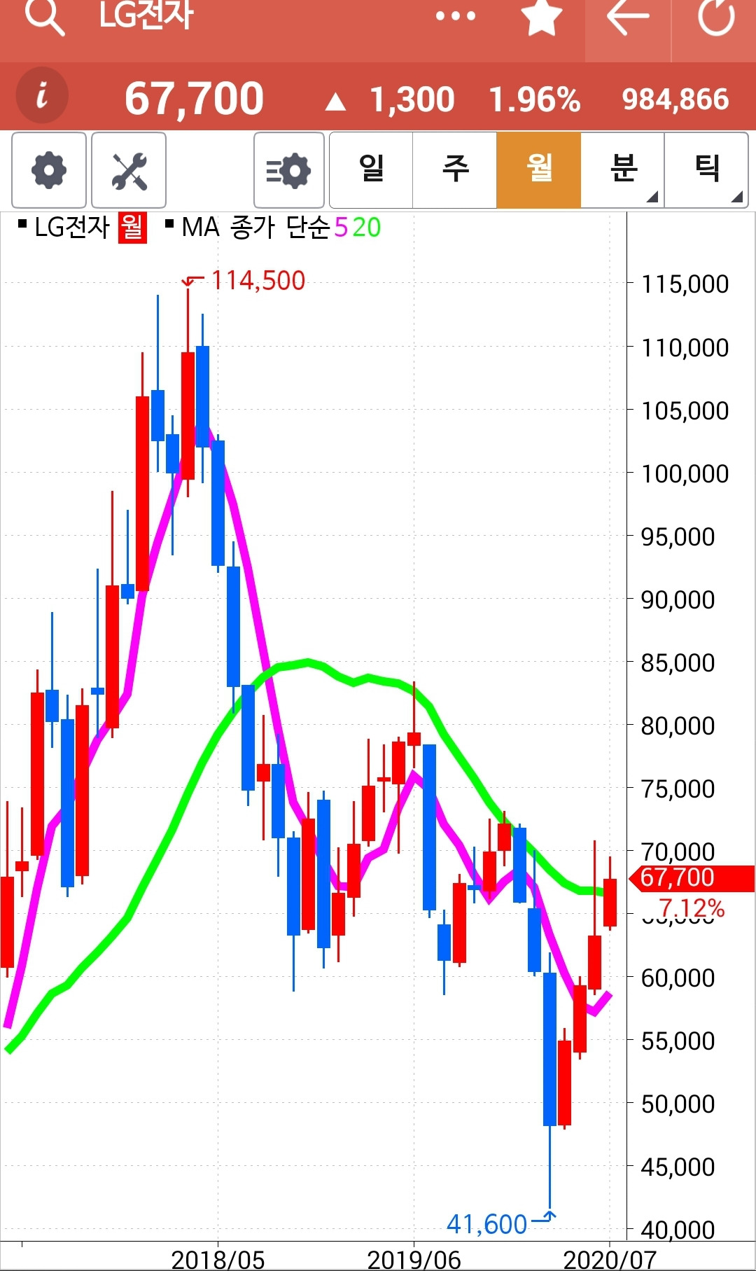 앗 깜짝이야. 5일선이 아래인데 왜 있지? 하고 보니 하하 맨 앞의 사진이 일봉이 아닌 월봉. 아무리 일봉을 이 곳에 끌어놓으려해도 움직이질 않는다. 왜그런지 모르겠다. 첫찌가 좋은가보다. 어쨌든 맨 끝 일봉의 5일선이 위에 있으므로 매수 유지.