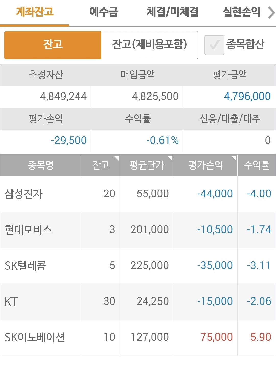 사진1: 현물 주식 잔고다. 15만원 정도의 손실. 관심종목중 새롭게 편입해야할 종목들이 눈에 띄지만 돈이 더 없다. 그렇다고 실험하는 처지에 돈을 더 투하할 수도 없다. 탈락자 생길때마다 넣어줄 밖에.