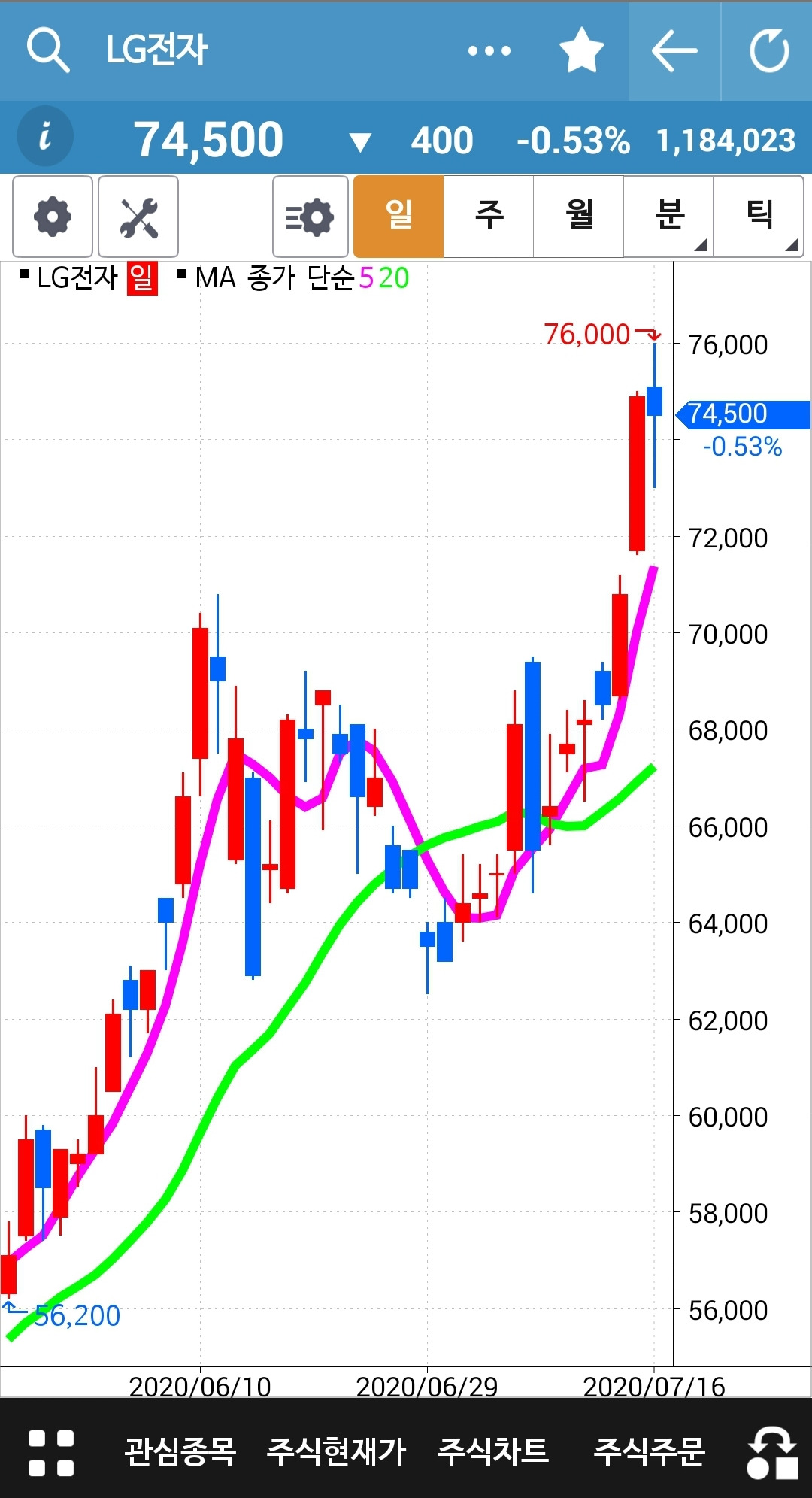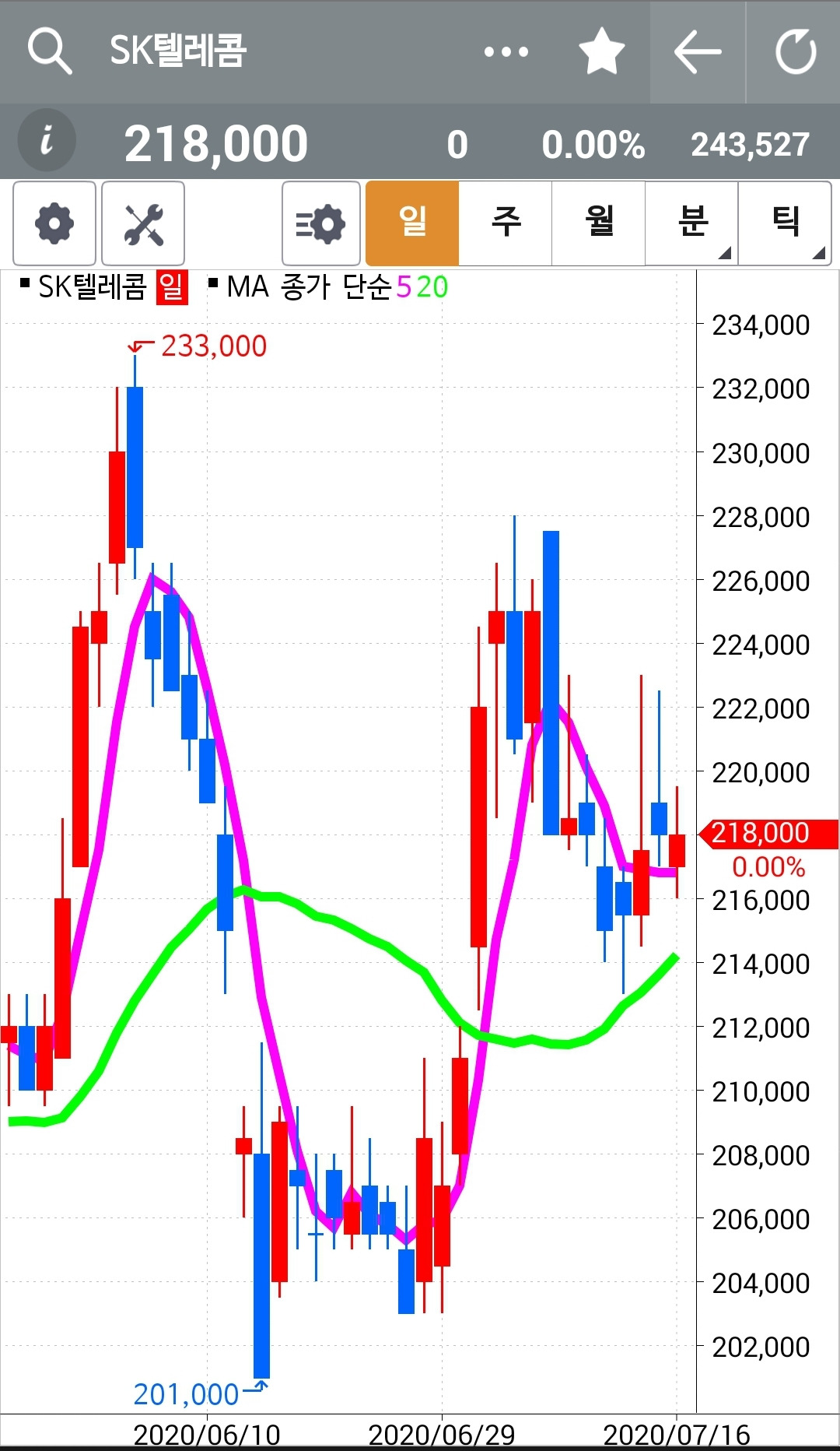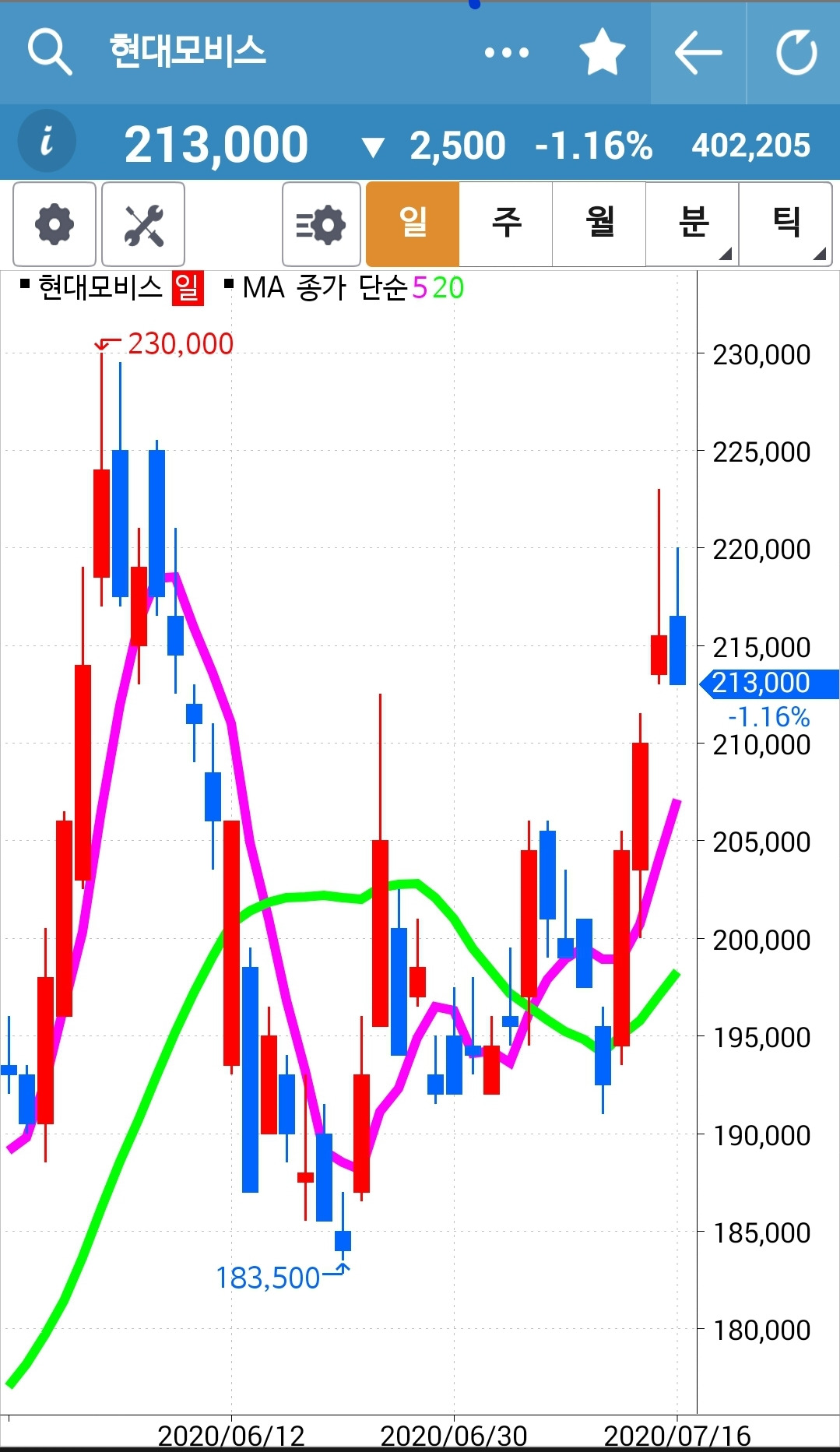 한 고집하는 나는 아무리 올라도 5일선이 내려오지 않는 한 이익실현을 하지 않는다. 하하 그 잠깐의 일탈이 다른 일탈을 불러올 수 있기 때문이다. 목에 칼이 들어와도 지켜야 되는 나만의 원칙. 5일선이 20일선 위면 매수! 아래면 매도! 파이팅!