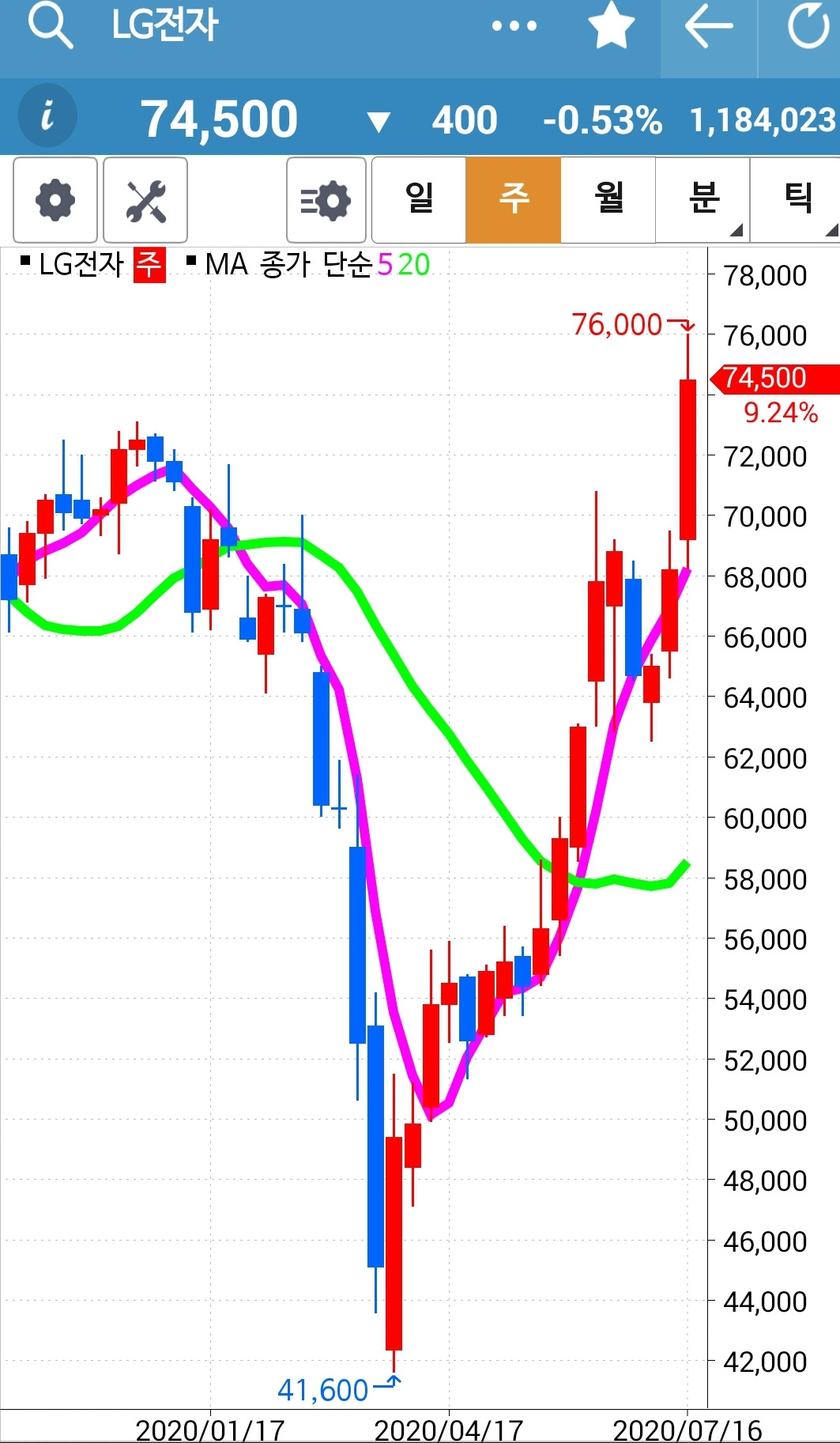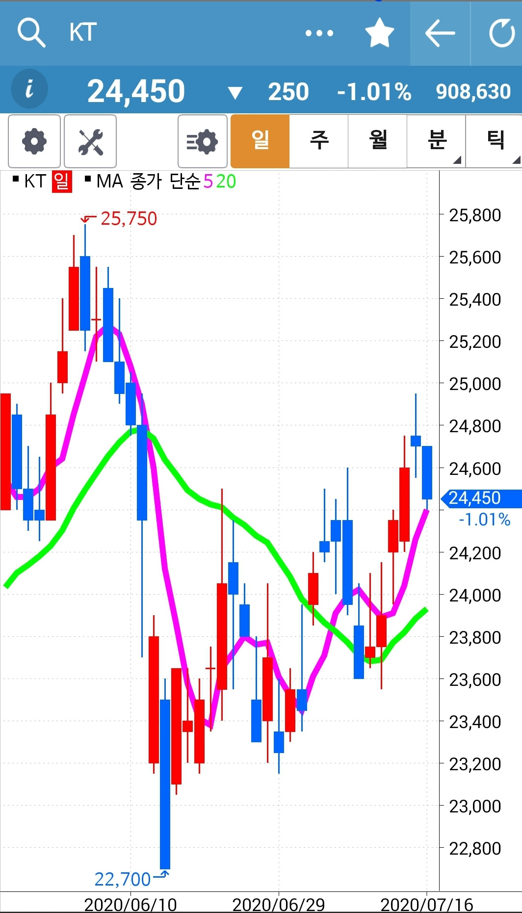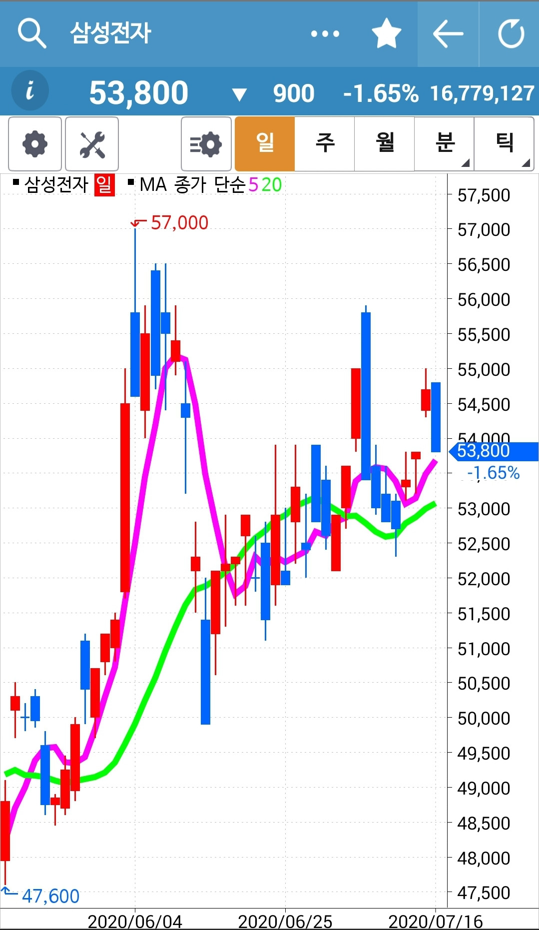 한 고집하는 나는 아무리 올라도 5일선이 내려오지 않는 한 이익실현을 하지 않는다. 하하 그 잠깐의 일탈이 다른 일탈을 불러올 수 있기 때문이다. 목에 칼이 들어와도 지켜야 되는 나만의 원칙. 5일선이 20일선 위면 매수! 아래면 매도! 파이팅!