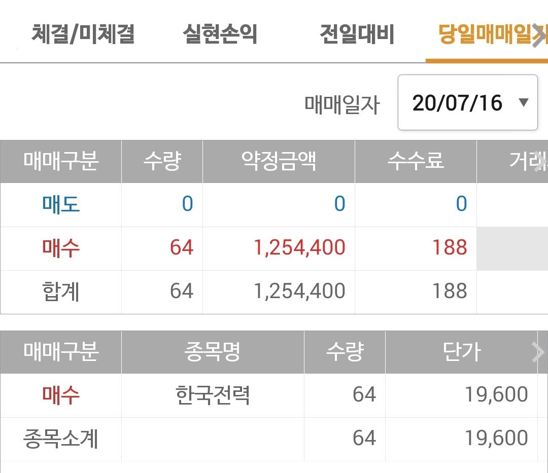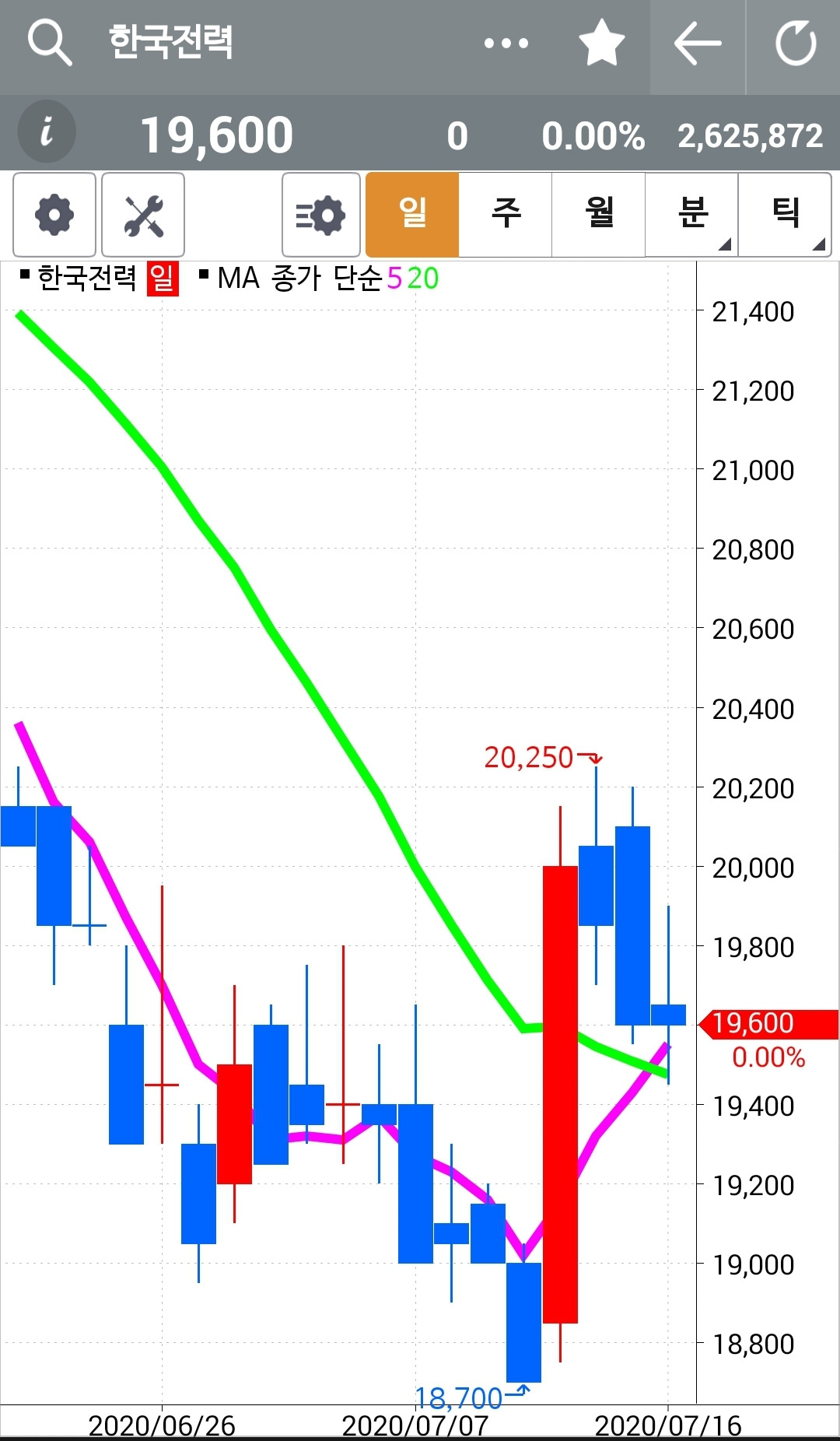 사진 3: 한국전력의 5일선이 20일선 위로 왔고 어제 탈락자가 있어 돈이 있기에 매수했다. 오백만 원을 현물 주식과 선물 주식 똑같이 나의 원칙대로 운영하여 무엇이 수익을 주는지 지켜보려 한다.