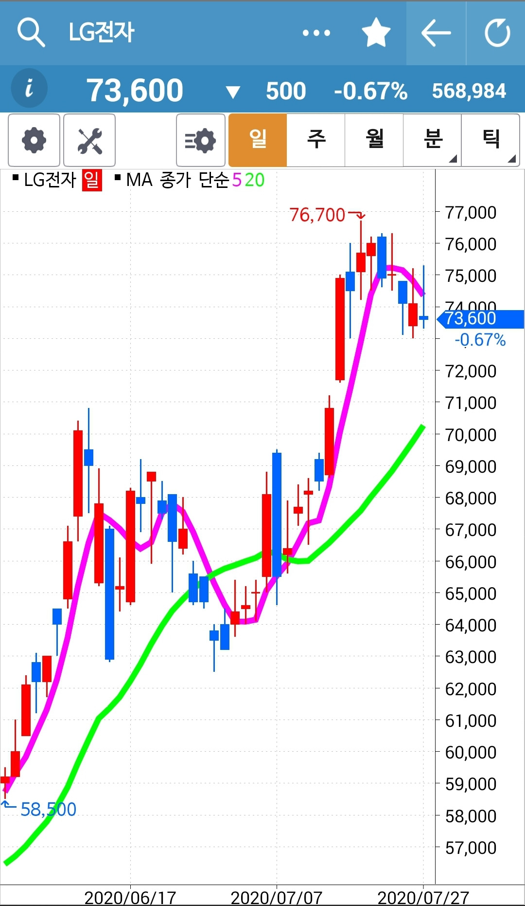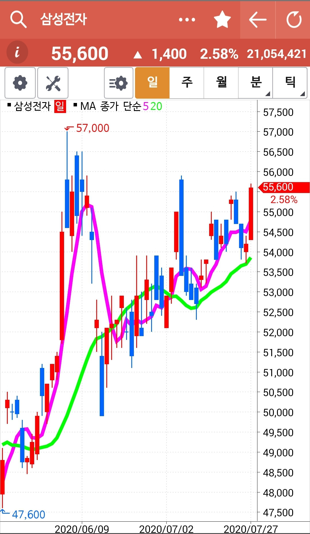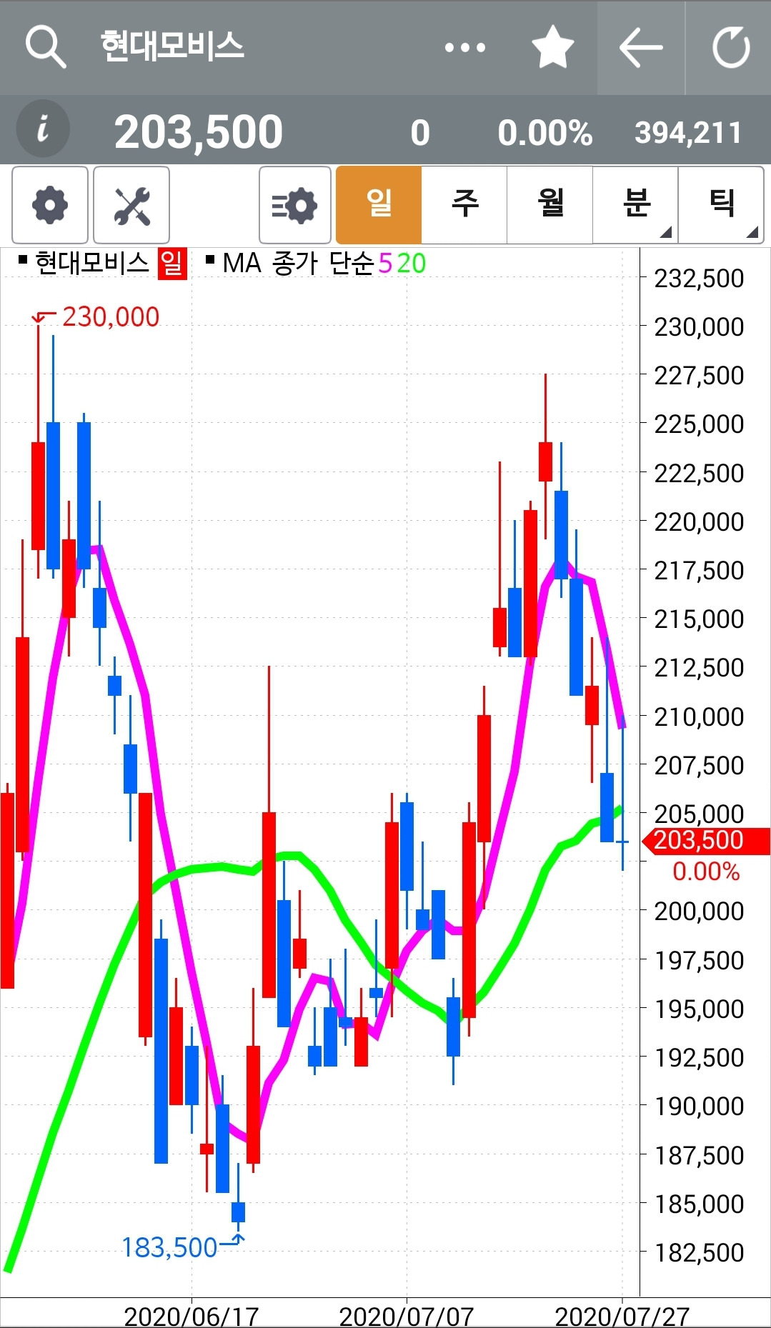 5일선이 20일선 위에 있지만 조정을 받아 다시 20일선 근처까지 왔다는 것이 바로 이 종목을 고른 이유인데 생각해보니 내려오는 그림을 선택한 꼴이 되었다. 그건 아닌가 보다. 빵 뚫고 올라가는 걸 사야지. 음. 다시 종목 선정 시 이렇게 20일선 근처라고 사는 일은 하지 말자. 20일선을 뚫고 올라가는 걸 사도록 하자. 내려가는 건 계속 내려가려 할 테니까. 어쨌든 내려가는 그림은 금물!!! 기다려서라도 높게 주고 사더라도 이 내려가던 방향이 위로 턴할 때 사는 걸로 하자꾸나. 파이팅!!!