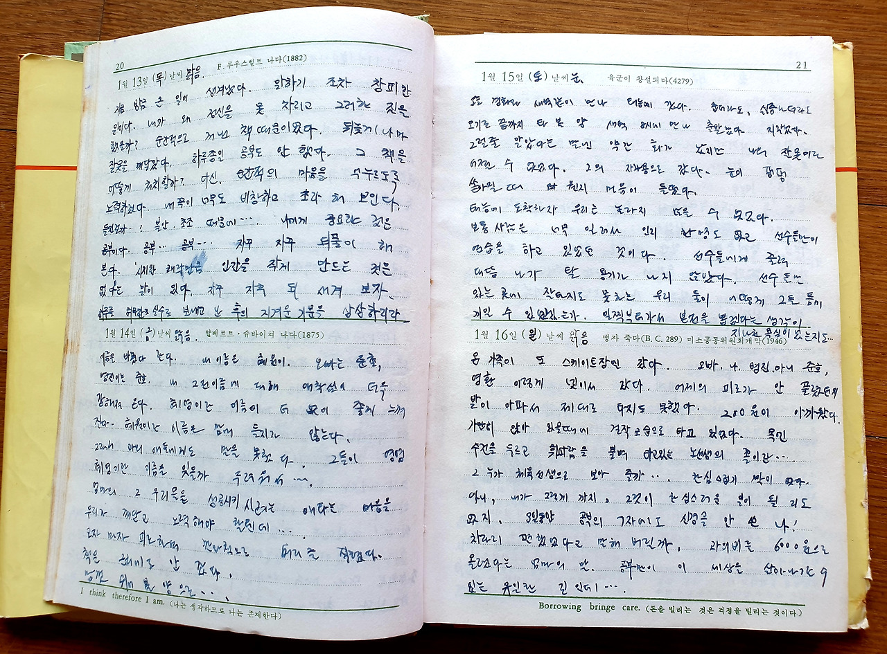 지금 방금 큰일이 생겨났다. 말하기 조차 창피한 일이다. 내가 왜 정신을 못 차리고 그러한 짓을 했을까? 순간적으로 꺼낸 책 때문이었다. 뒤늦게나마 잘못을 깨달았다. 하루 종일 공부도 안 했다. 그 책을 어떻게 처치할까? 다신, 순간적의 마음을 억누르도록 노력하겠다. 내 꼴이 너무도 비참하고 초라해 보인다. 들킨 걸까...! 불안, 초조 때문에... 나에게 중요한 것은 공부이다. 공부... 공부... 자꾸자꾸 되풀이해본다. '시시한 쾌락만큼 인간을 작게 만드는 것은 없다.'는 말이 있다. 자꾸자꾸 되새겨 보자. 하루를 허무한 실수로 보내고 난 후의 지겨운 기분을 상상하리라.