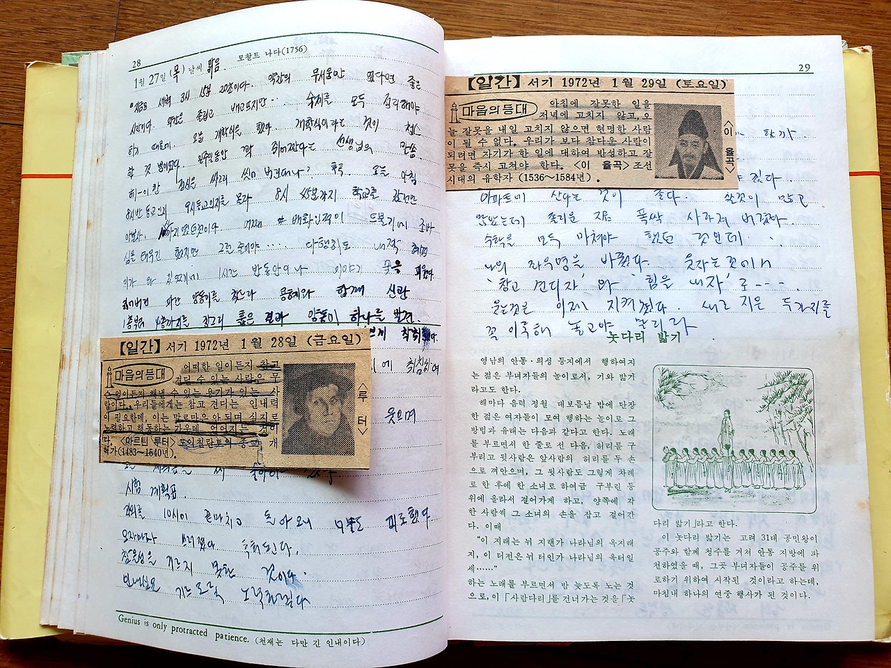 서기 1972년 1월 28일 (금요일) 마음의 등대: 어떠한 일이든지 참고 견딜 수 있는 사람은 무슨 일이든지 해낼 수 있는 용기가 있는 사람이다. 우리들에게는 참고 견디는 인내력이 필요한데, 이는 말로만은 안 되며 실지로 노력하고 행동하는 가운데 얻어지는 것이다. <마르틴 루터> 도이칠란트의 종교 개혁가 (1483 ~ 1540)