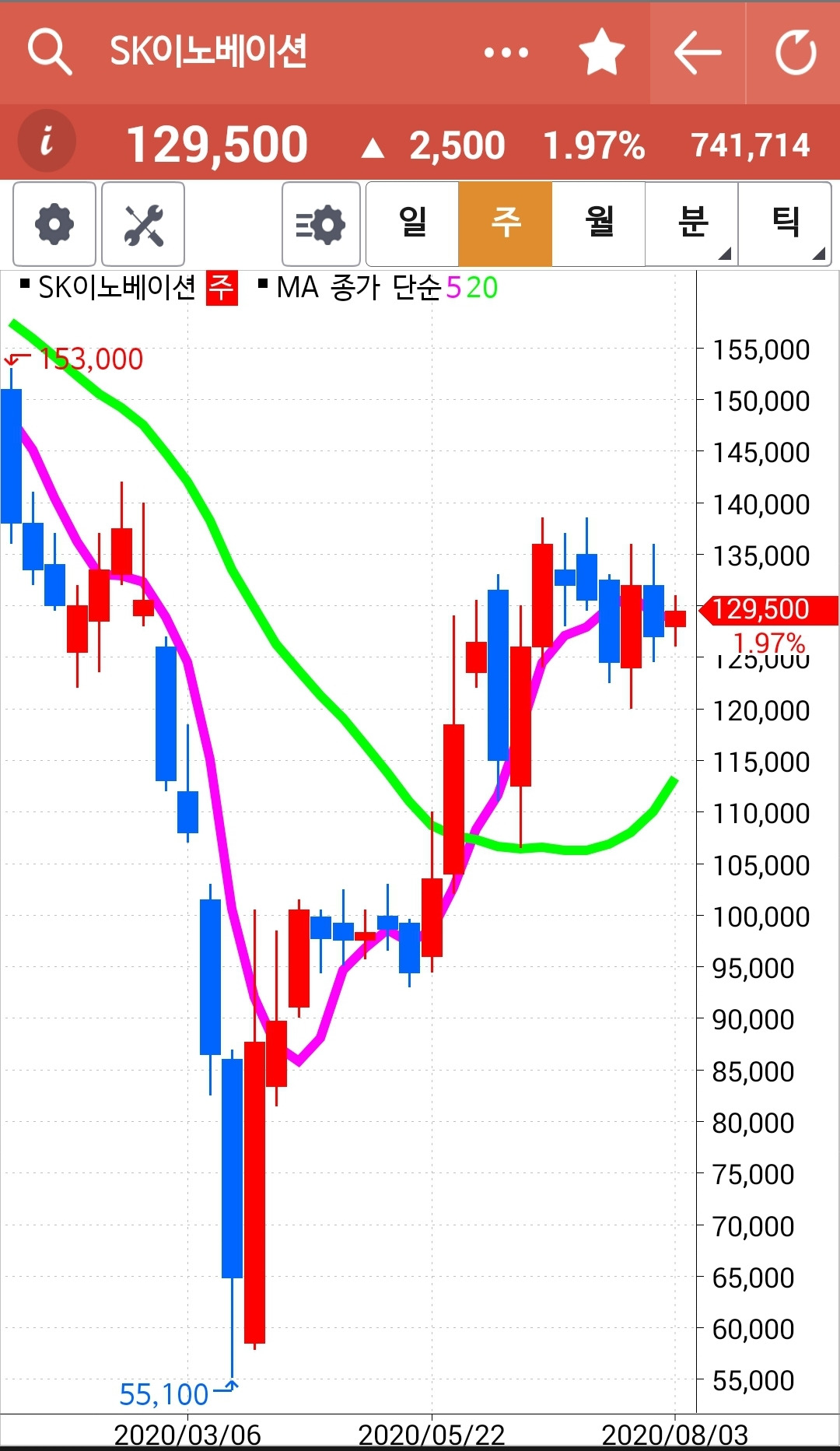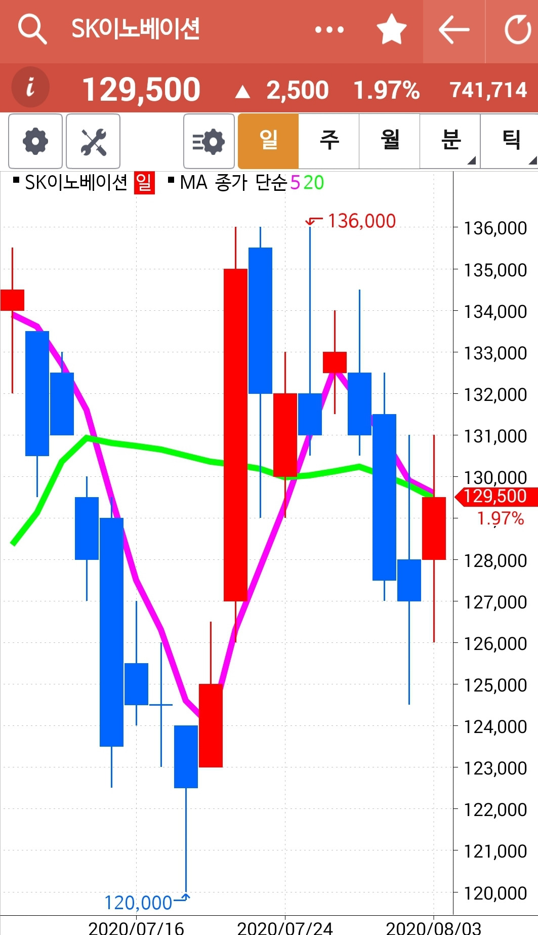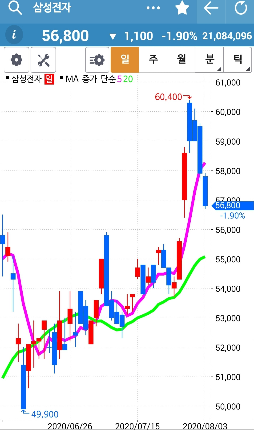 캬~ 얼마나 멋진 모양인가. 쑥! 쑤욱! 하하 거의 네 봉을 까부수는 힘찬 용트림. 5일선이 20일선을 뚫고 내려갈까 말까 한 순간에 빵! 푸하하하 멋지다. 난 따라가리라. 파이팅!!! 내 너를 사랑하노라.