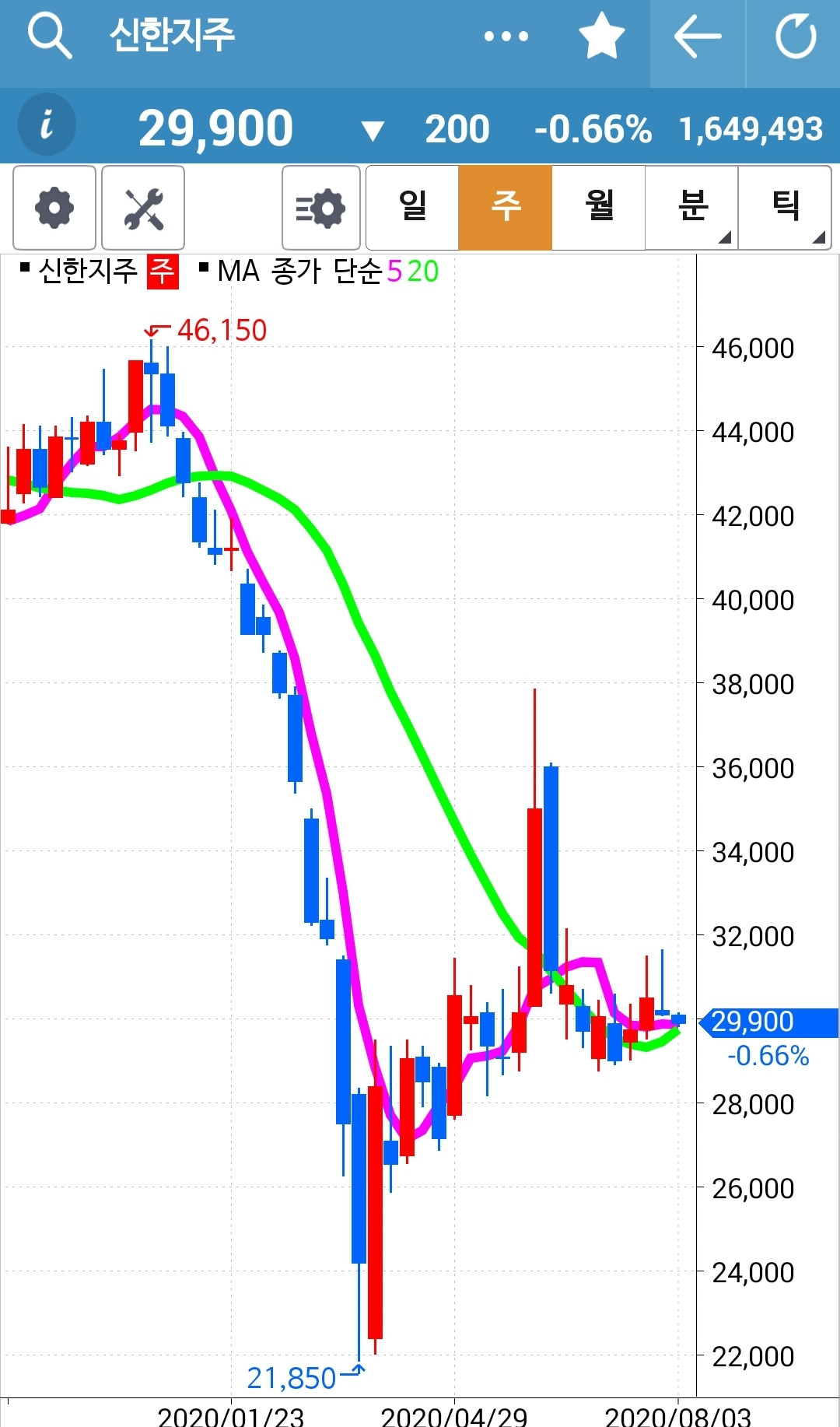 사진 1: 선물주식이다. LG전자와 삼성전자와 신한지주를 들고 있다. 아직 5일선이 20일선 뚫고 내려간 것은 없기 때문에 모두 매수 유지다.