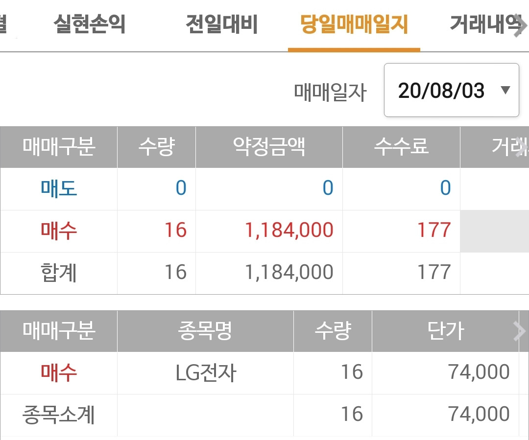 사진 3: 오늘 매매. 남은 돈 탈탈 털어 빵! 오른(너무 올라 사실 부담은 되지만 그래도! 올라가는 것에 따리 붙기로 한다.) LG전자를 사 넣은 모습이다.
