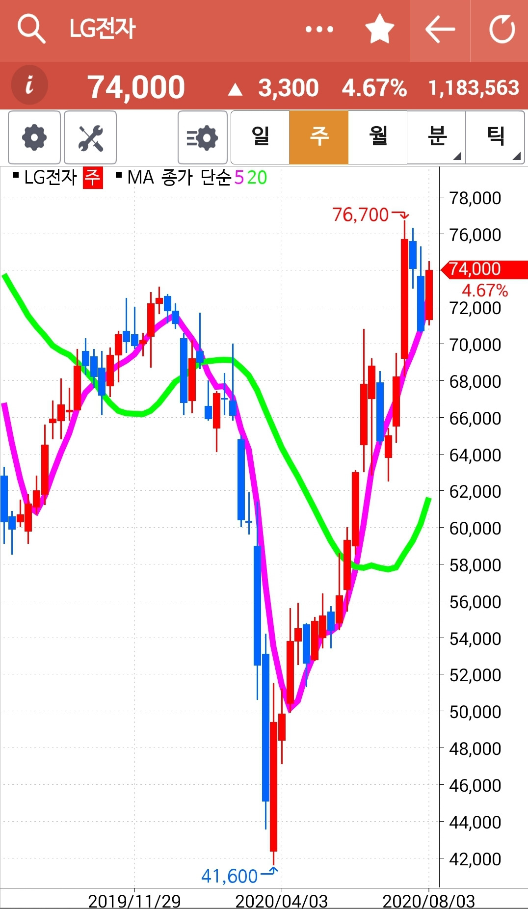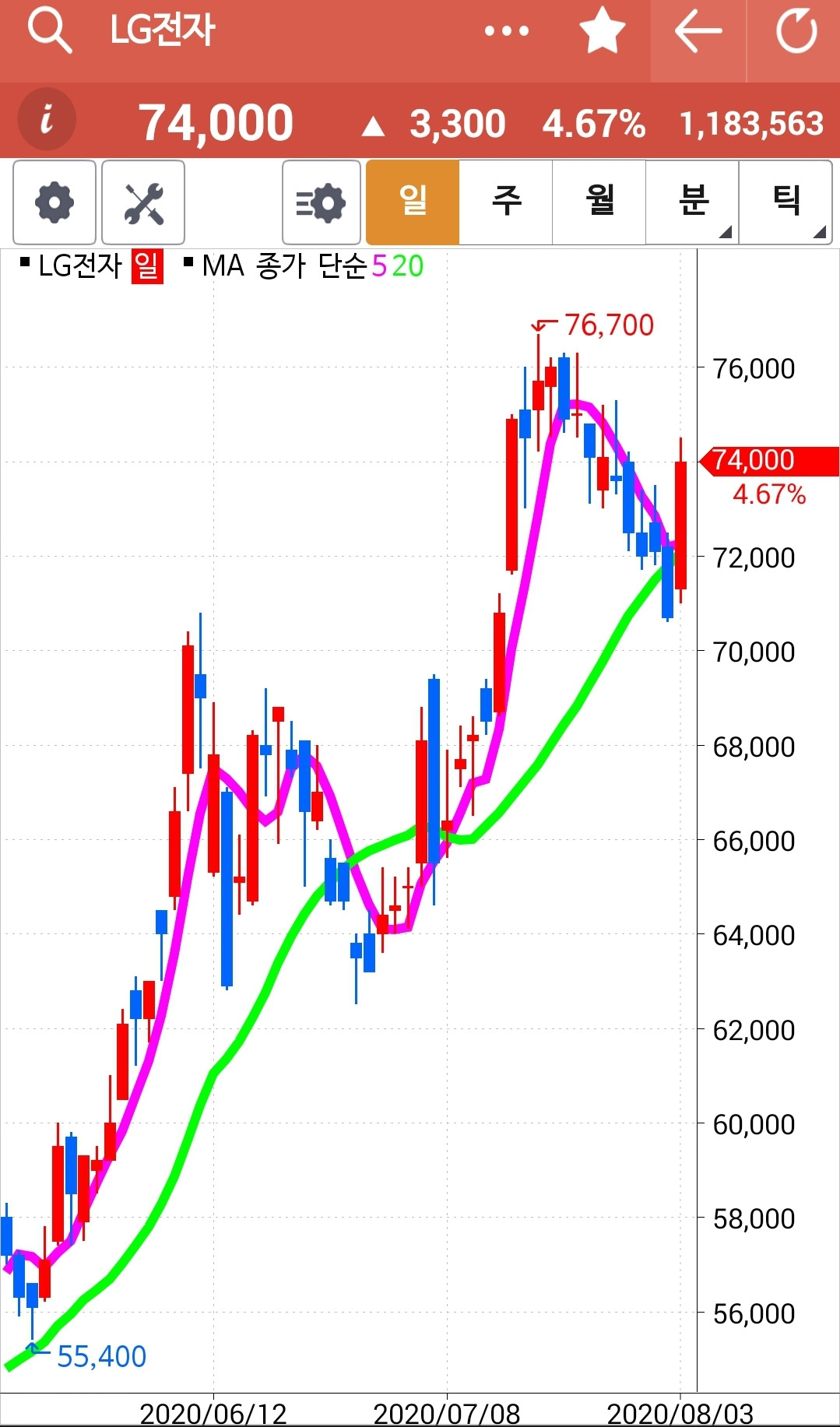 LG전자가 크게 올랐다. 나는 선물 주식에만 가지고 있지 현물 주식에는 안 가지고 있는 종목이다. 전날 현대모비스를 탈락시키고 현금으로 가지고 있던 것을 몽땅 힘차게 빵! 올라가는 LG전자에 투자했다. 그래! 이젠 내려가는 거 안 사. 빵! 힘차게 올라가는 것에 올라타리라. 파이팅!
