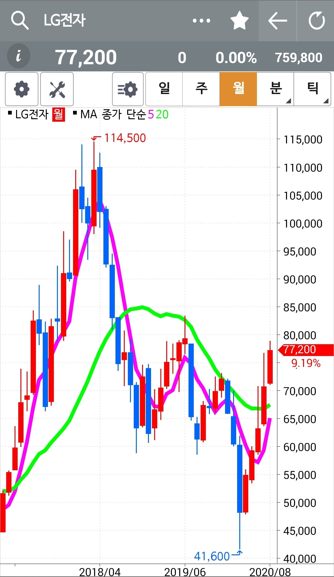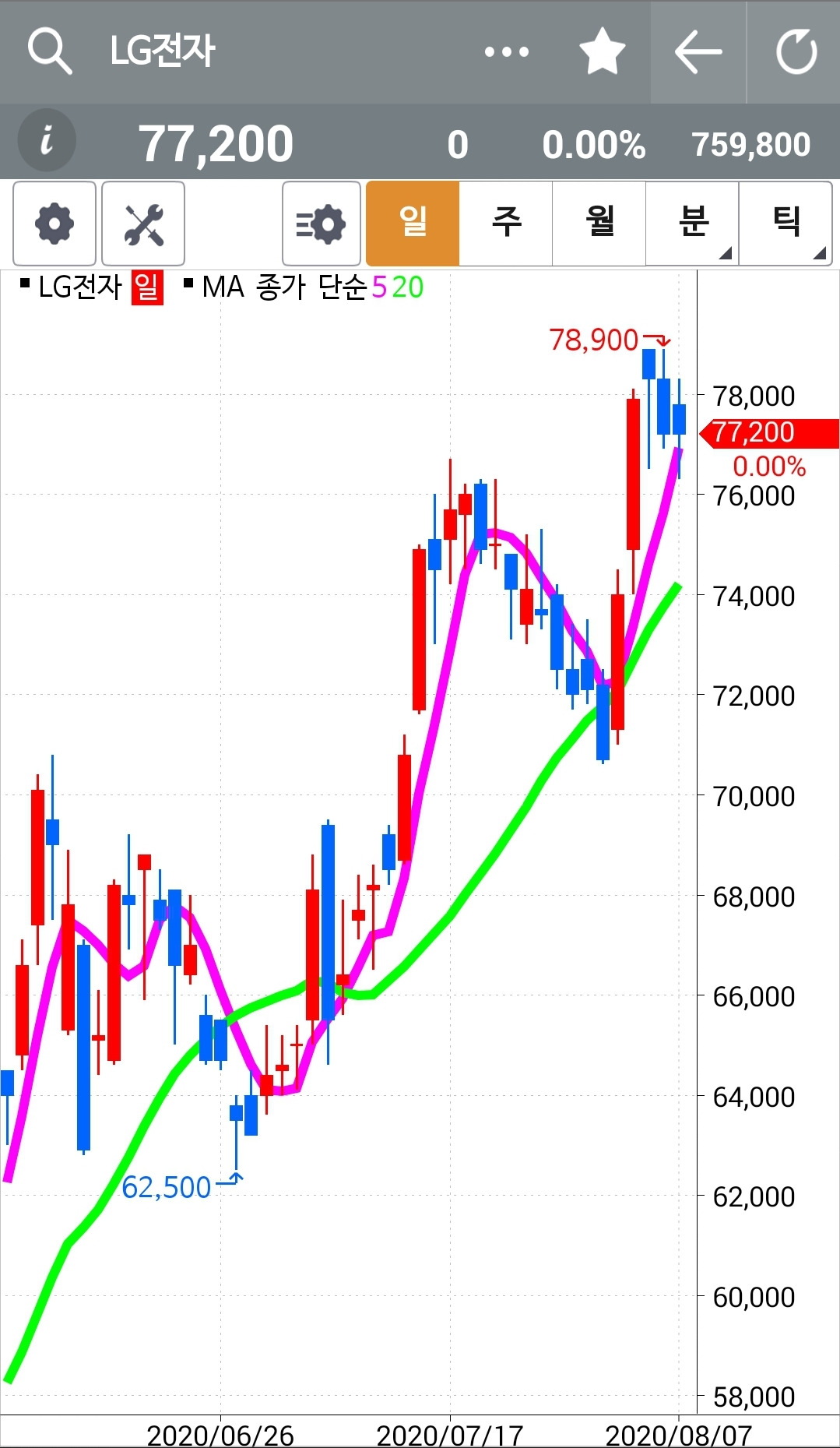 LG전자. 음봉이 자잘하게 나오고 있지만 역시 5일선이 20일선 위에 있으므로 걱정 노노노! 생존!