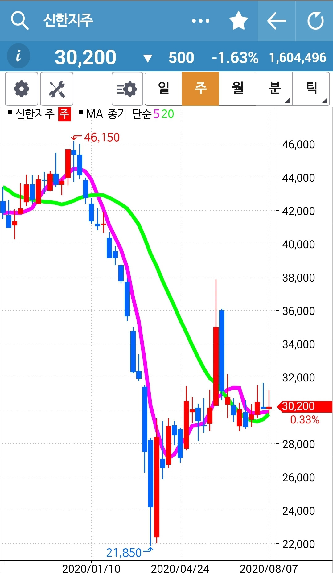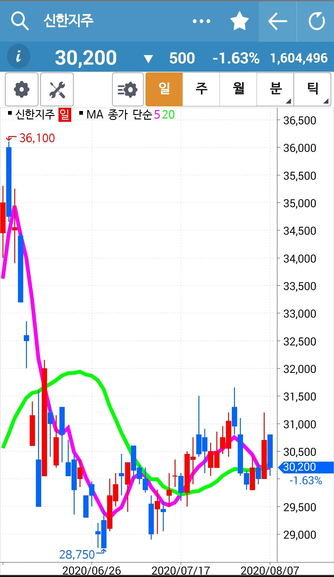 신한지주. 또 붙었다. 그러나 내려오지는 않았다. 다음 영업일에 올라가지 못하면 확실히 내려올 것이다. 그렇게 5일선이 20일선을 뚫고 내려가면 어김없이 탈락!이다. 흠. 좋은 말 할 때 파팍 올라가는 게 좋을 걸? 말 들어라~ 음하하하