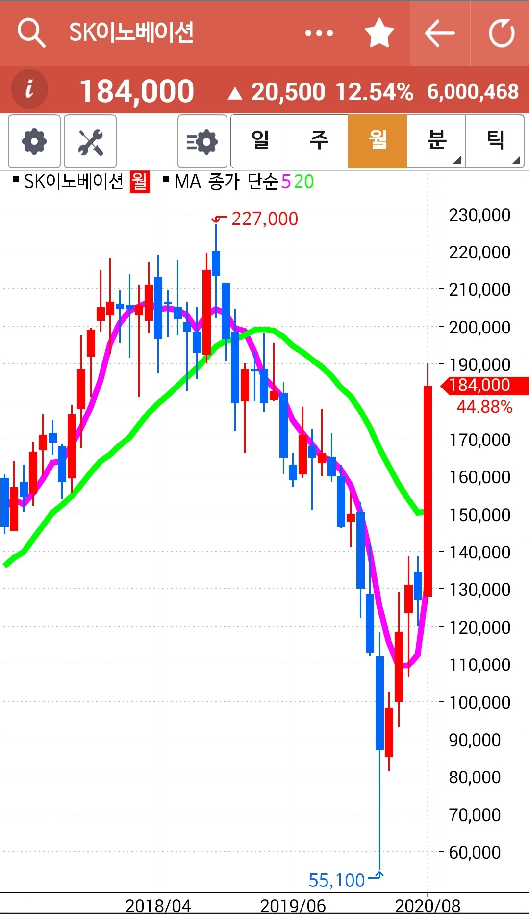 SK이노베이션. 짜잔~ 올라가려면 이 정도는 멋지게 올라가야지. 왔다 갔다 헤매더니 박스권을 뚫고는 그야말로 눈에 뵈는 게 없다. 푸하하하 파이팅!!!