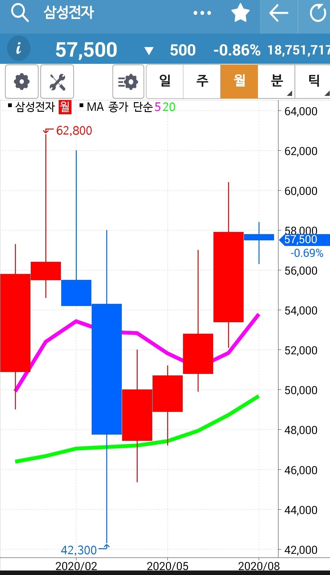 삼성전자. 힘차게 빵빵! 올라주면 좋겠는데. 그래도 모. 5일선이 20일선 위에 있으므로 생존!!!