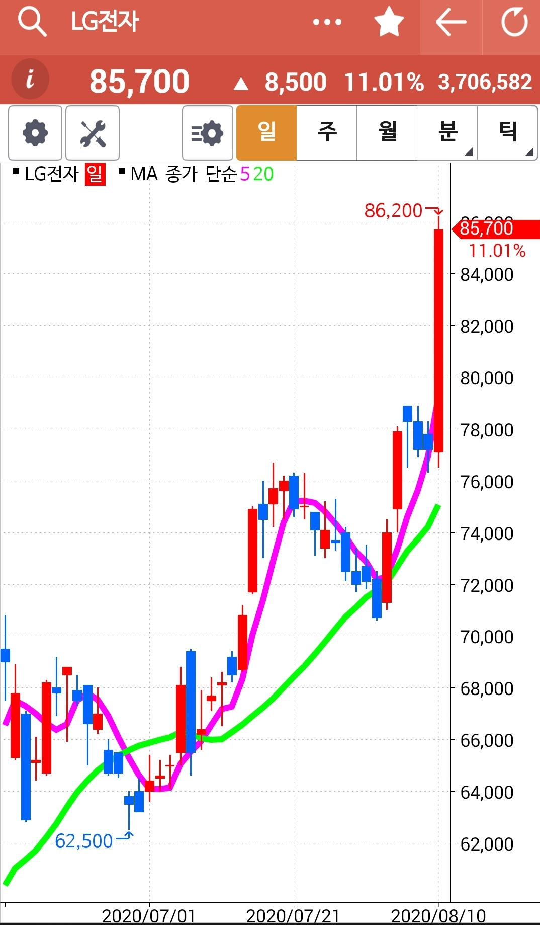 LG전자. 꺅~ 소리라도 지르고픈 심정. 푸하하하 약간 숨을 고르더니 세상에 빵! 빵빵!!! 힘차게 위로 솟구쳤다. 와우. 그렇다. 추세란 바로 이런 것. 어디 끝까지 따라가리라. 제발 20일선은 건들지 말고 가렴. 아무리 파란 음봉이 나오며 난리굿을 쳐도 내 눈 하나 끔쩍 않으리. 20일선 밑으로 5일선이 곤두박질치지 않는 한 나는 너와 함께 가리라. 암.