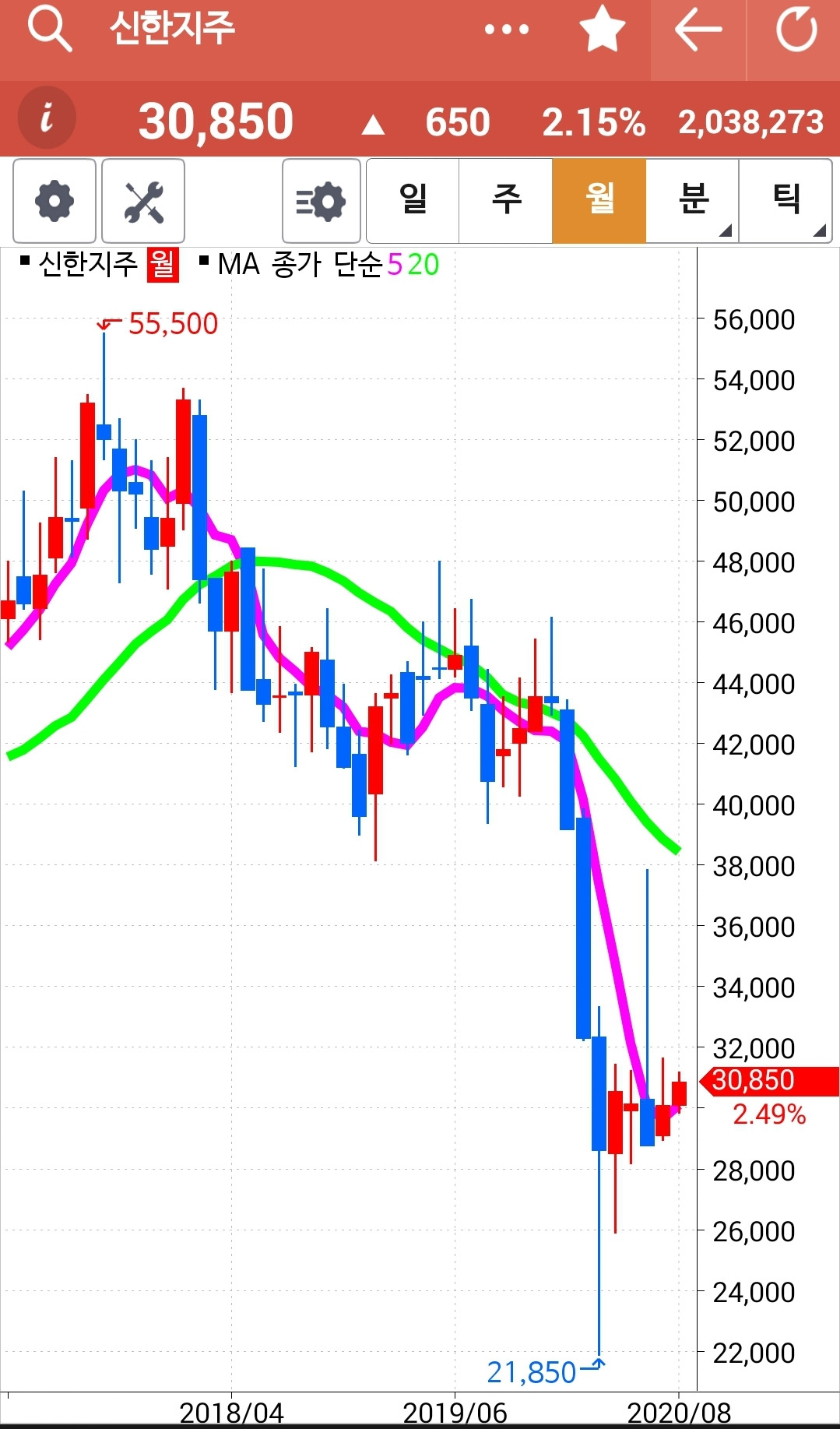 힘들게 힘들게 5일선이 20일선 뚫을 듯 말 듯 붙은 듯 안 붙은 듯 조마조마하게 하더니 오늘 작지만 양봉이 나왔다. 5일 선도 방향을 위로 살짝 튼다. 20일 선도 위로. 주봉에서도 살짝 위로 턴 하는 모습. 월봉은 아직 한참 내려가고 있는 중이니 그리 많은 힘은 내지 못하겠으나 그래도 5일선이 위에 있으므로 생존!!! 내 너를 지키리.