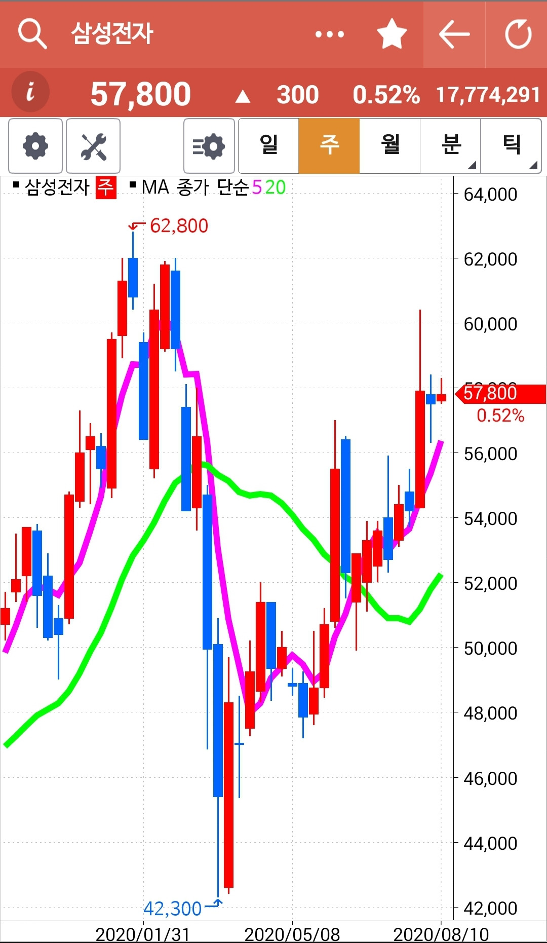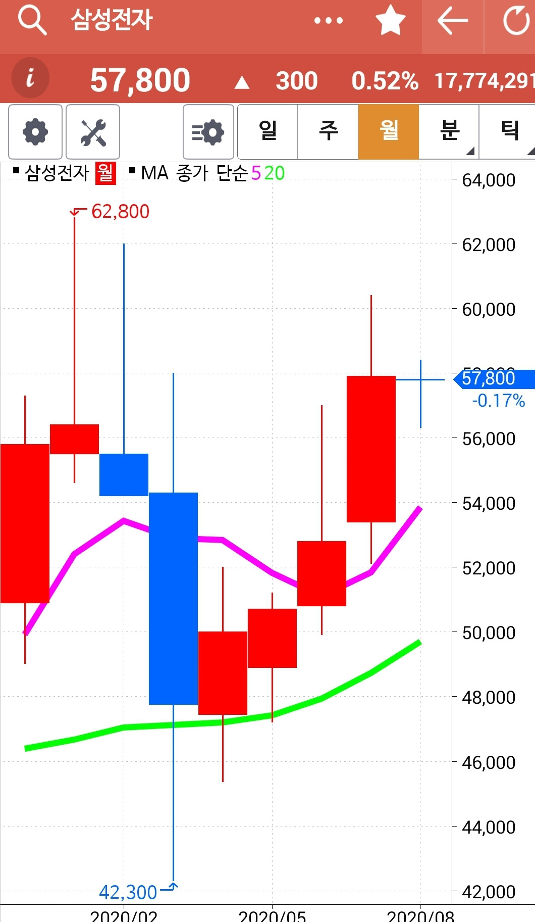 삼성전자. 힘을 좀 못쓰고는 있지만 일봉 주봉 월봉 모두 꽃분홍색인 5 이평선이 연두색인 20 이평선 위에 있는데 무어 걱정이람. 어서 힘을 내서 쭉쭉 올라가렴. 파이팅!!!