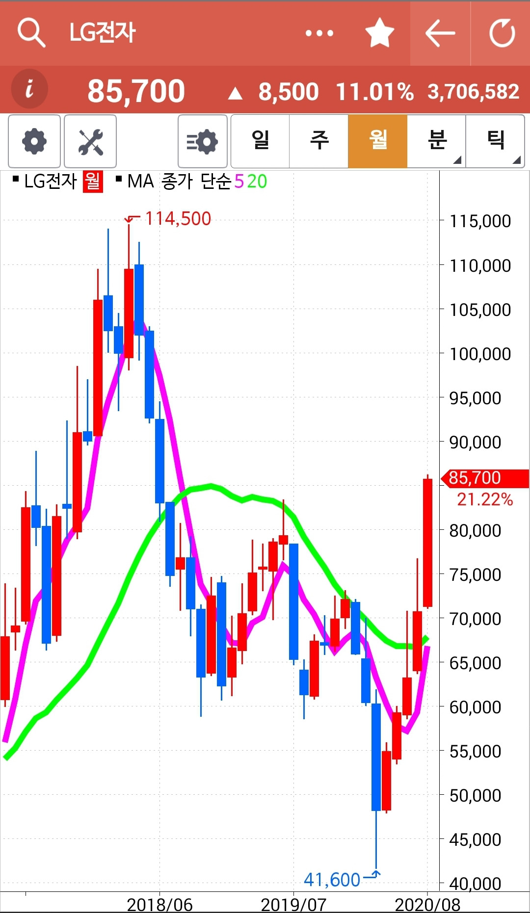 호홋 신난다. LG전자 그야말로 빵빵~ 뛰 뛰 빵빵이다. 푸하하하. 내가 한 거라곤 오로지 딱 하나. 원칙 지키기! 그런데 모든 게 수익으로 돌아섰다. 그치. 바로 이거야. 여기서 또 동생들의 '언니~ 수익은 챙기고 보세요~' 하는 외침이 생각났으니 '그럴까? 수익을 좀 챙길까?' 하는 생각이 잠깐 났으나 '노노노!' 비록 수익을 많이 못 챙길지언정 빵빵 올라가고 있는 놈을 딱 잘라내는 것 따위 난 못한다. 갈 때까지 가는 거다. 그리고 그 애가 힘이 다 해 지쳐서 내려올 때 그때도 기다려주리라. 그러다 너무 힘이 빠져 20일선까지 뚫고 내려간다면 그땐 어쩔 수 없다. 미련 없이 보내주리라. 그 전엔 내가 꼭 품어줄 테니 맘껏 뛰어놀렴. 파이팅!!!