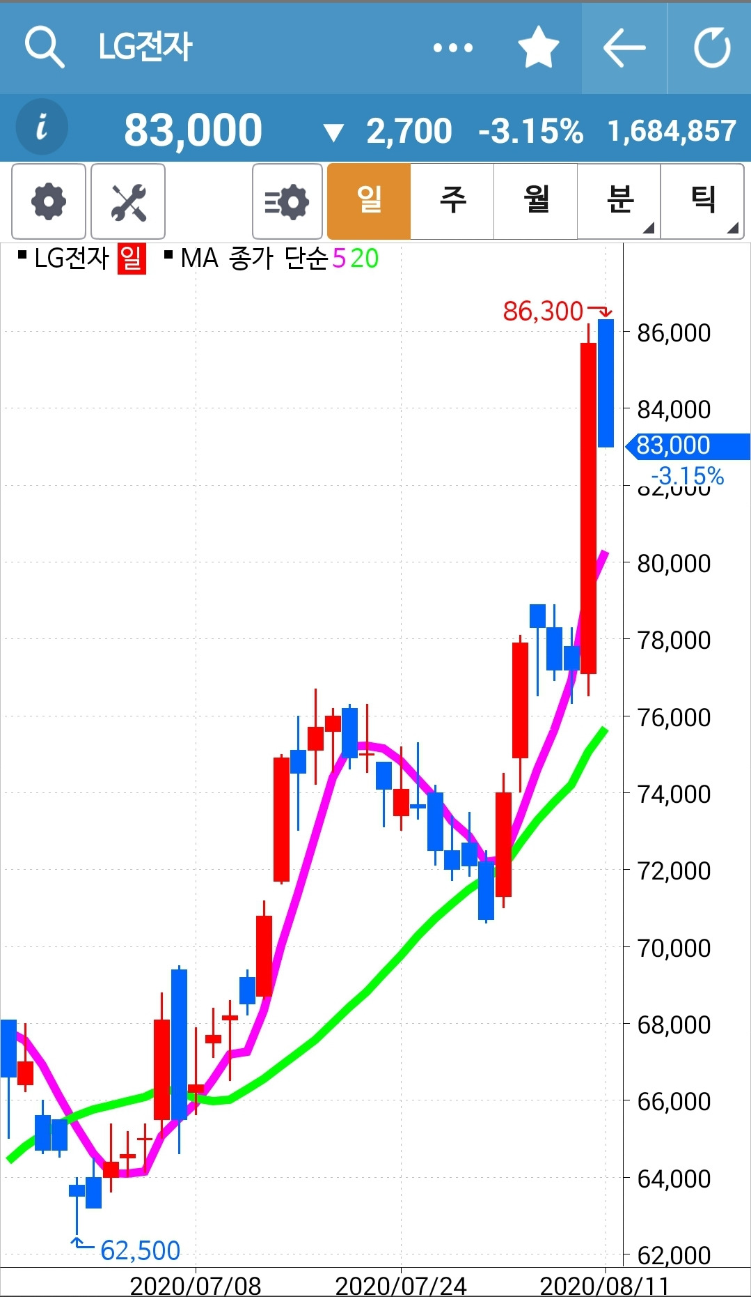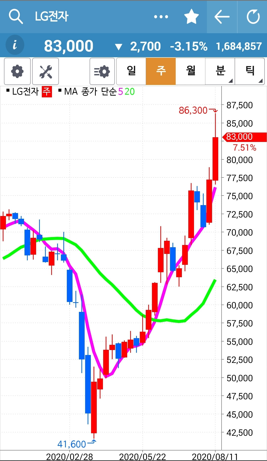 LG전자. 고점도 높인 상황에서 저런 정도의 조정은 모. 그래. 파이팅. 주봉도 위로 월봉도 위로 모두 위로 향하고 있는 그림. 걱정을 말자.