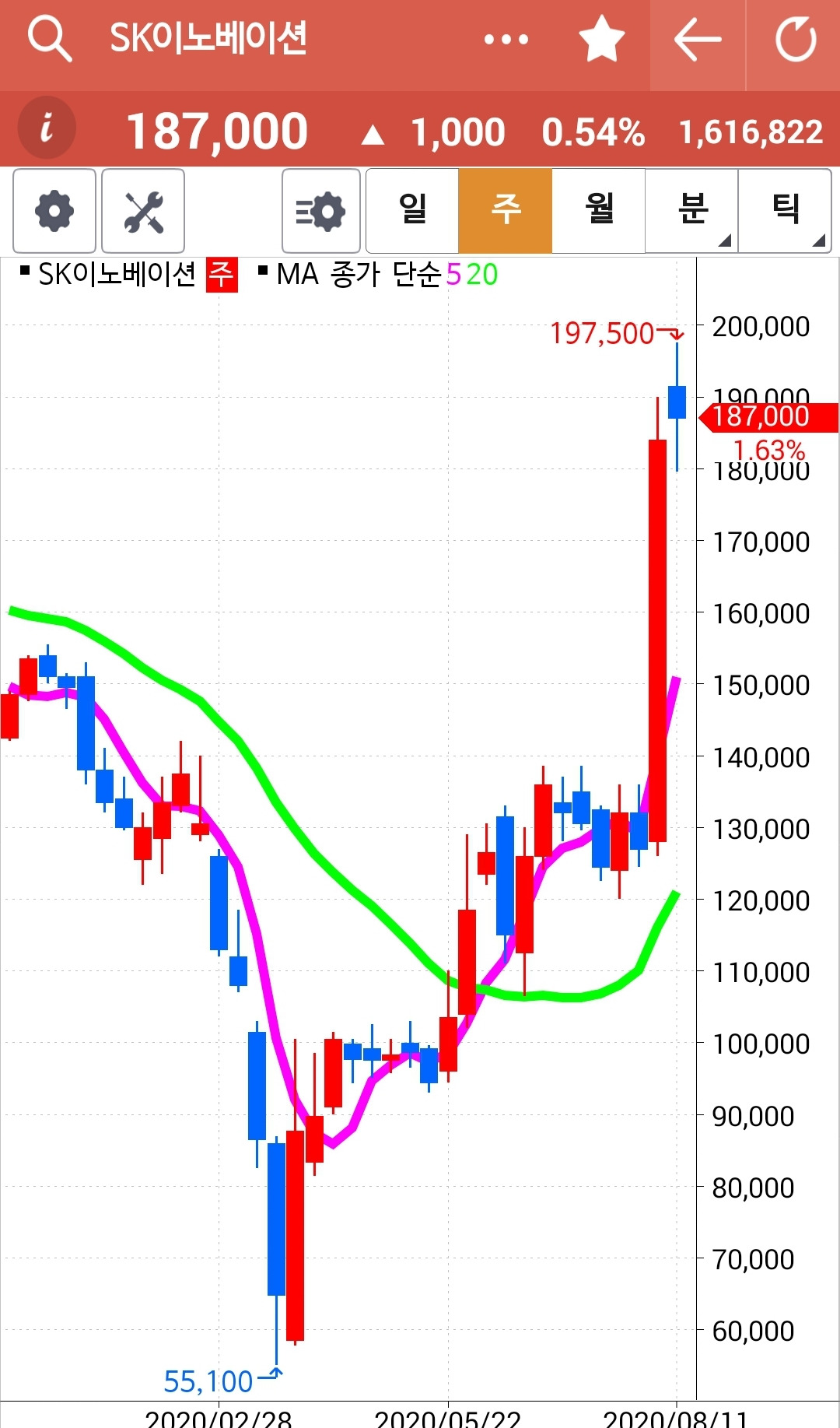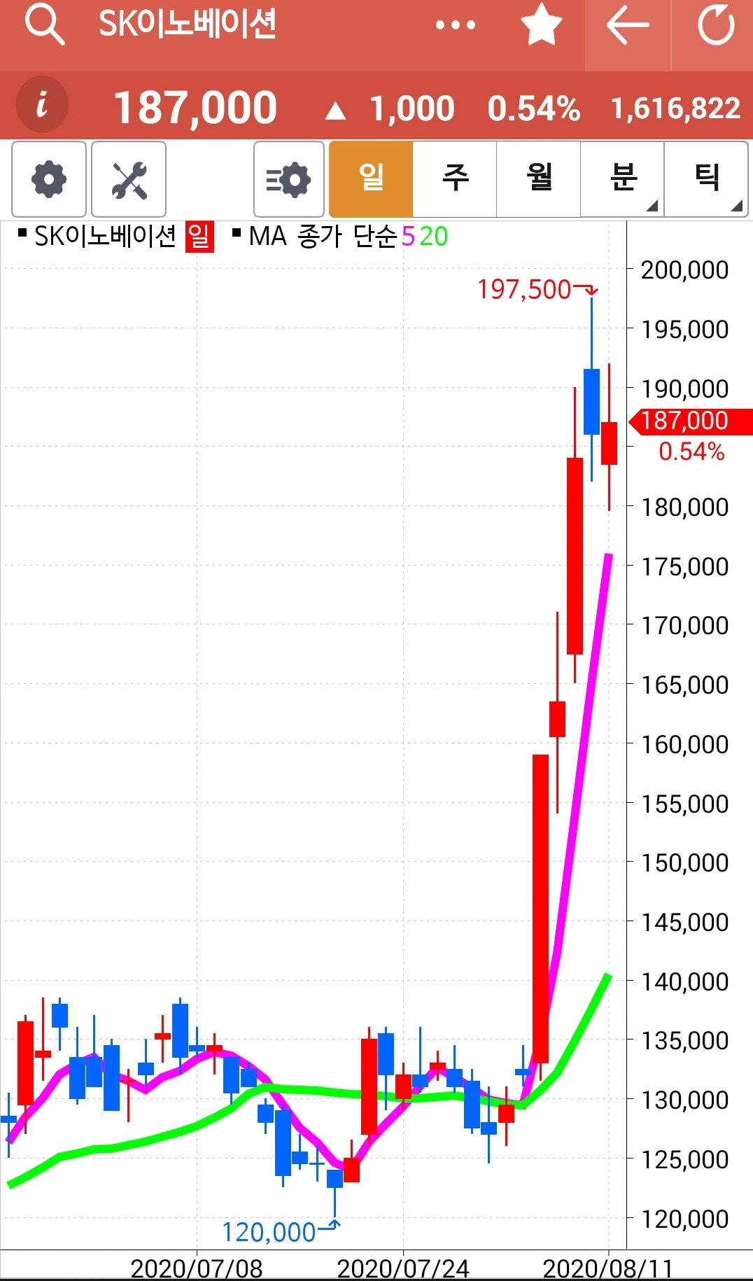 SK이노베이션. 주봉 월봉 쭉쭉 뻗은 긴 장대양봉. 좋다. 일봉이 너무 올라 좀 쉬어가기로 했나 보다. 그럼, 쉬엄쉬엄 가야지. 그래야 튼튼하게 뻗어나갈 수 있지. 맘껏 쉬어가렴. 내 곁에서 지켜주리라. 파이팅.